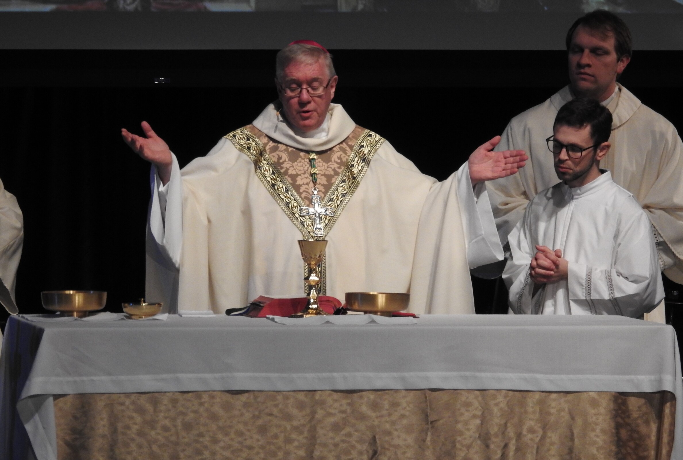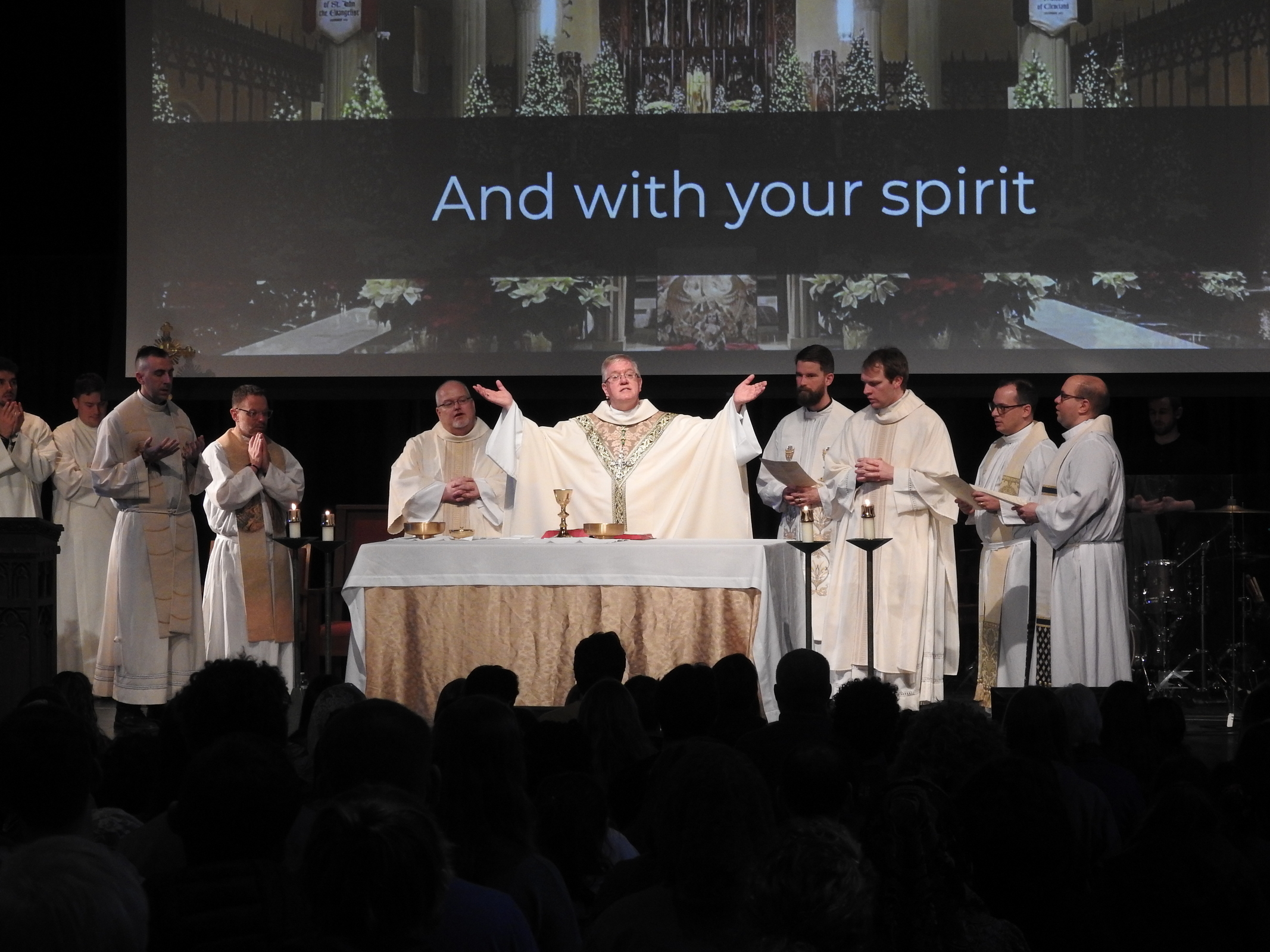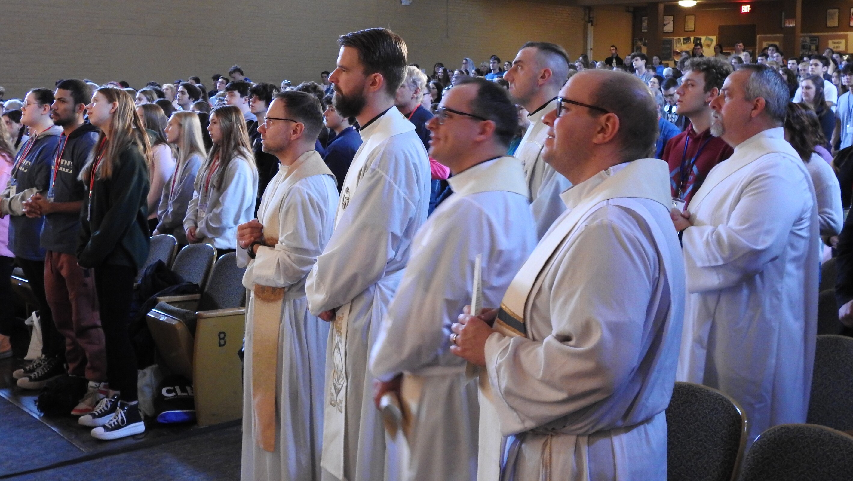 Auxiliary Bishop Michael Woost celebrated the Sunday vigil Mass in Kulas Auditorium. Concelebrants were Father Ference, Father Mann, Father Eric Garris, diocesan vocation director, Father Josh Cochrac, parochial vicar at St. Charles Borromeo Parish in Parma and chaplain at Holy Name High School in Parma Heights, and Father David Chojnacki, parochial vicar at St. Mary of the Immaculate Conception Parish in Wooster.