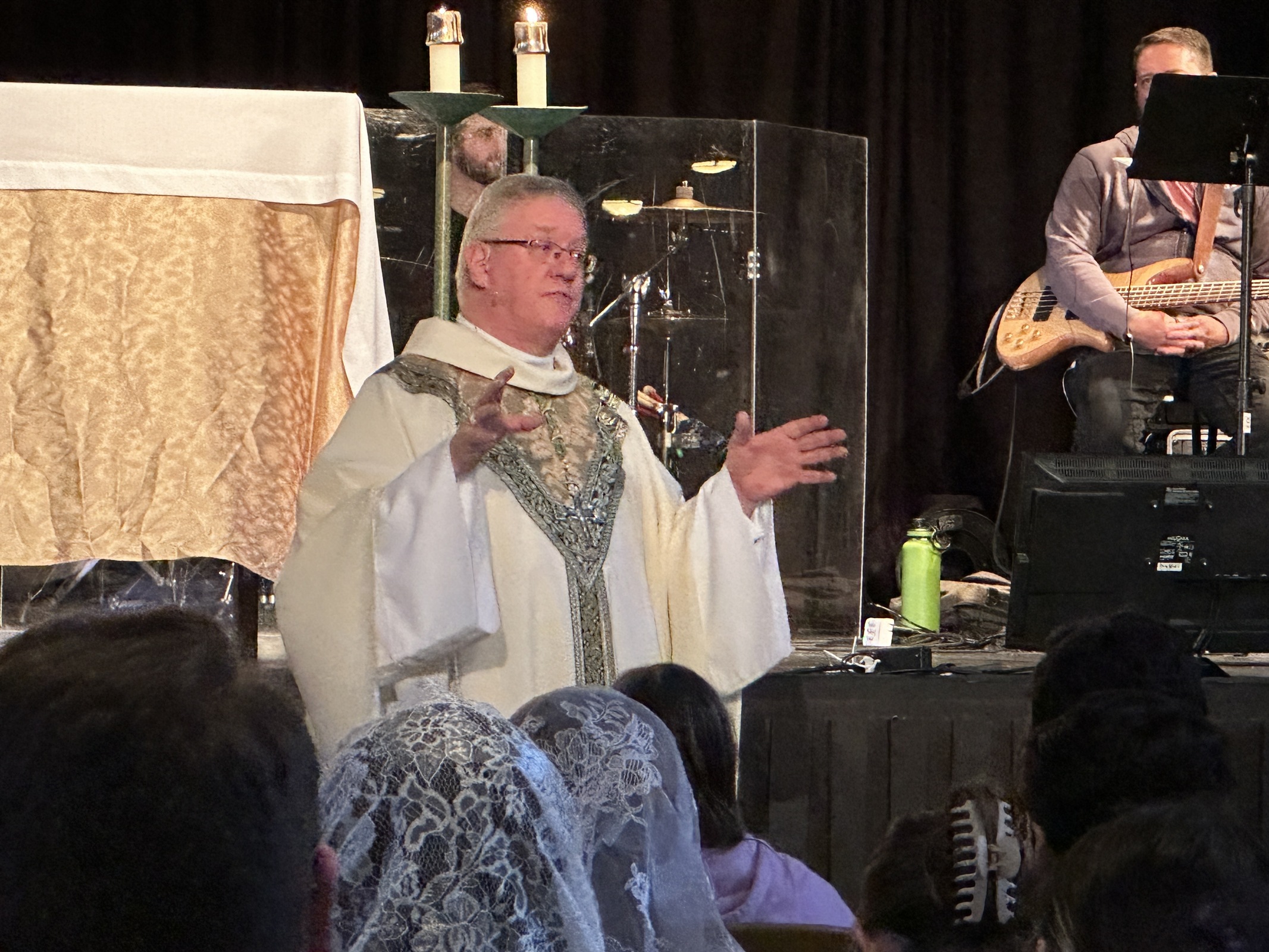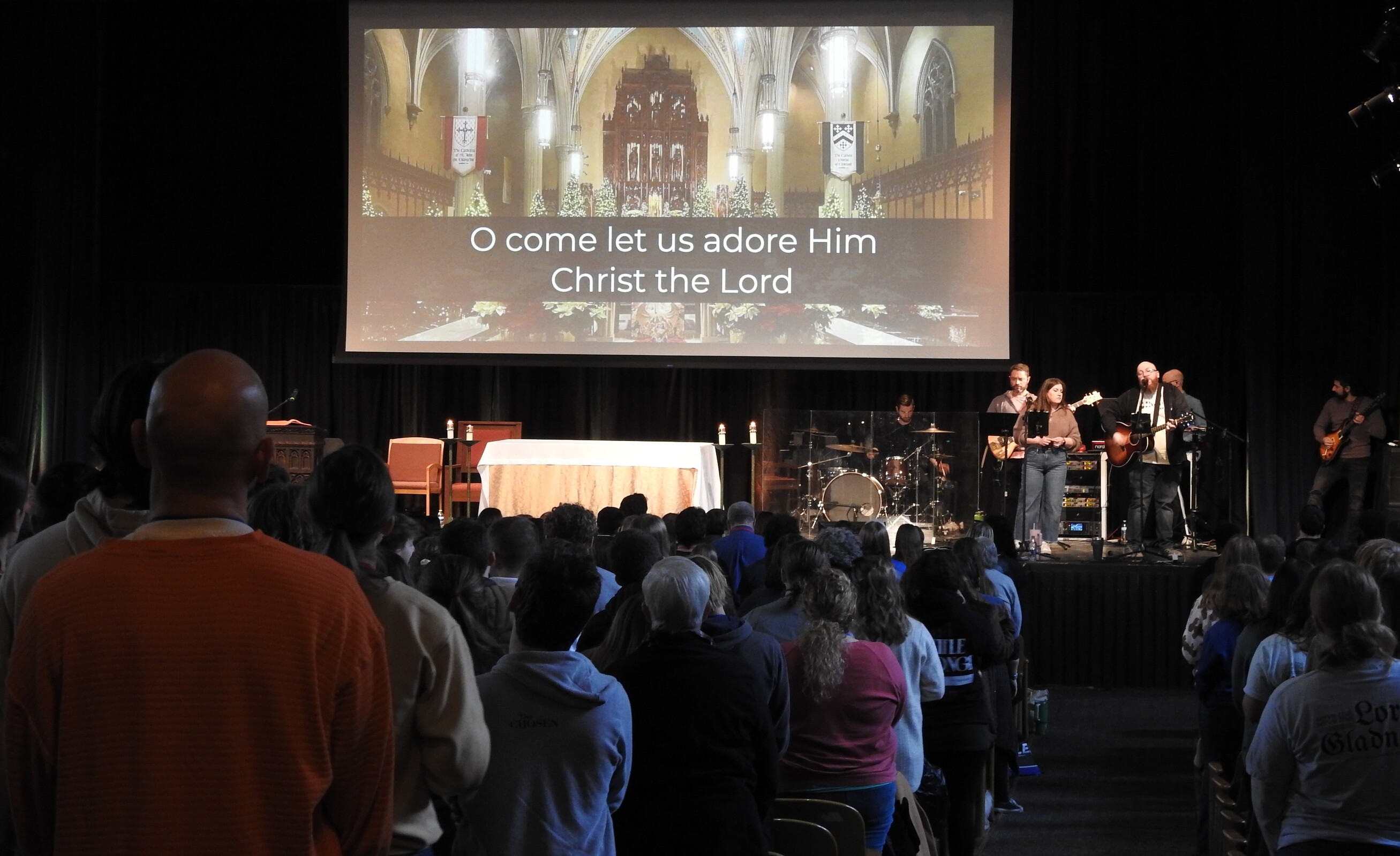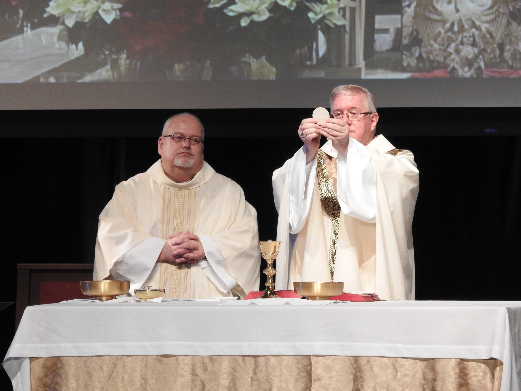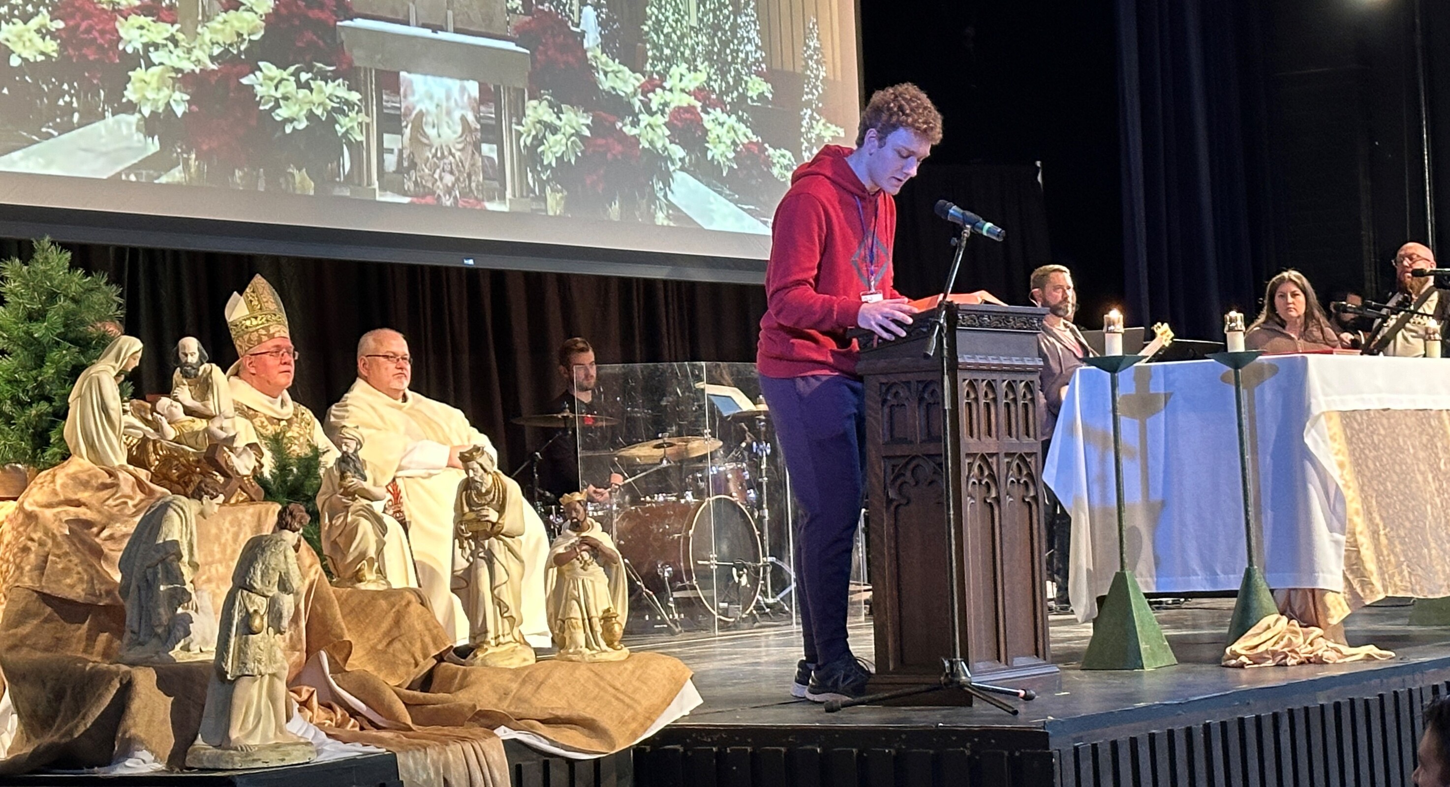 Auxiliary Bishop Michael Woost celebrated the Sunday vigil Mass in Kulas Auditorium. Concelebrants were Father Ference, Father Mann, Father Eric Garris, diocesan vocation director, Father Josh Cochrac, parochial vicar at St. Charles Borromeo Parish in Parma and chaplain at Holy Name High School in Parma Heights, and Father David Chojnacki, parochial vicar at St. Mary of the Immaculate Conception Parish in Wooster.