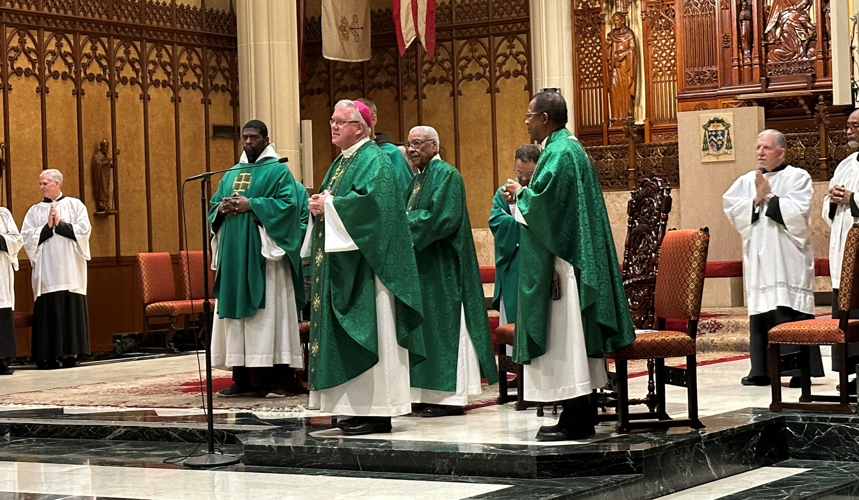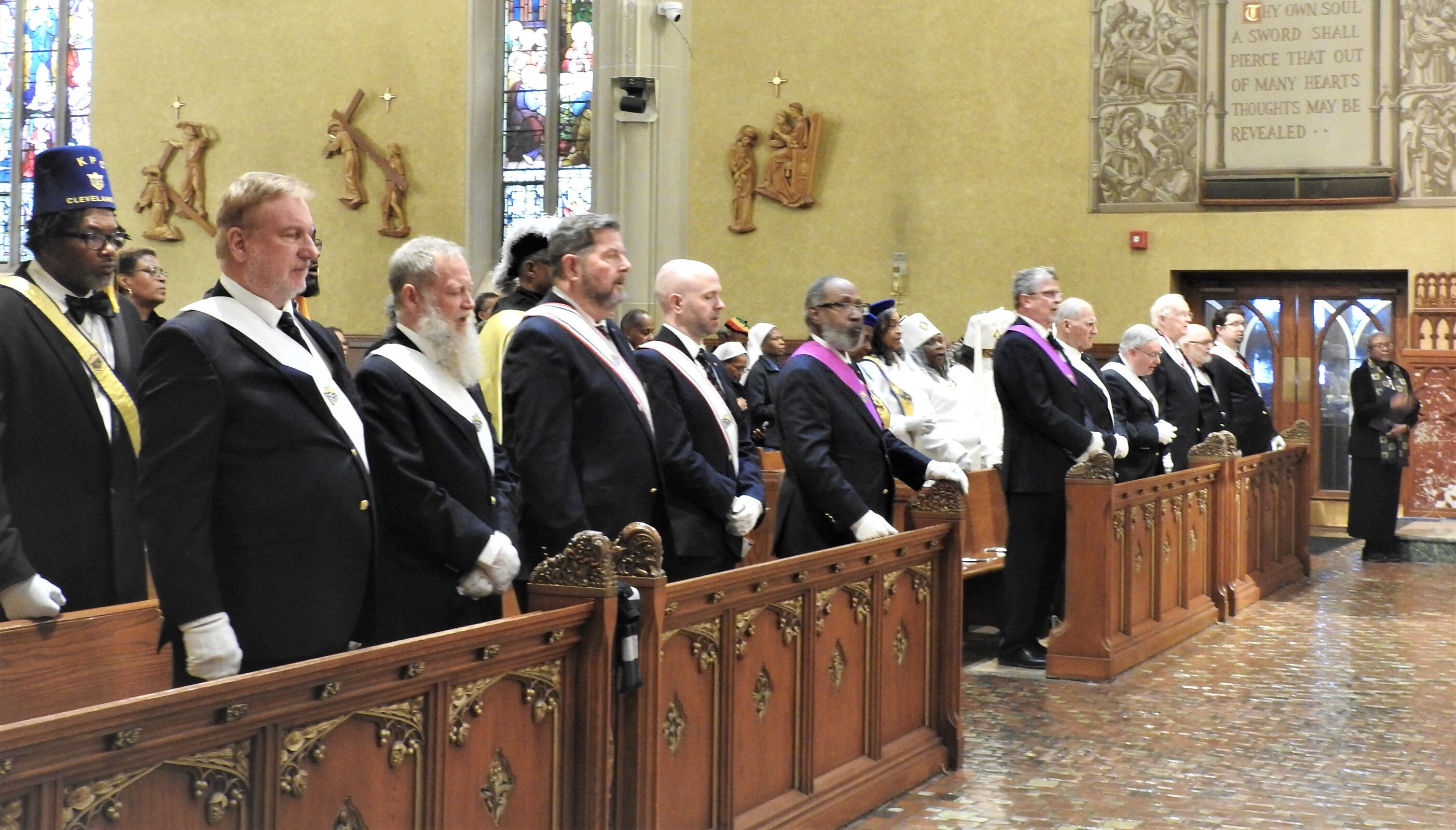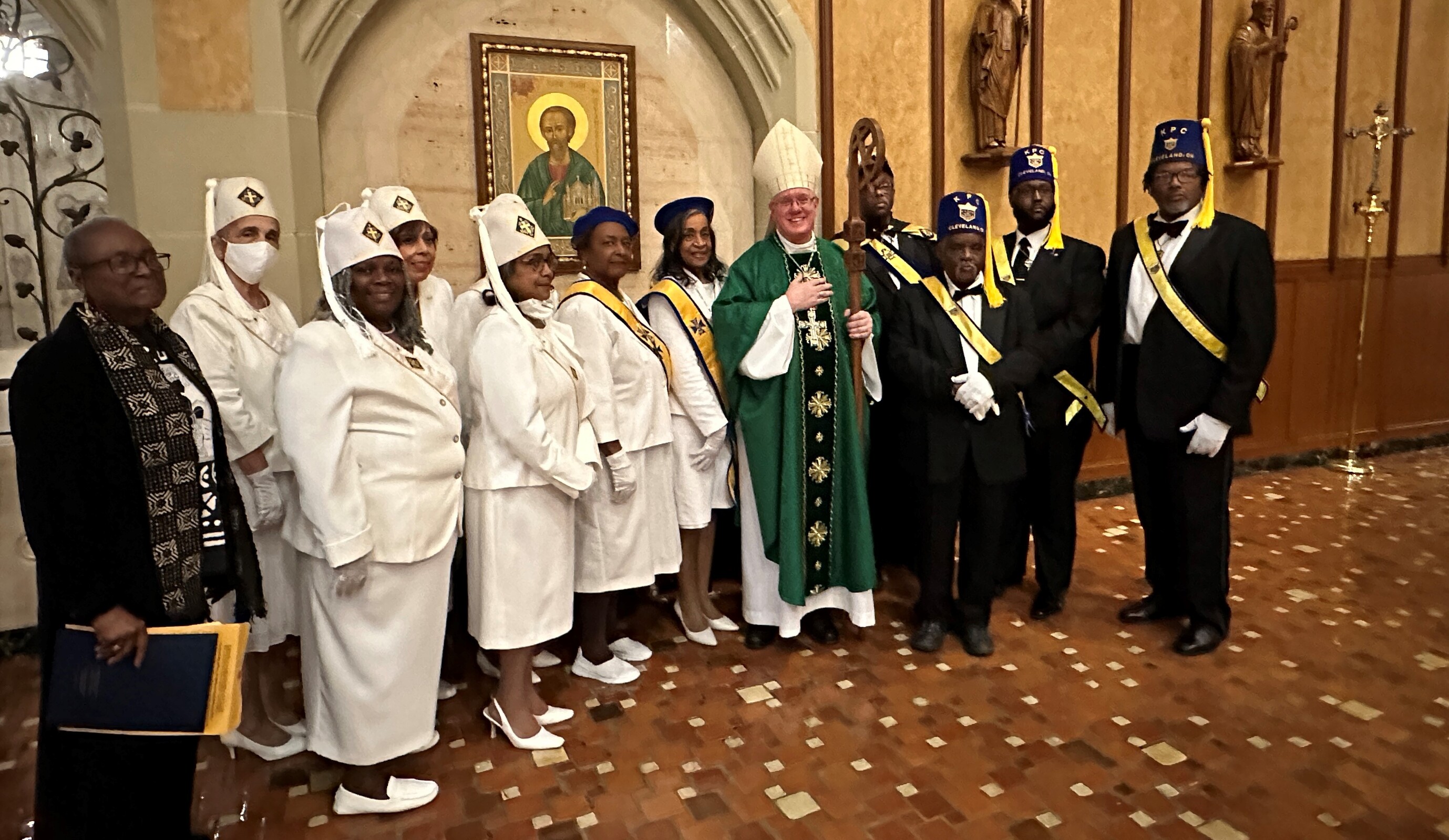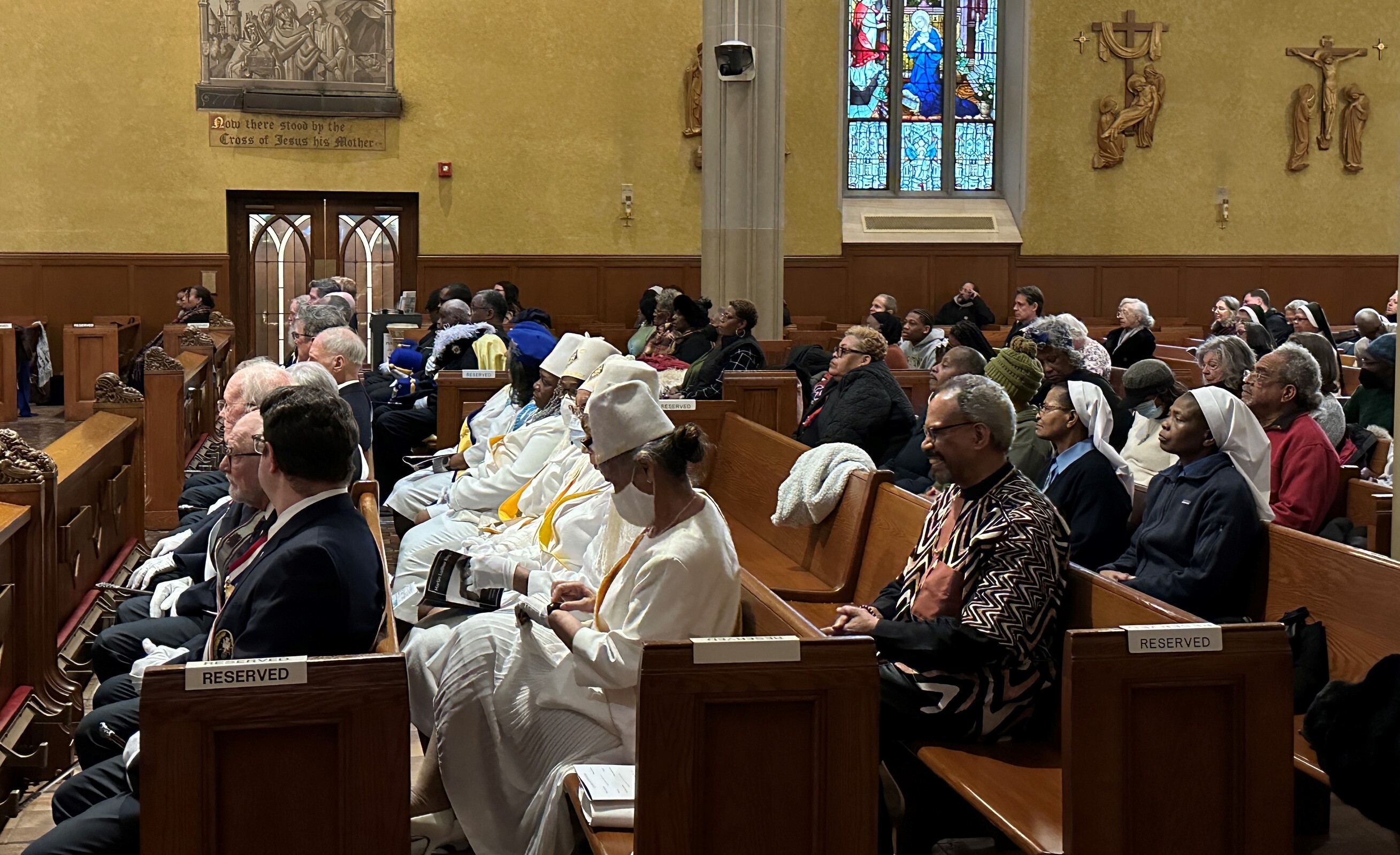 Adding to the solemnity of the liturgy were members of the Knights of Peter Claver and the Ladies Auxiliary and the Knights of Columbus. The 114-year-old Knights of Peter Claver is the nation’s only African American Catholic fraternal organization and the world’s largest historically Black Catholic lay organization. They were in formal dress including white shirts, ties, capes and hats while the women wore white dresses or suits and a sash. The Knights of Columbus wore their traditional blazers, white shirts, ties, sashes and berets.