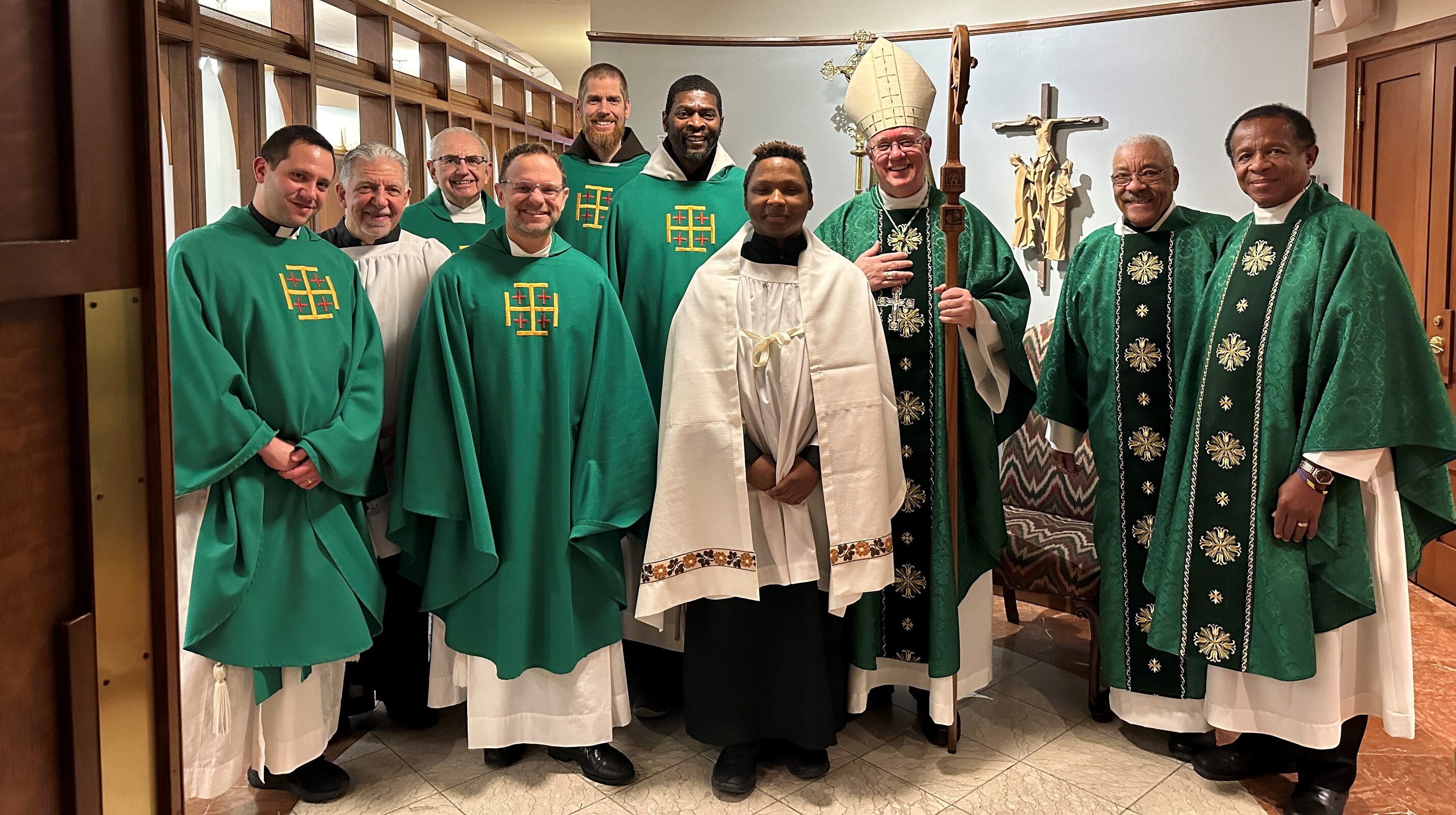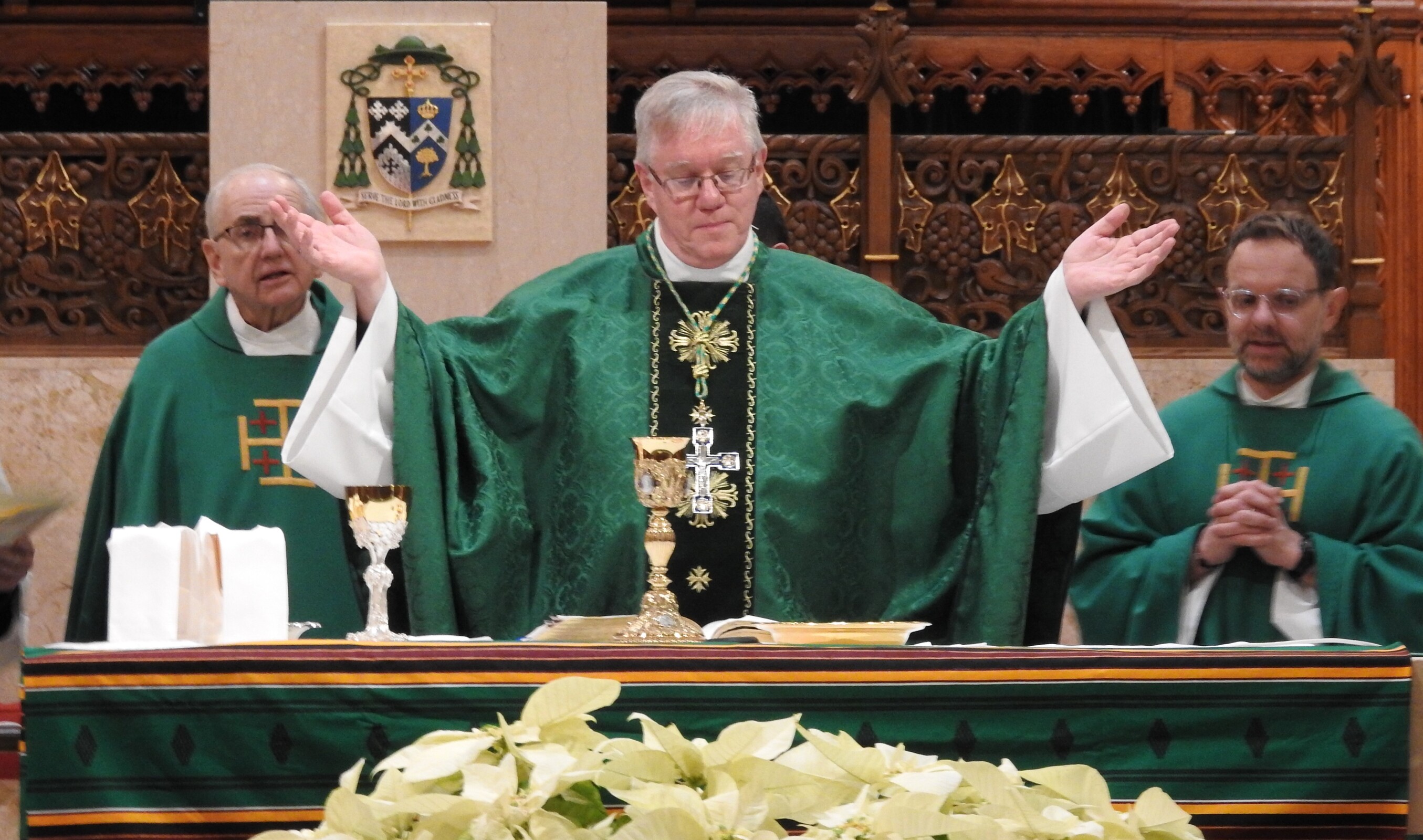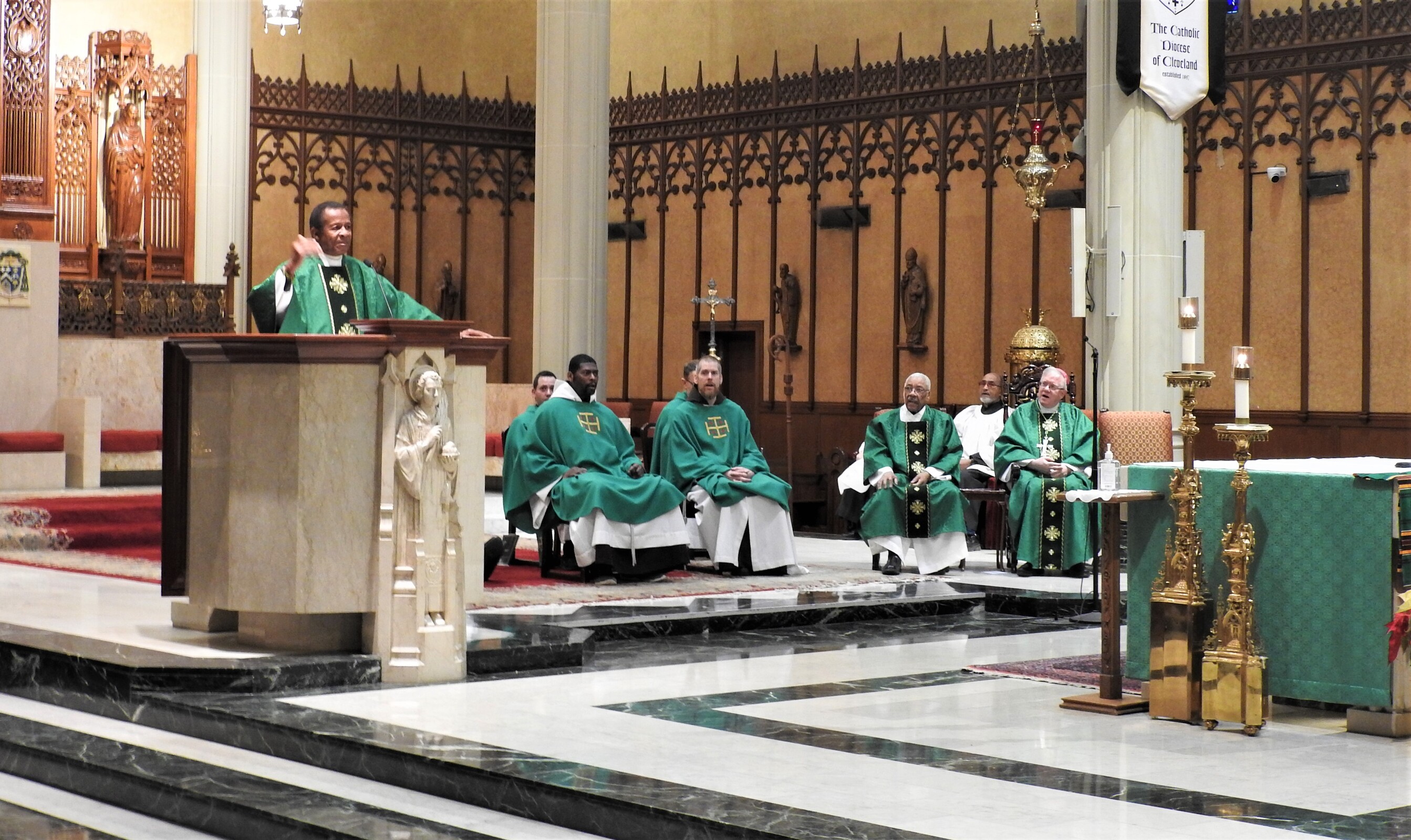 Father John Judie, a retired priest from the Archdiocese of Louisville, Kentucky was the homilist. He joined five other diocesan priests – Father Damian Ference, vicar for evangelization and head of the Office of Parish Life and Special Ministries; Father James Watson, OFM Cap, pastor of St. Agnes/Our Lady of Fatima Parish in Cleveland; Father David Domanski, OFM Cap, administrator of Holy Spirit Parish in Garfield Heights; Father Anthony Simone, presbyteral moderator of St. Aloysius-St. Agatha Parish in Cleveland; and Father Joe Hilinski, delegate for ecumenical and interfaith affairs and pastor of St. Barbara Parish in Cleveland – as concelebrants. Deacon Hardin Martin of St. Agnes/Our Lady of Fatima assisted and Deacon Bruce Battista of Holy Rosary Parish in Cleveland was the master of ceremonies for Bishop Woost.