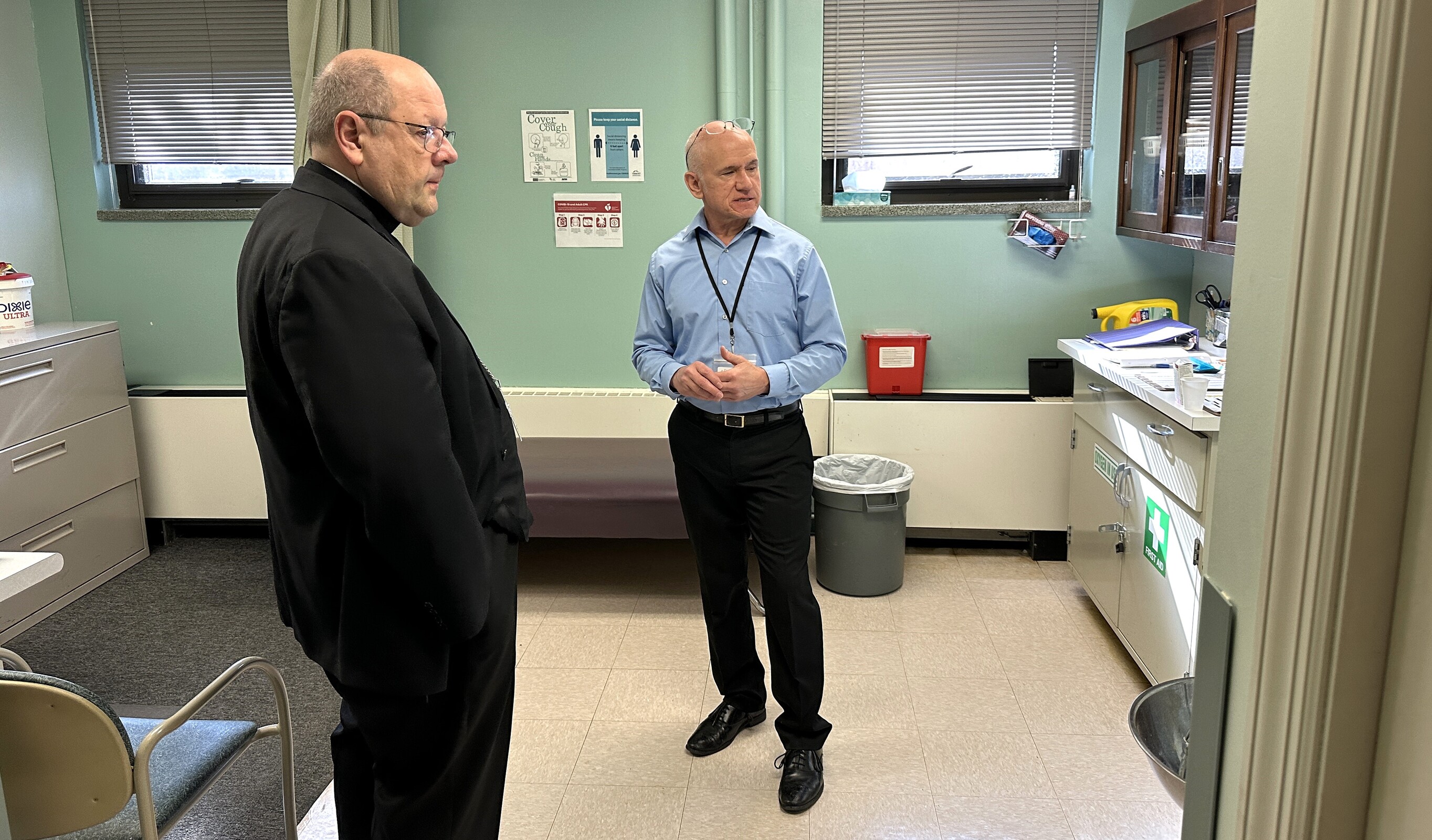 Jim Mazzaganti, longtime director of the adult day program, explained the operation to the bishop. He said the pandemic shutdown had a lasting effect on the program, which is rebuilding. The program took over the first floor of the building for various programming and meals. Participants can attend weekday sessions from about 8 a.m. to 4 p.m.