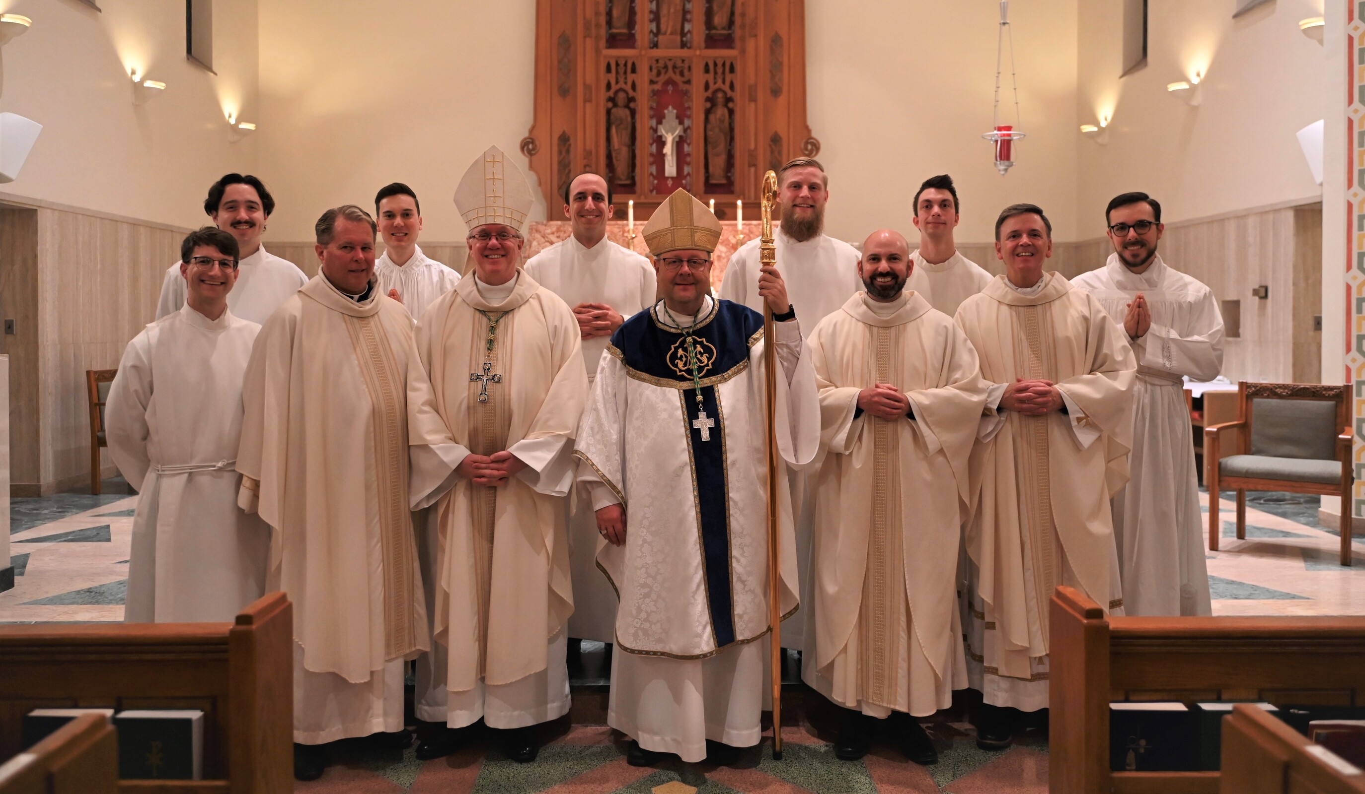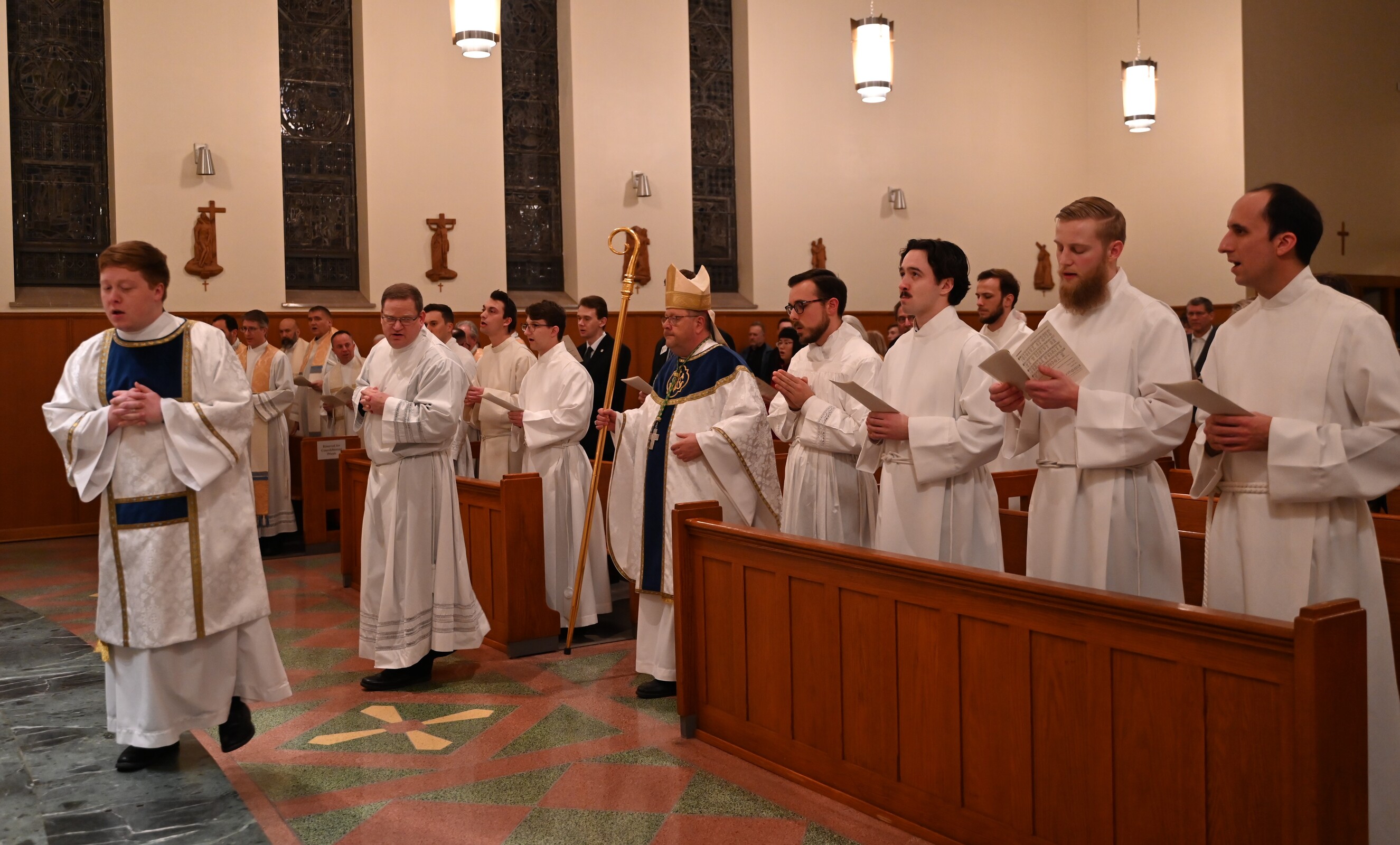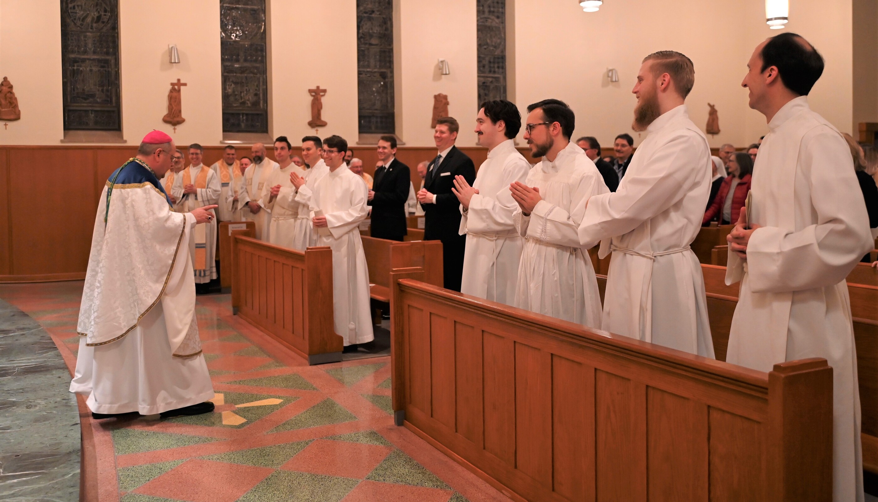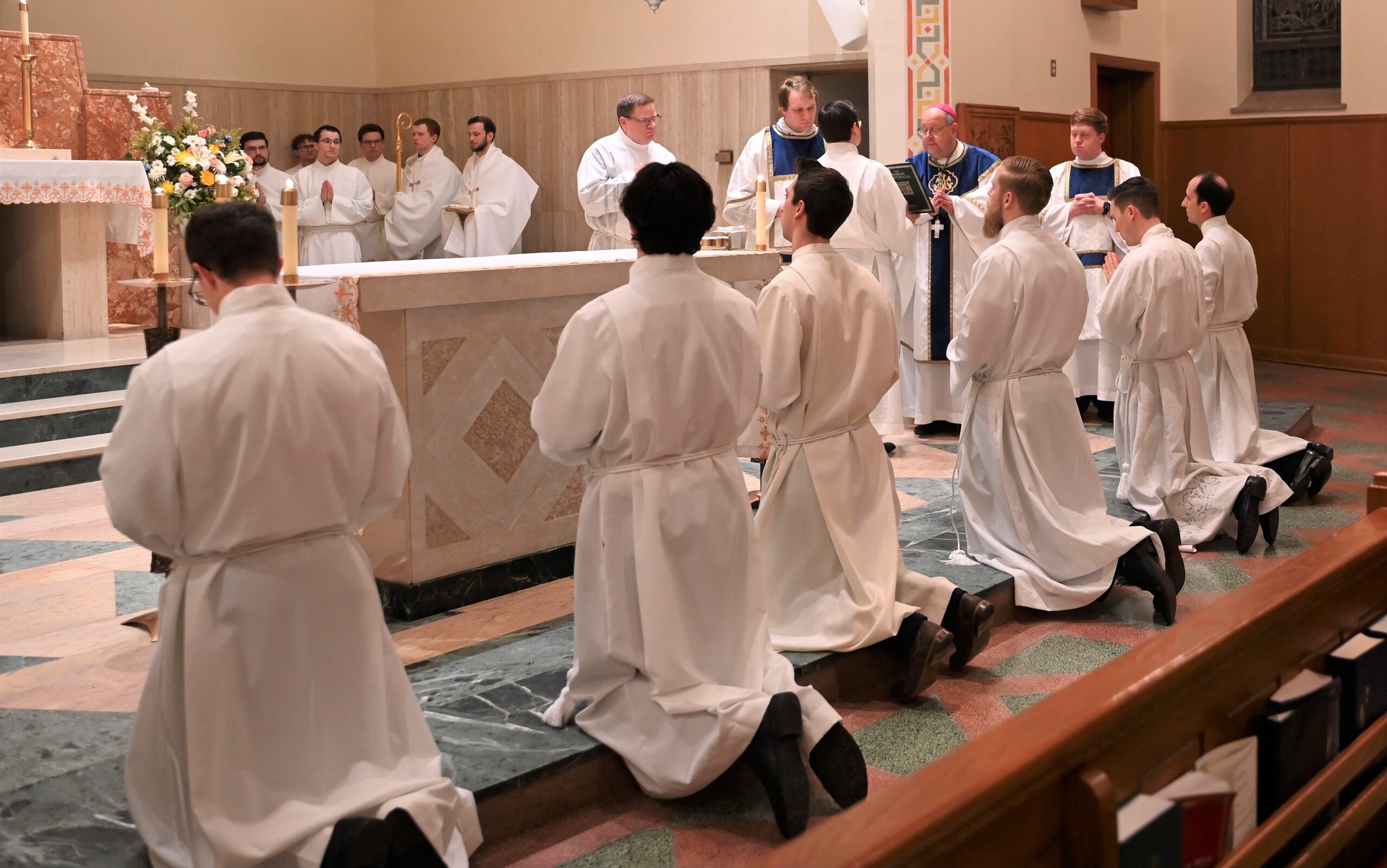 During a liturgy on Feb. 9 in Sacred Heart Chapel at the Center for Pastoral Leadership, seven Saint Mary seminarians took another step in their formation for the priesthood when Bishop Edward Malesic instituted them in the ministry of acolyte.