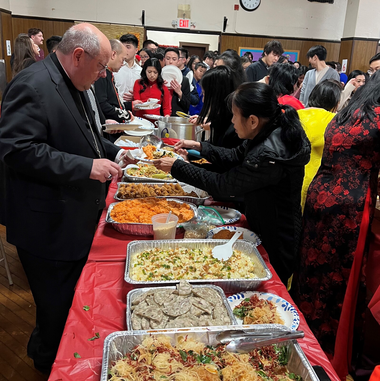 After Mass, he posed for photos with some of the community who were wearing native Vietnamese dress, including ao dai – long, split tunics worn over trousers – and traditional headpieces. Then bishop also enjoyed a variety of homemade, traditional foods and entertainment.