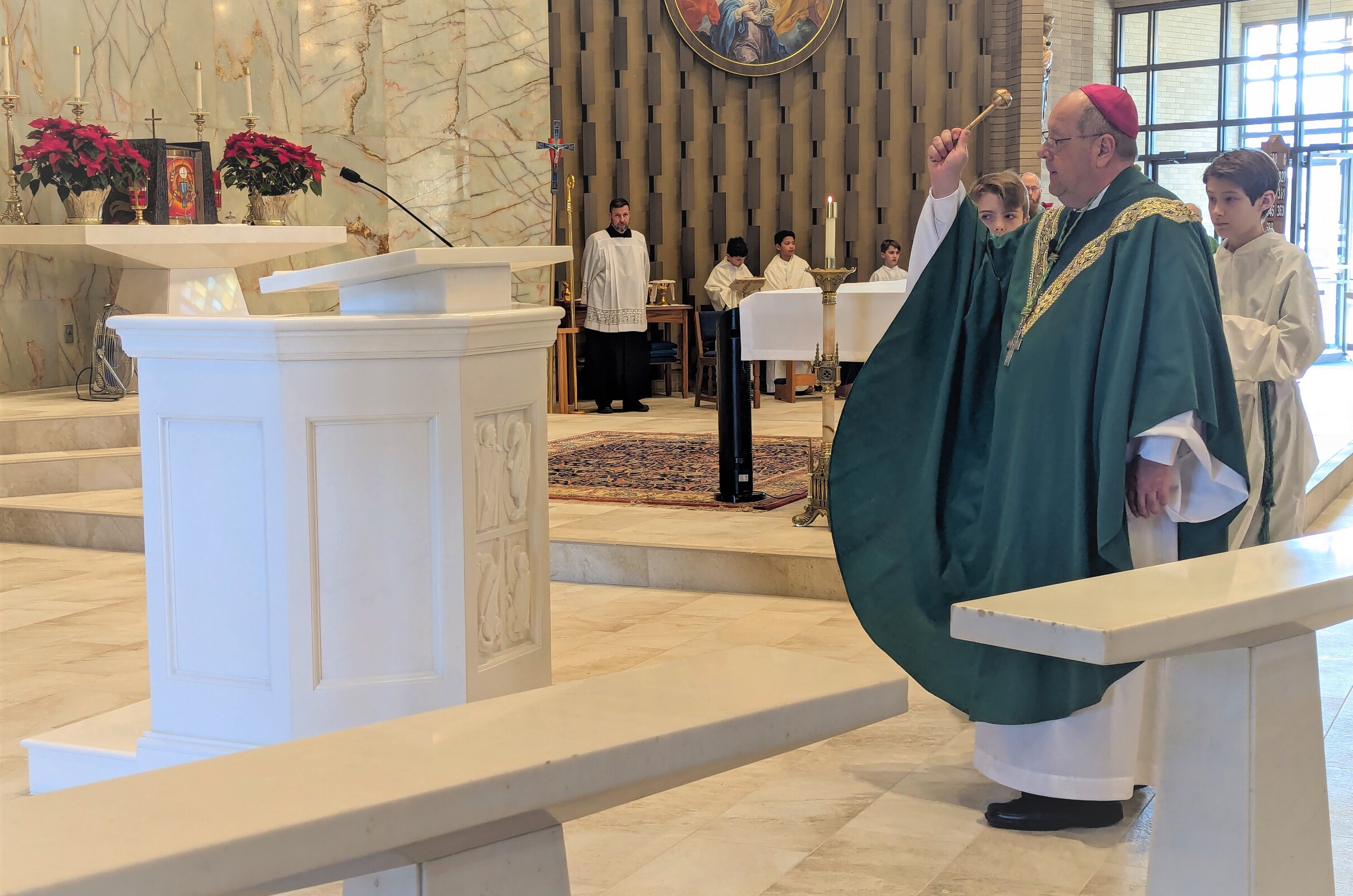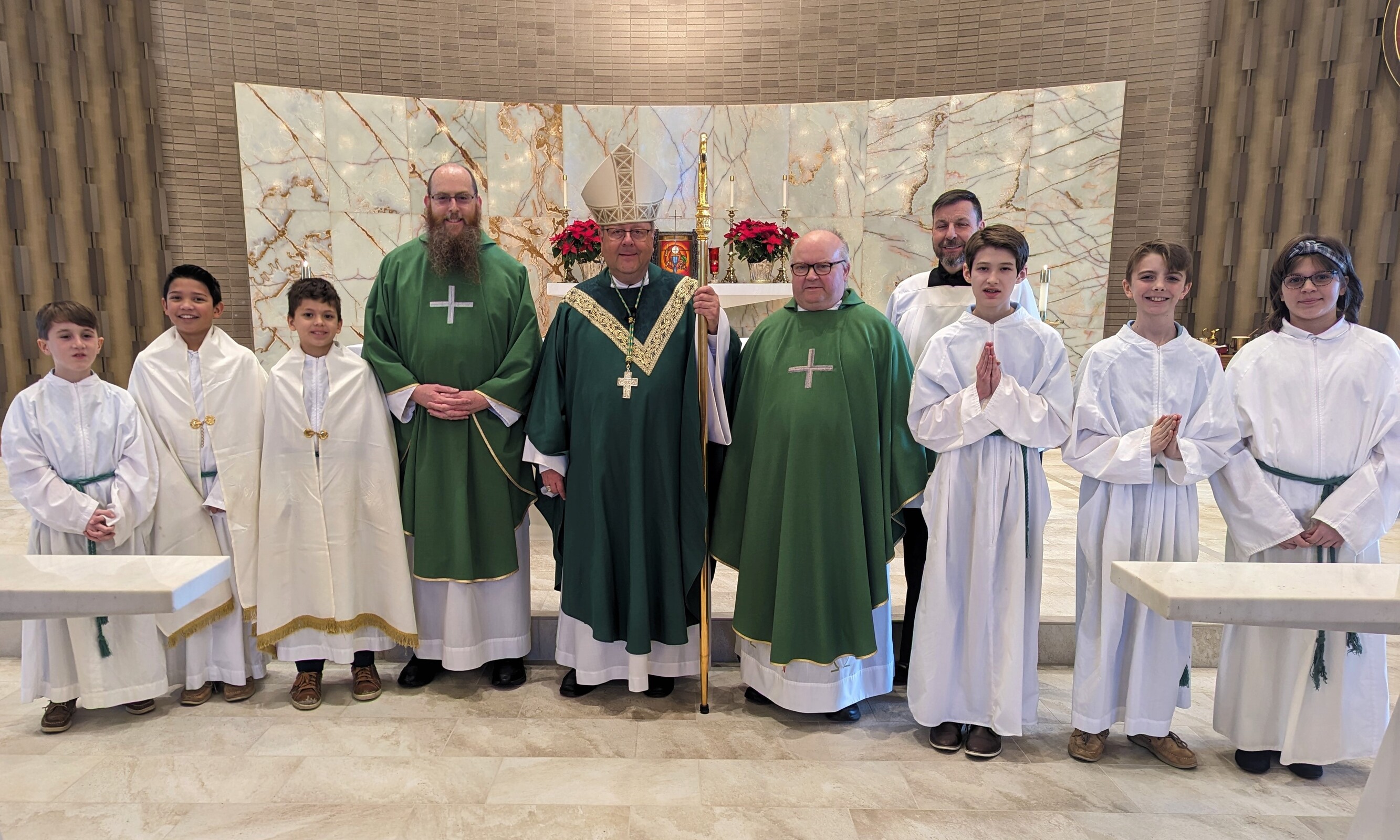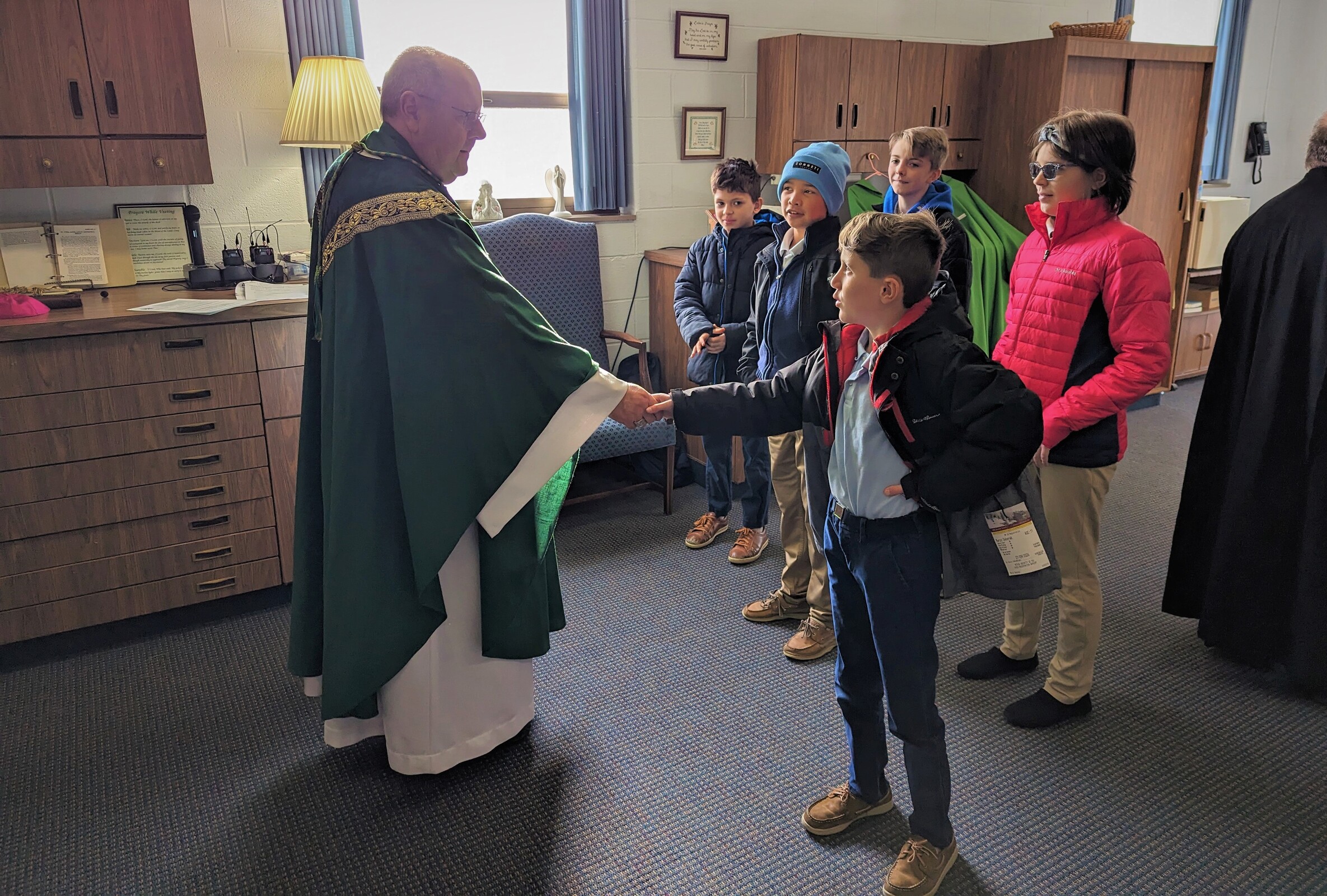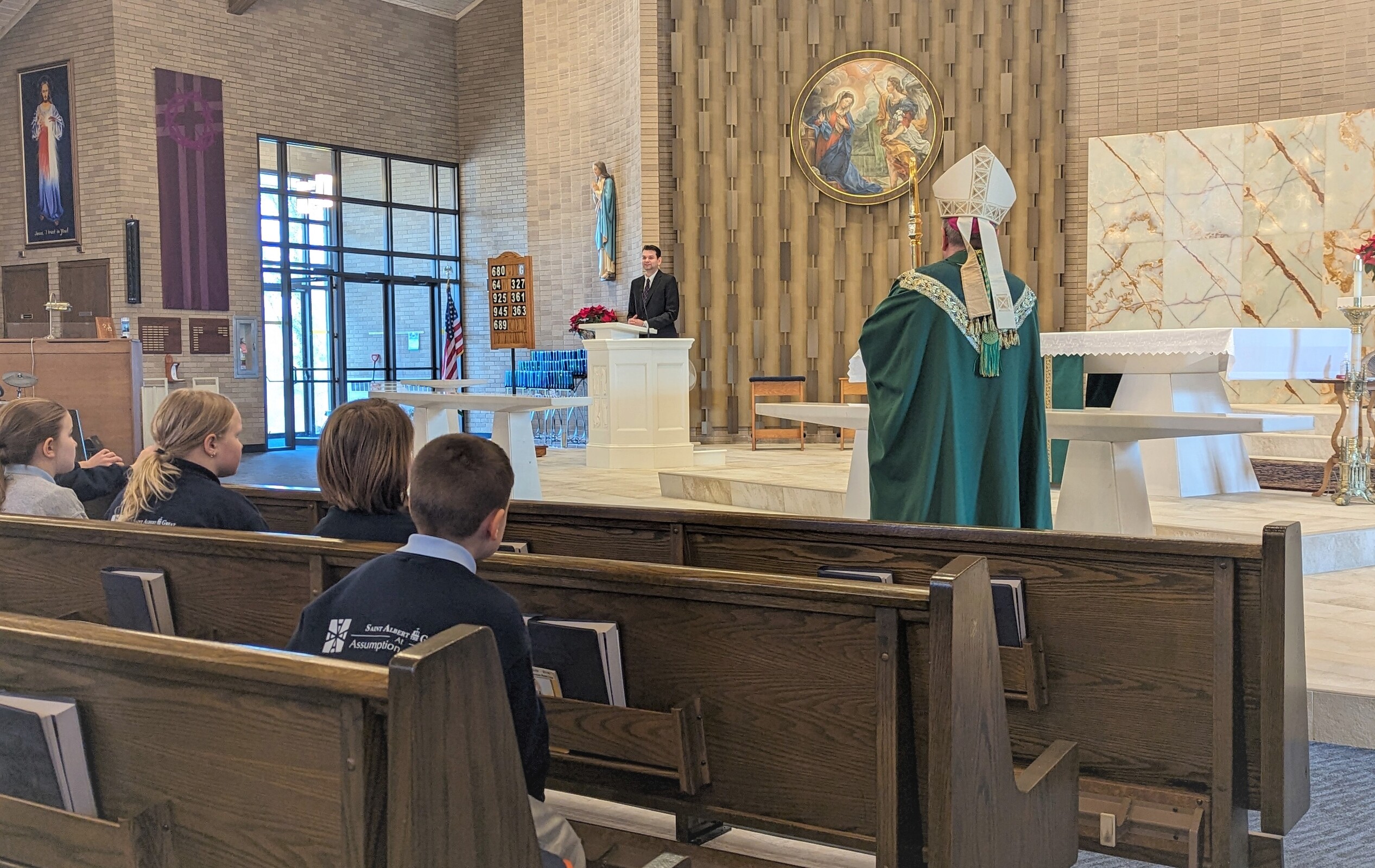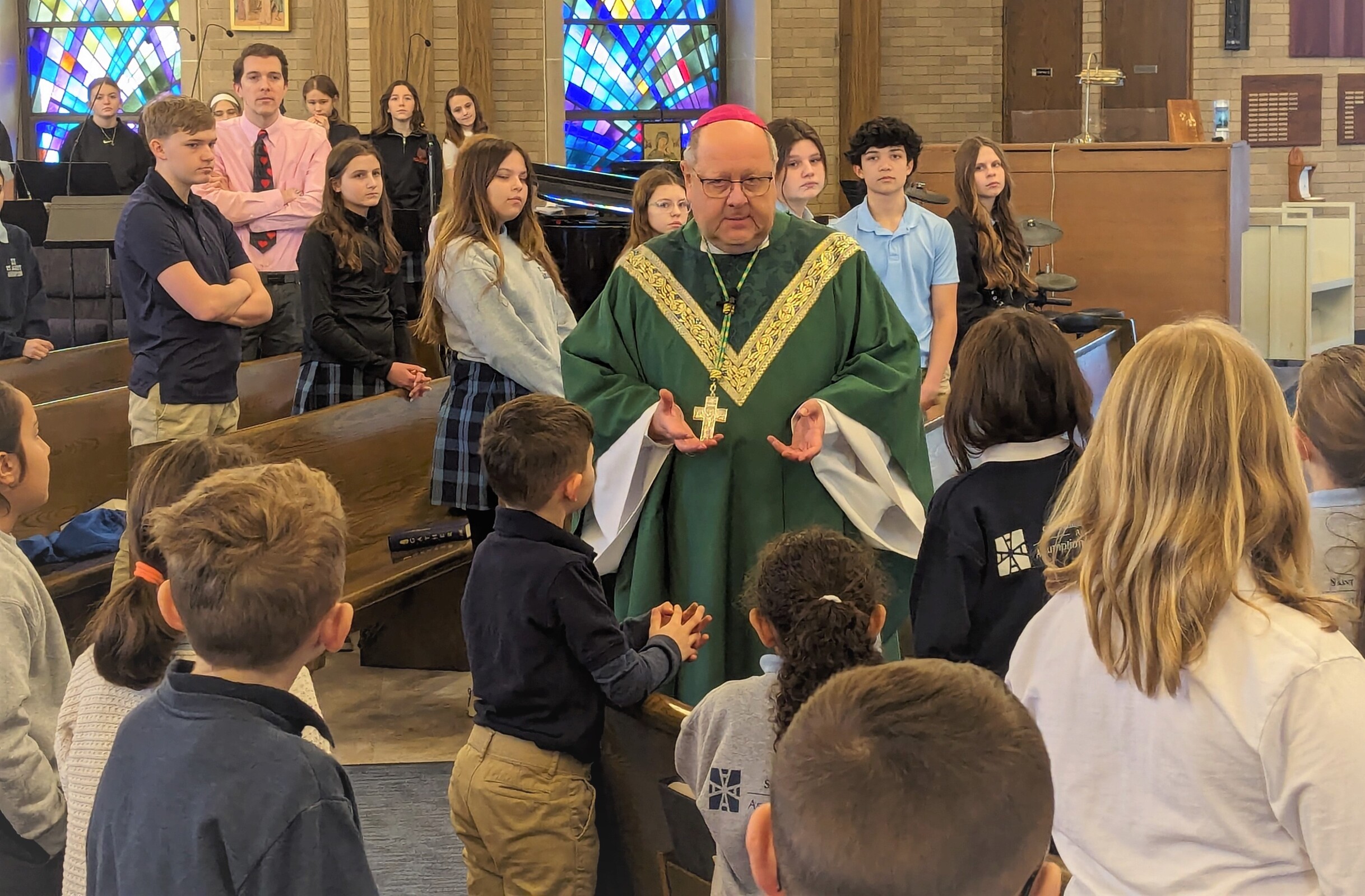 “I am happy to be with you, even if it took a while to come out and see all of you,” the bishop told students, faculty and guests who gathered Feb. 12 in the Church of the Assumption for Mass. “Thanks for the invitation to be with you today and thanks to Mr. (Ed) Vittardi and Principal (Rick) Kaliszewski and to all of you who are making me very welcome here this morning. This is a great school because I see you are great kids.”