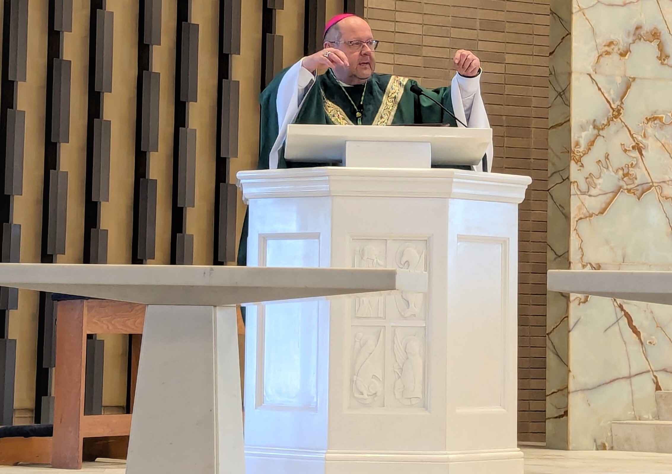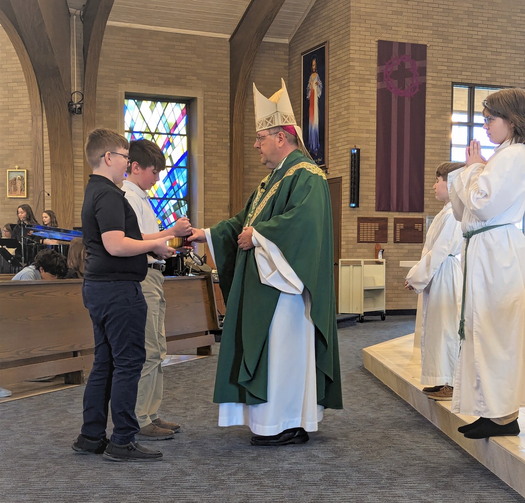 In the day’s Gospel, the bishop said the Pharisees came to argue with Jesus, who “sighed from the depth of his spirit.” He compared that to the students arguing with their parents. In the end, Jesus won the argument with the Pharisees, the bishop said. “Jesus always wins any argument we have with him. And remember, Jesus is God. God always wins an argument.”