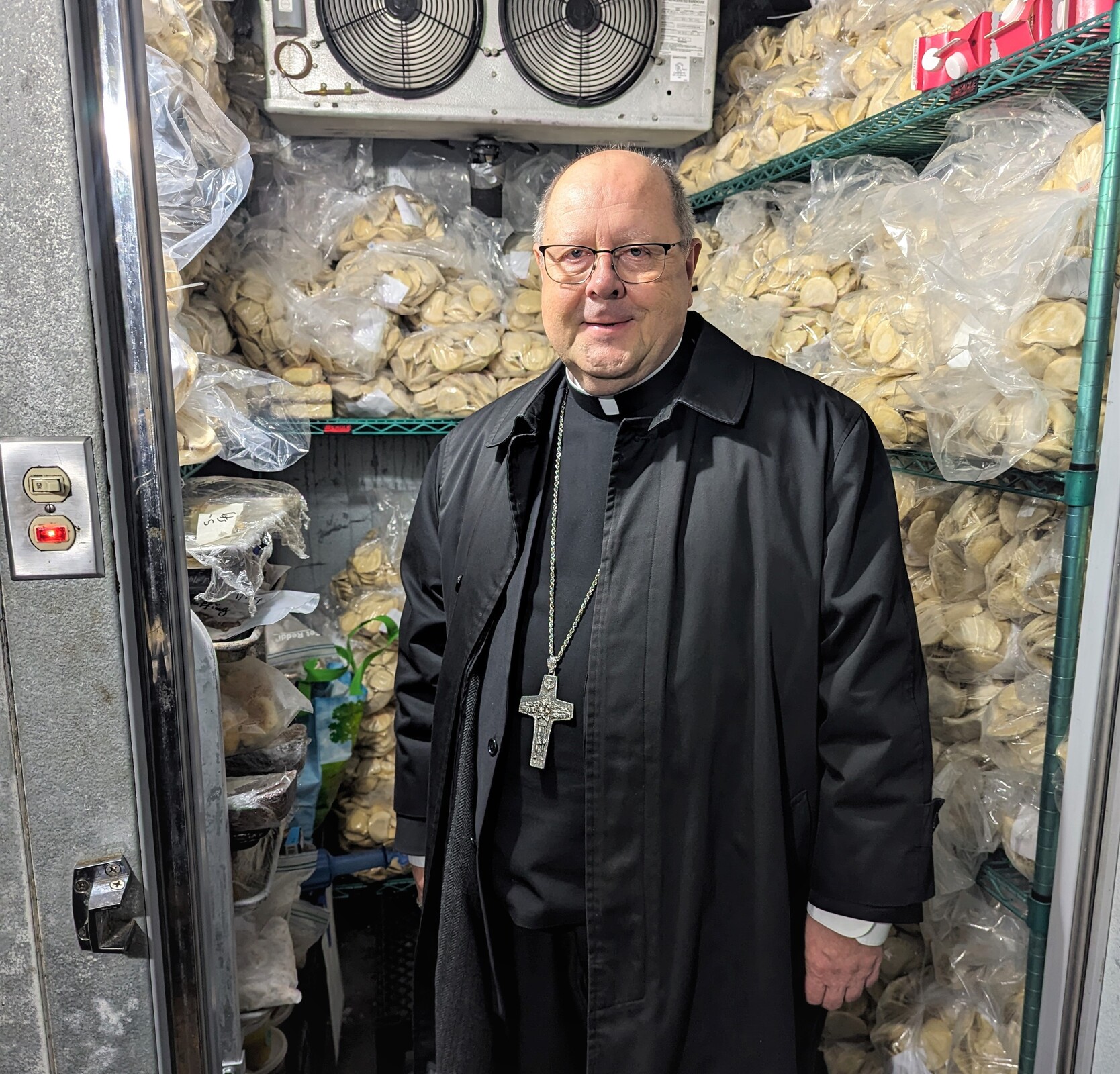 After Mass, the bishop greeted students and toured the school. He also stopped by to see volunteers who were making pierogi that will be frozen and used for the parish’s Lenten fish fries.
