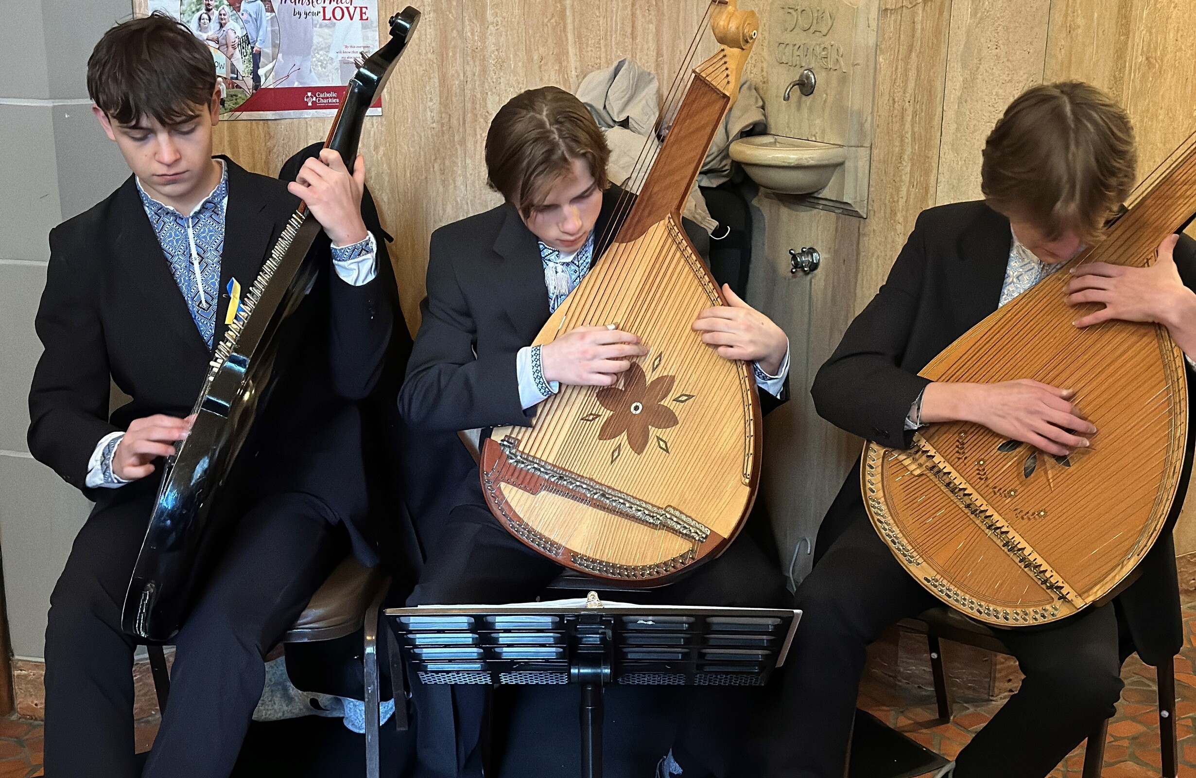 More than two dozen Roman and Ukrainian Catholic, Ukrainian Orthodox and Protestant churches that serve and support the Ukrainian community lined the sanctuary during the event. A choir of Ukrainian children holding battery-operated candles filled the first few pews of the cathedral. They sang in both English and Ukrainian during the vigil, which included a Gospel reading, Bishop Malesic’s homily, a litany for peace in Ukraine, remarks by Bishop Danylo, a prayer for peace in Ukraine and music by a Ukrainian men’s choir. Musicians playing banduras, a Ukrainian string instrument, greeted vigil attendees as they entered the cathedral.
