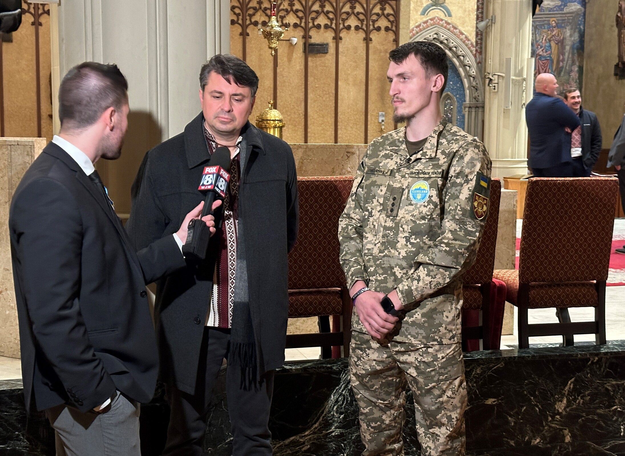Ukrainian Army Lt. Myroslav Pylypchuk, who stepped on a Russian landmine and lost his left leg, was at the vigil in uniform. With help from a translator, he spoke to local media. Pylypchuk is being treated in Cleveland for his injuries,