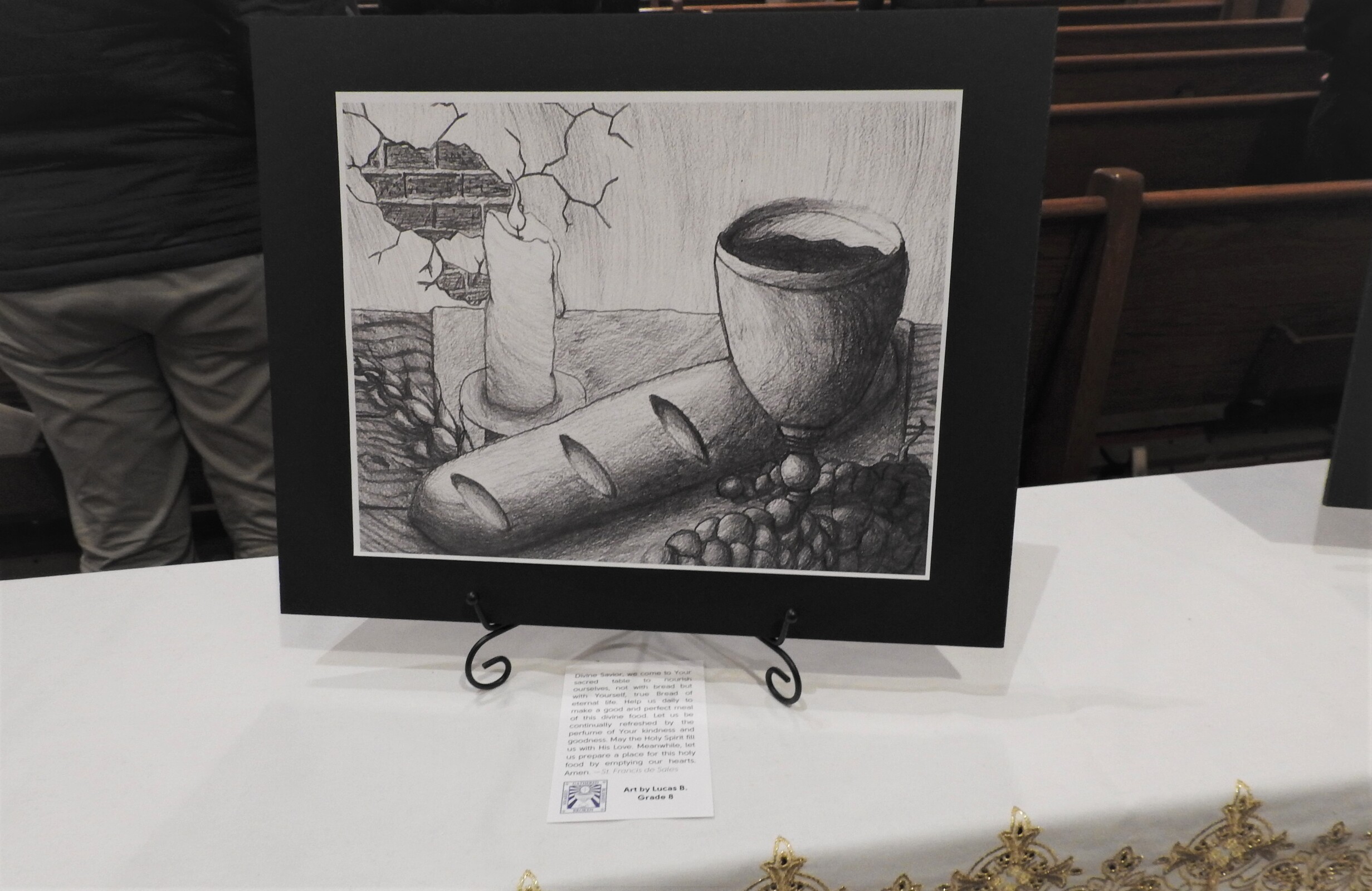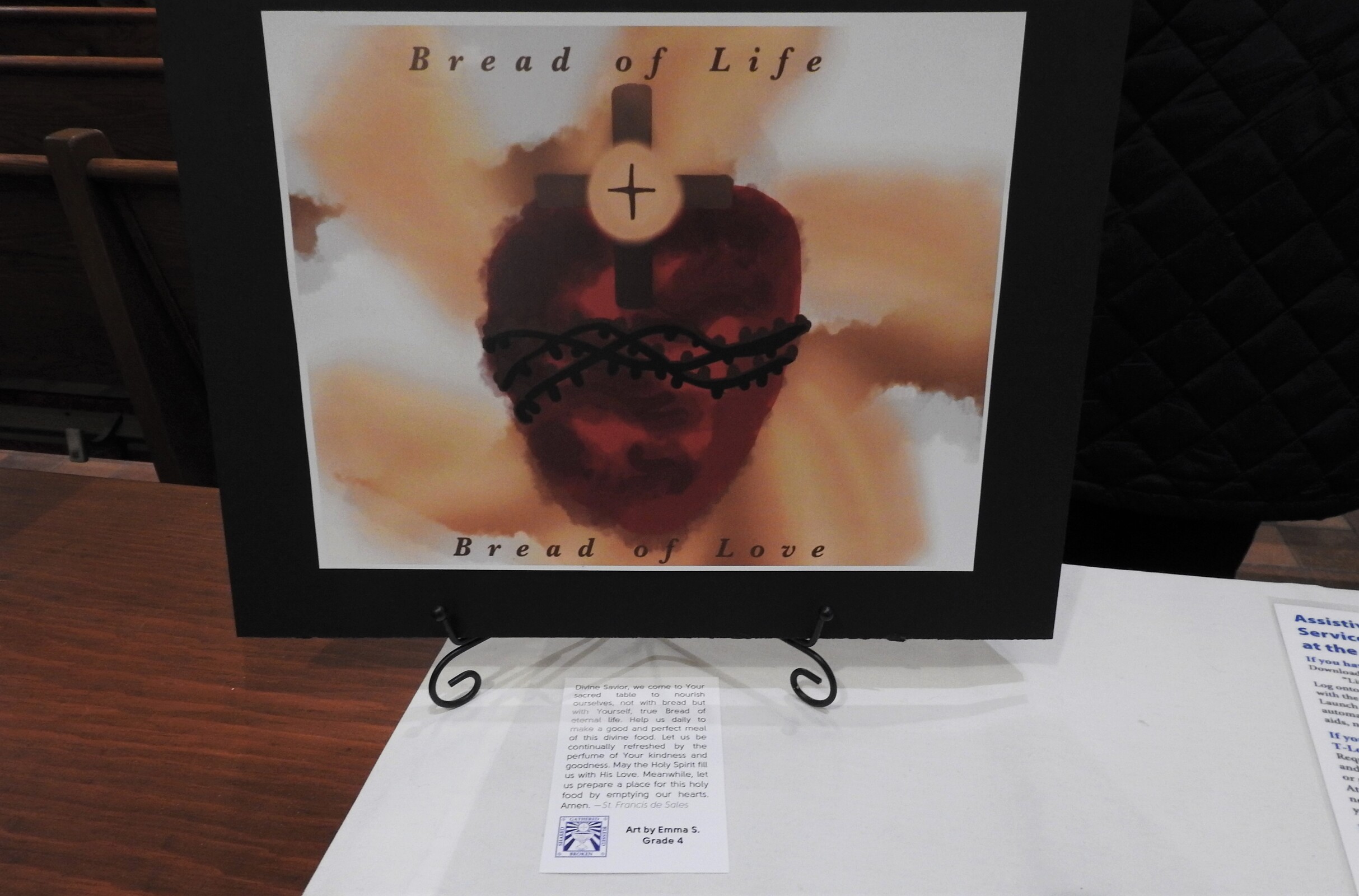 Winners were announced and recognized after the noon Mass on March 6 in the Cathedral of St. John the Evangelist. Students were asked to create art that reflected the theme “Eucharist: Bread of Life” and they were asked to meditate on the Bread of Life Discourse in the Gospel of St. John. A group of judges met to review the entries and select the winners based on their engagement with the theme and the artistic quality of their work.