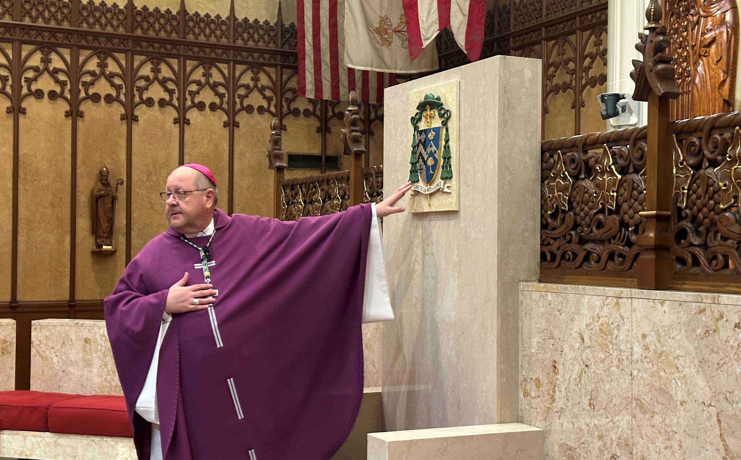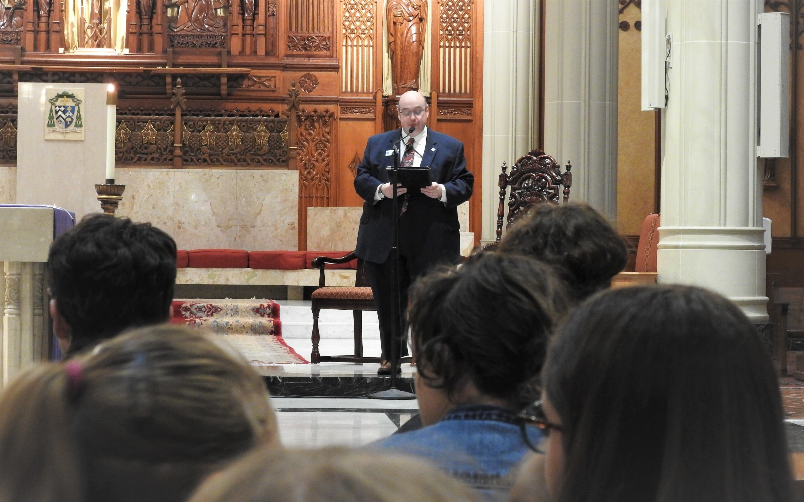 After the awards were presented, the bishop invited the students to follow him into the sanctuary where he talked about why the cathedral has that title. He pointed to the cathedra, the bishop’s large chair, to which his coat of arms is affixed. He also spent some time explaining his coat of arms and pointed out other features of the cathedral church, including Resurrection Chapel, the final resting place for bishops of the diocese.