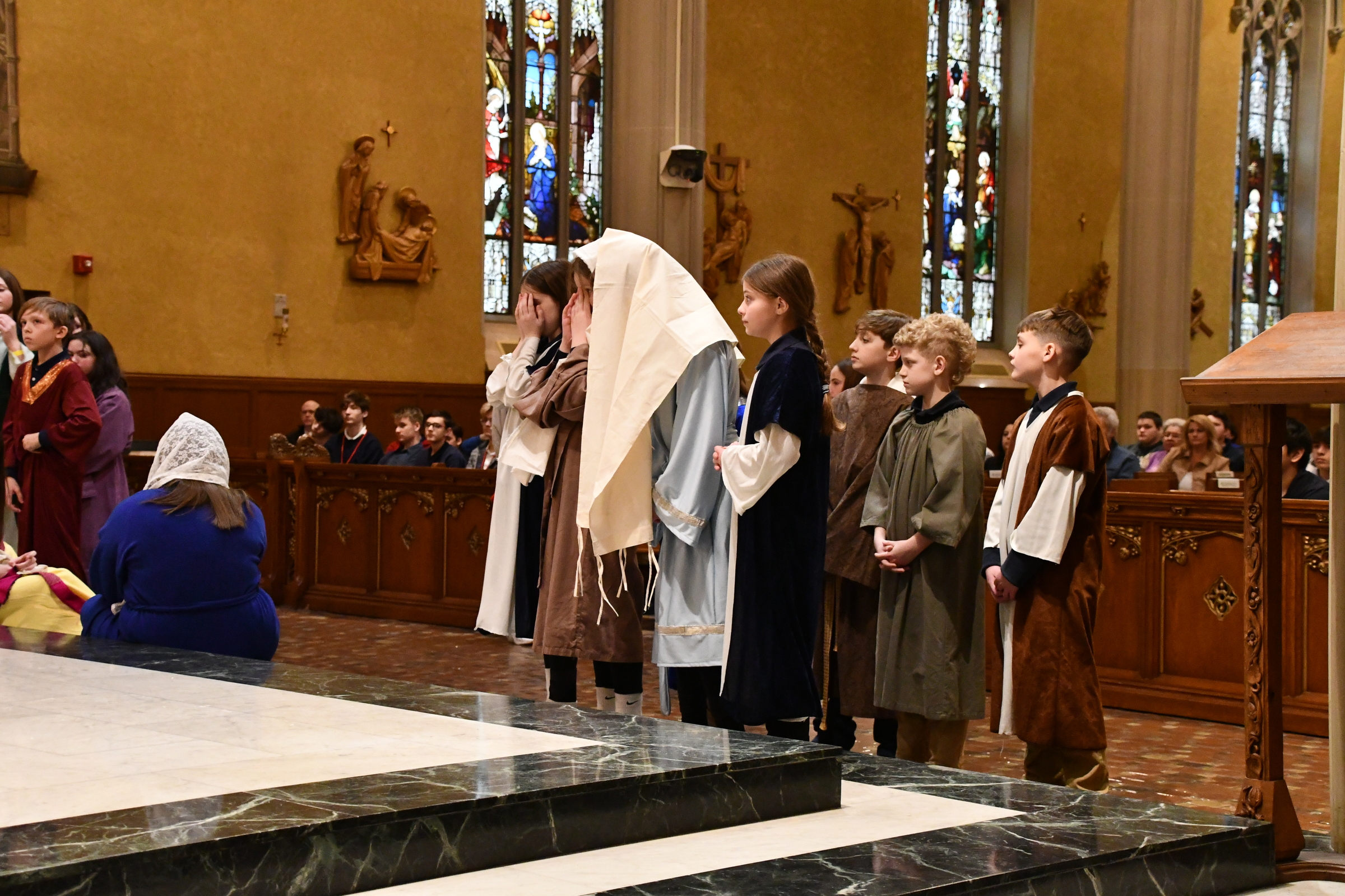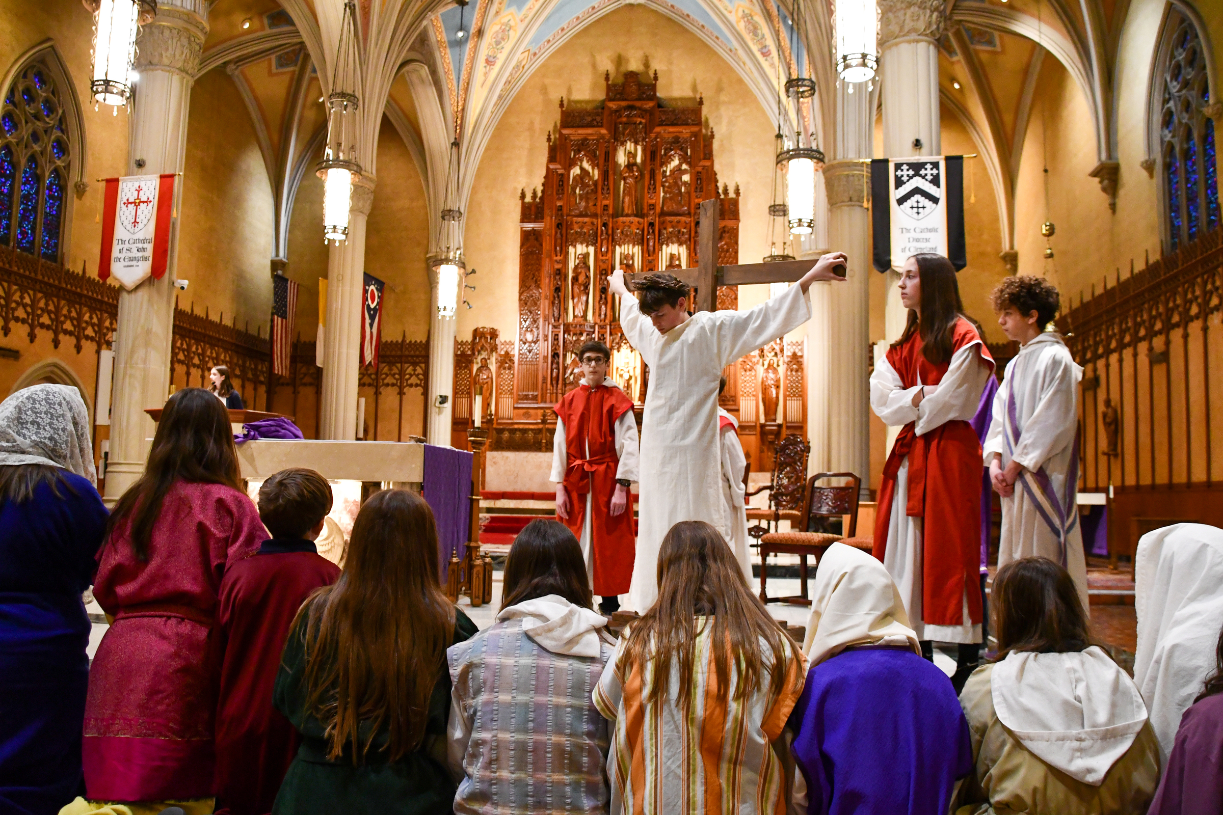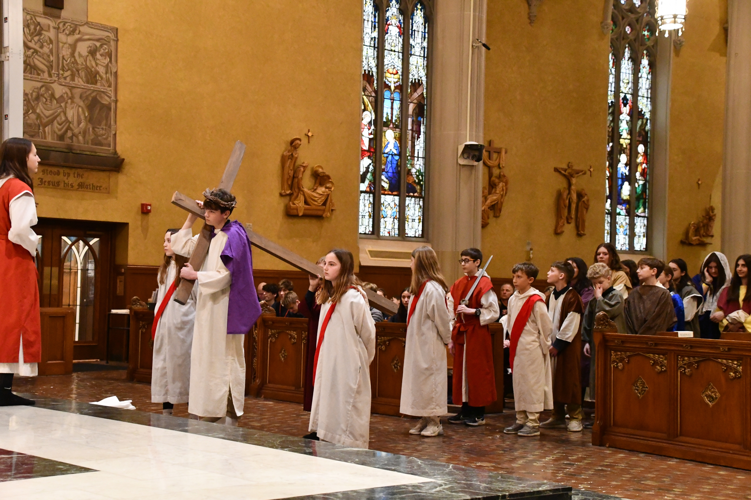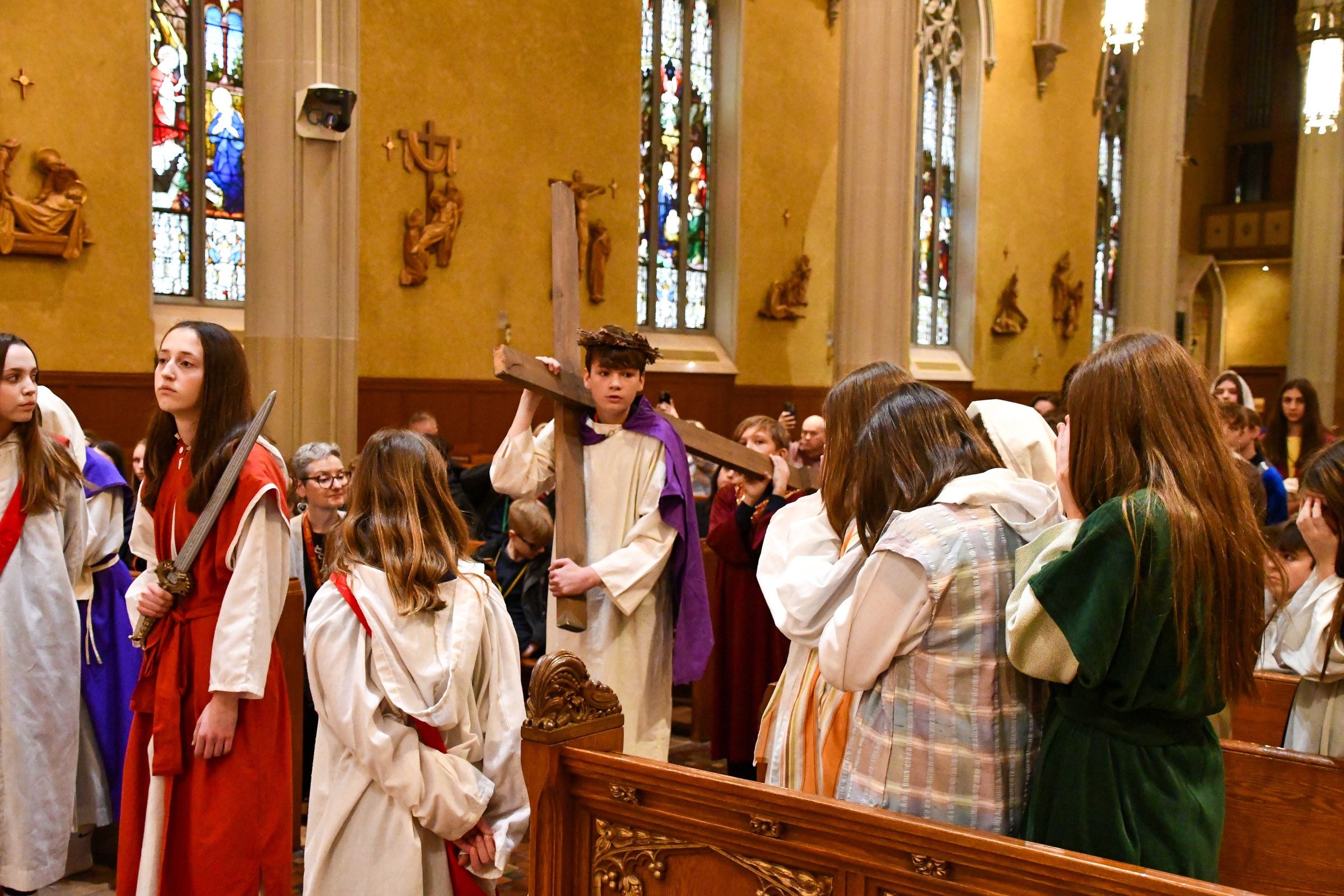 Students in grades 5-8 who are members of the FaithBuilders Leadership Club presented living Stations of the Cross in the cathedral. The living stations presentation is a tradition at the parish that they shared with a wider group at the cathedral this year.