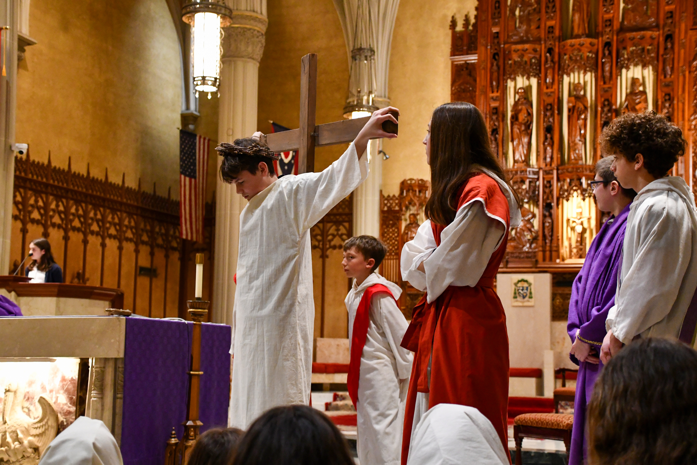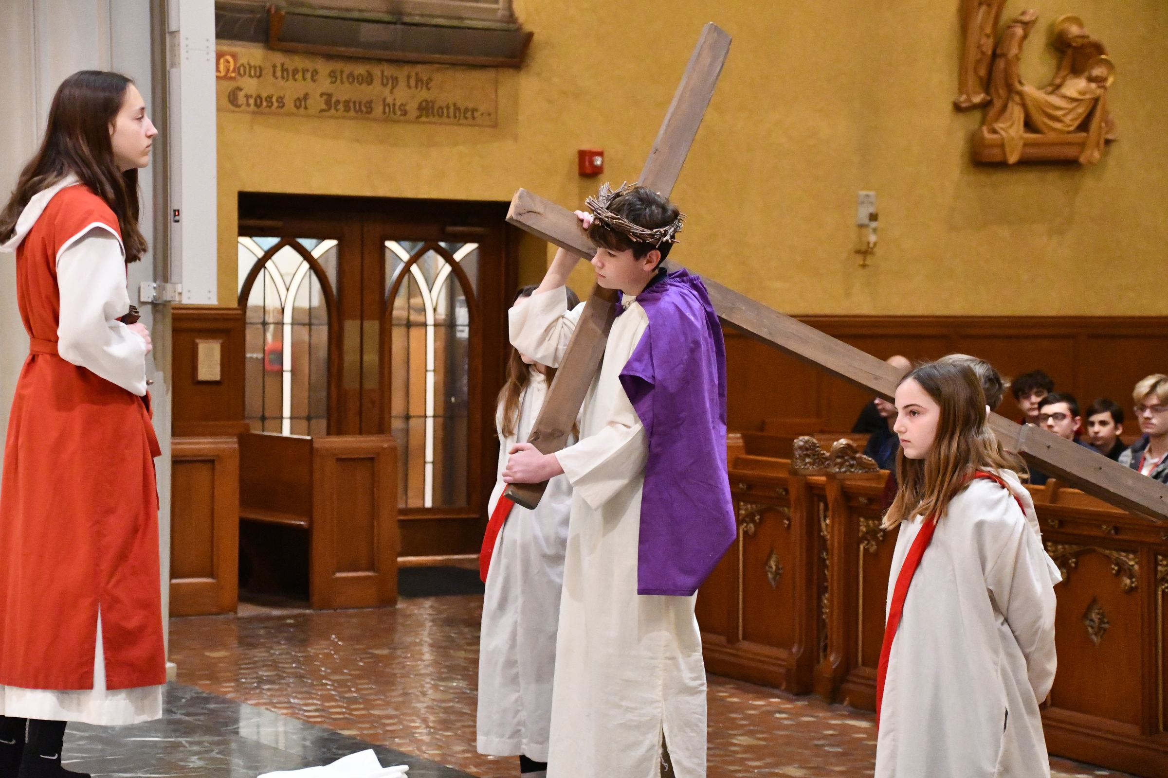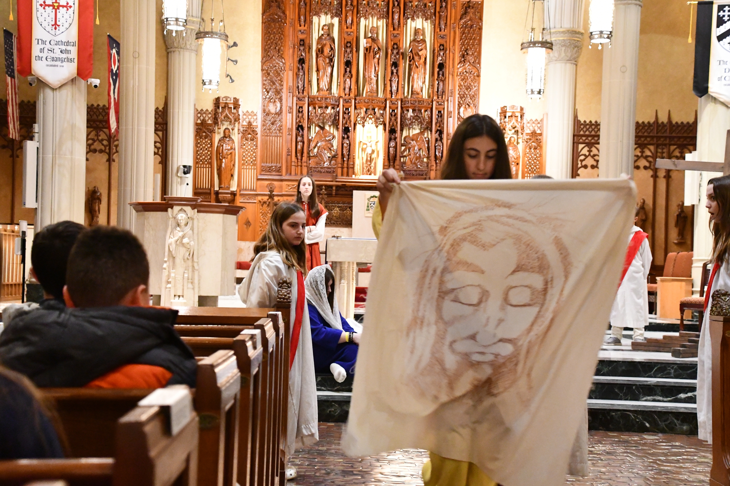 Students in grades 5-8 who are members of the FaithBuilders Leadership Club presented living Stations of the Cross in the cathedral. The living stations presentation is a tradition at the parish that they shared with a wider group at the cathedral this year.