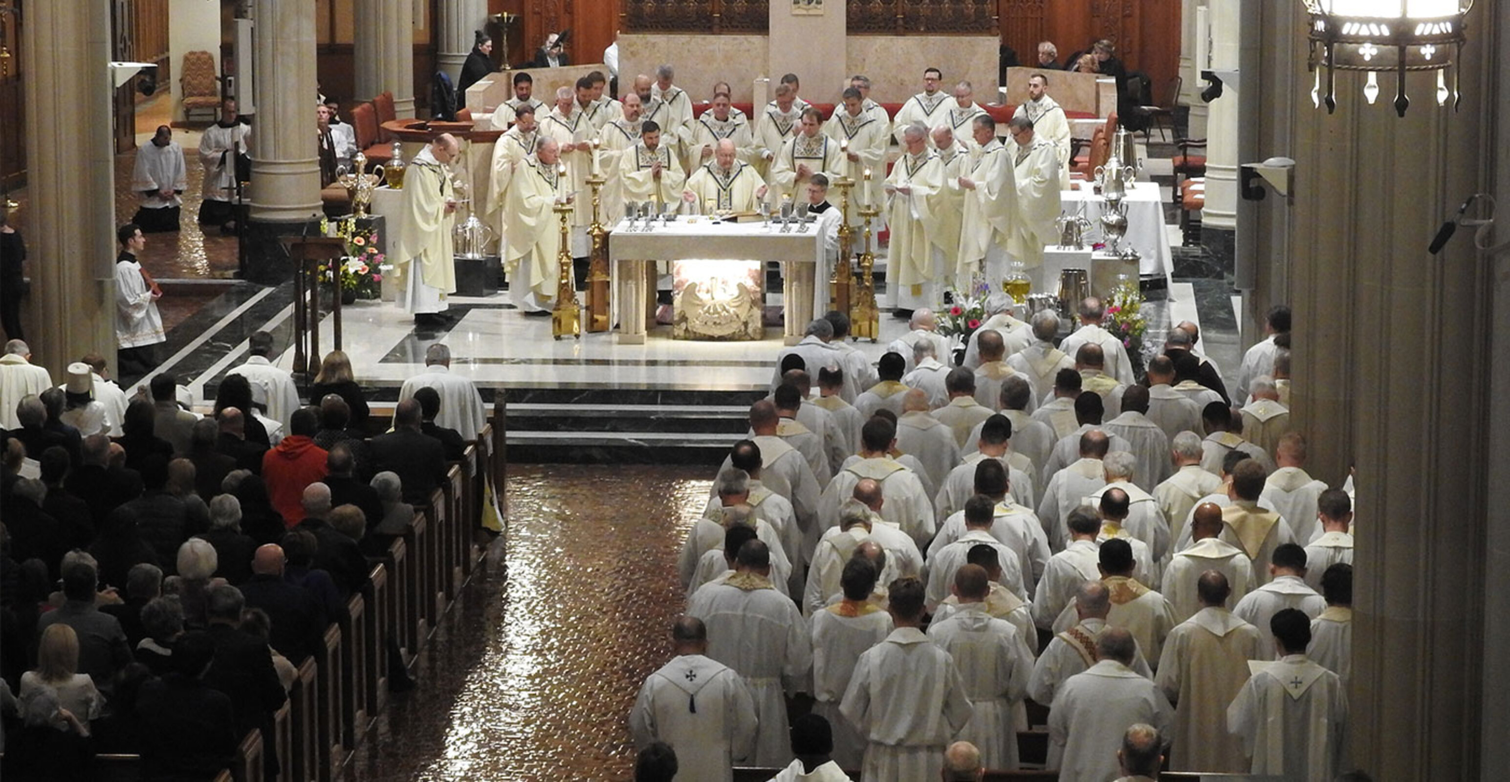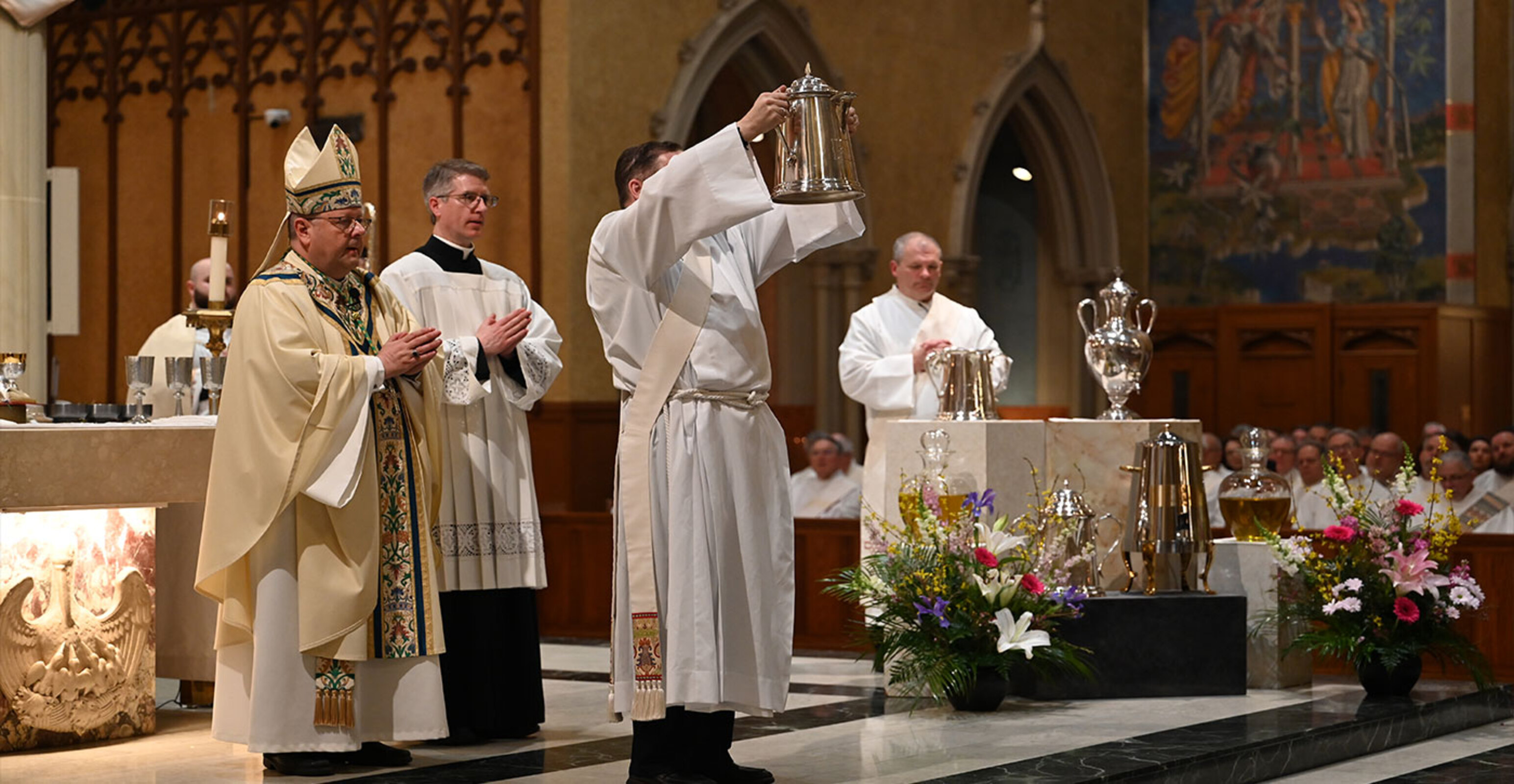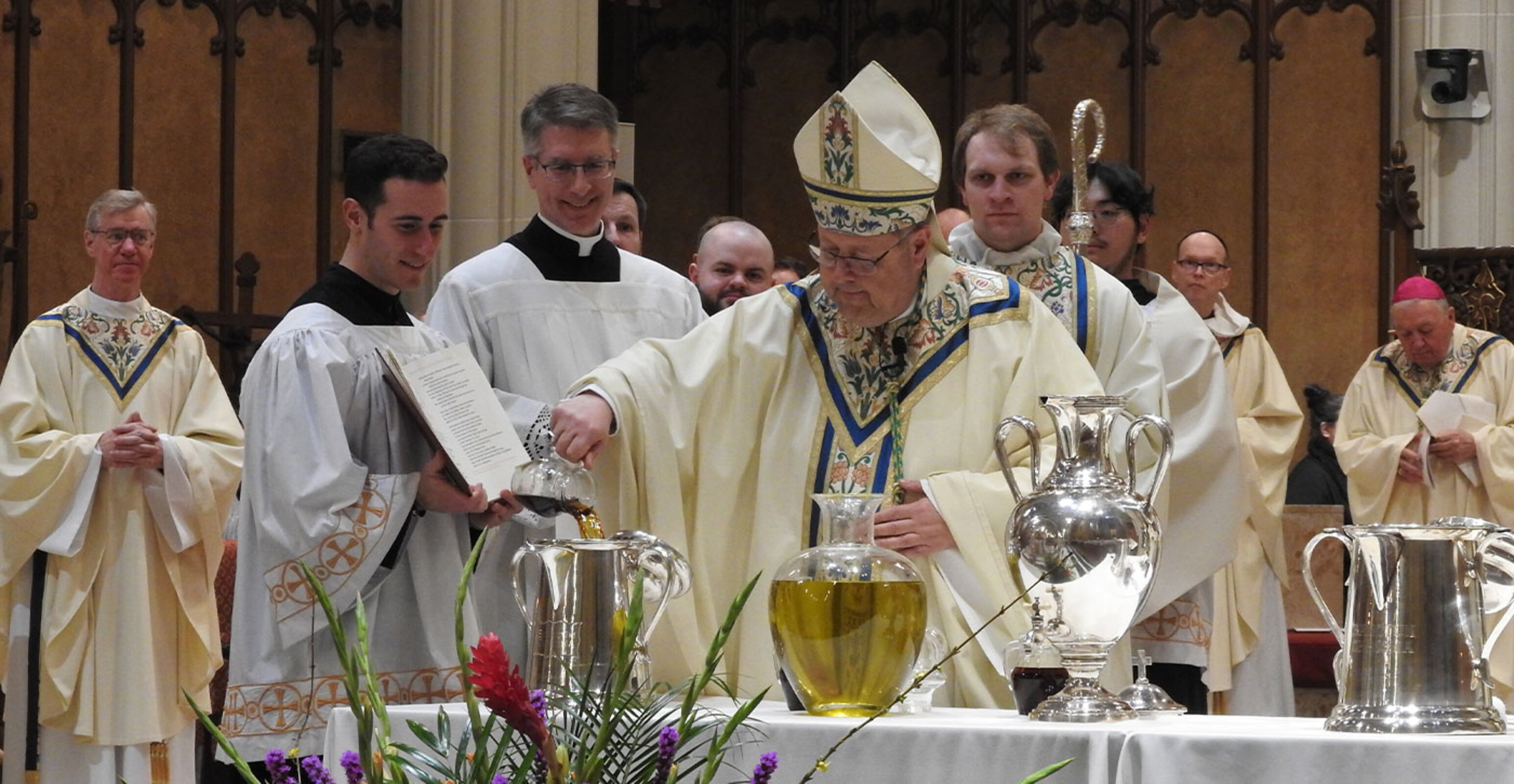 The liturgy, one of the most beautiful in the Church, celebrates the institution of the priesthood and the renewal of priestly promises. In addition, the sacred oils used for sacramental purposes throughout the diocese are blessed during the Mass.
