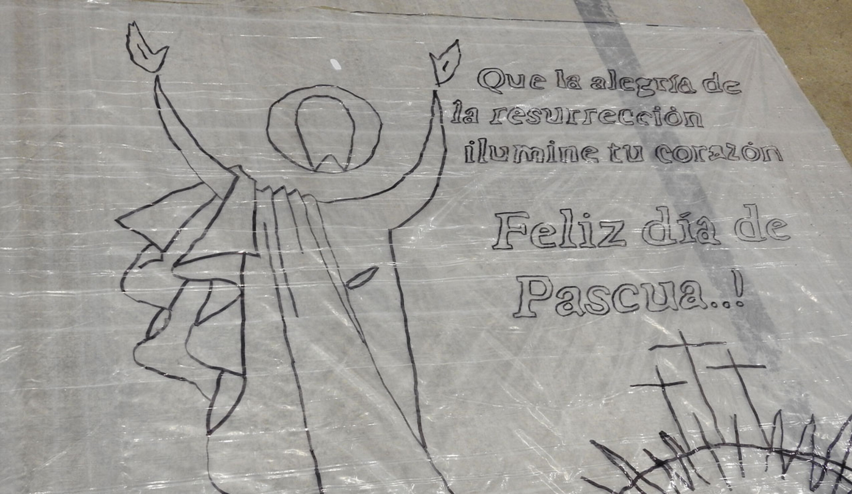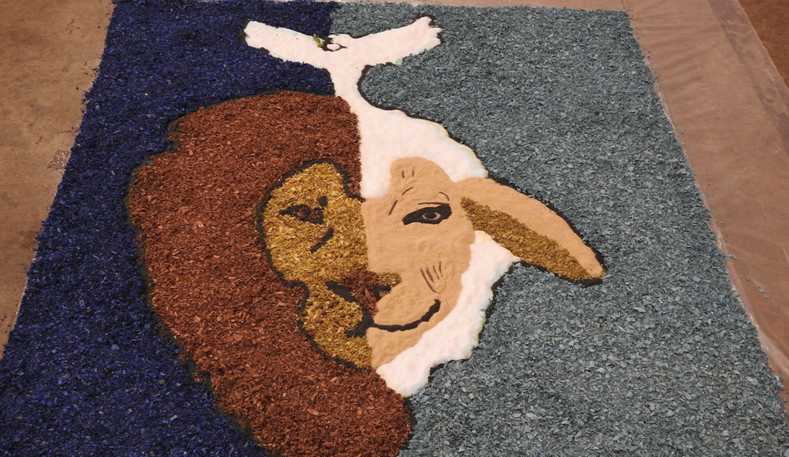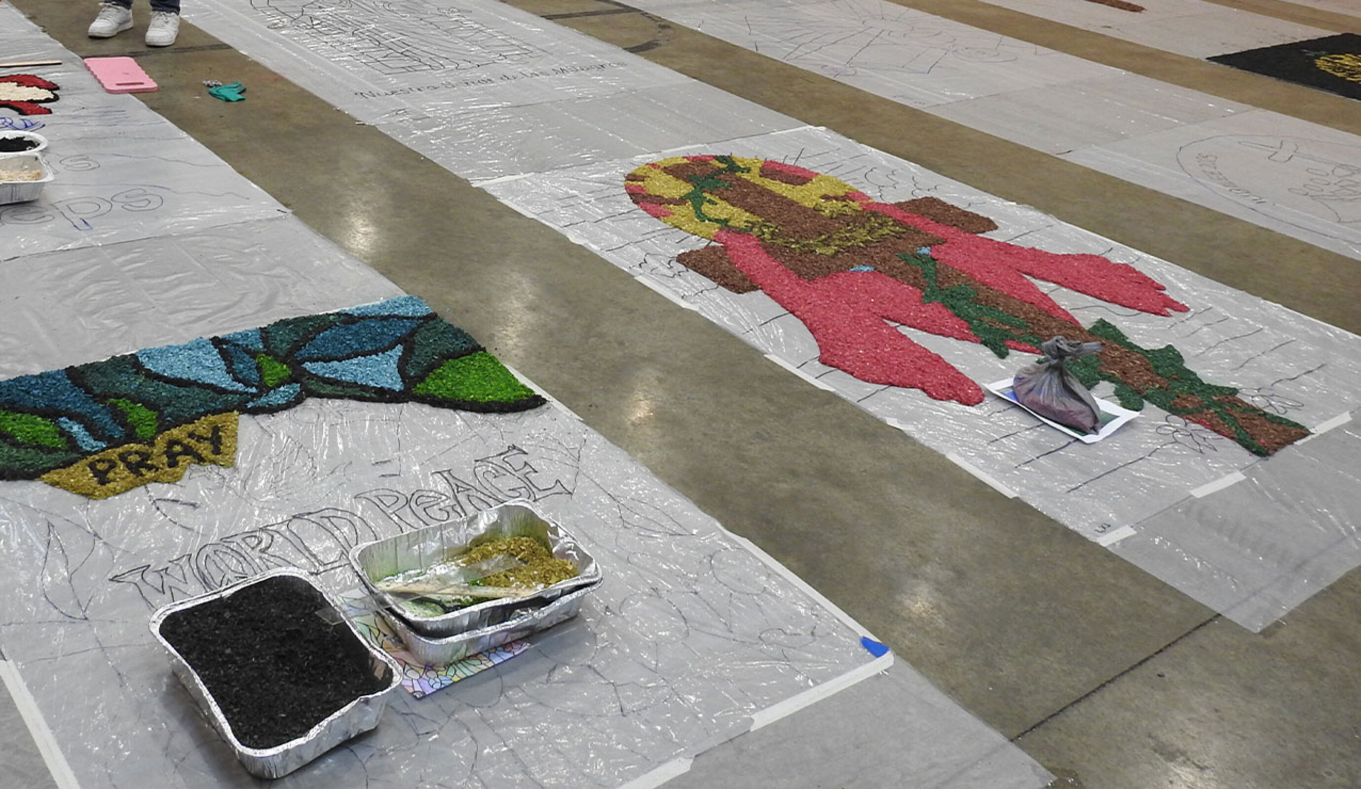Individual panels for the carpets were traced onto other pieces of plastic and these were taped onto the long sheets. The panels then were filled in with sawdust, flour, glitter and other materials to bring the design to life. Panels were produced by individuals, families, organizations and others. Each panel has a religious theme.