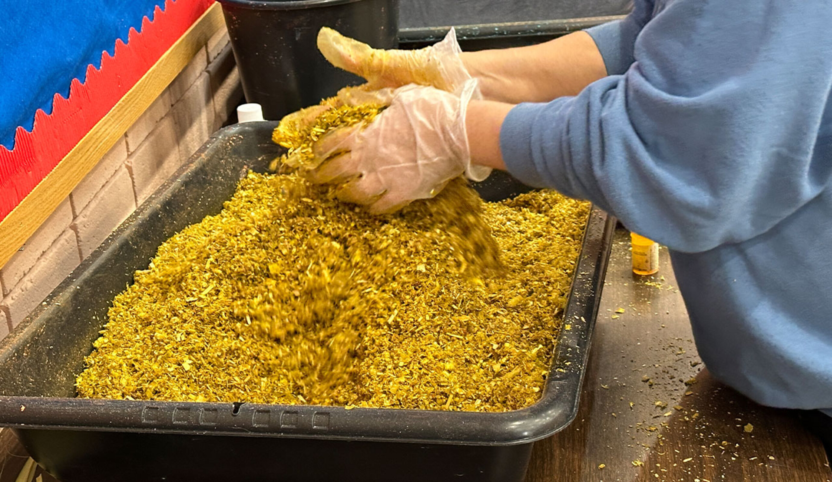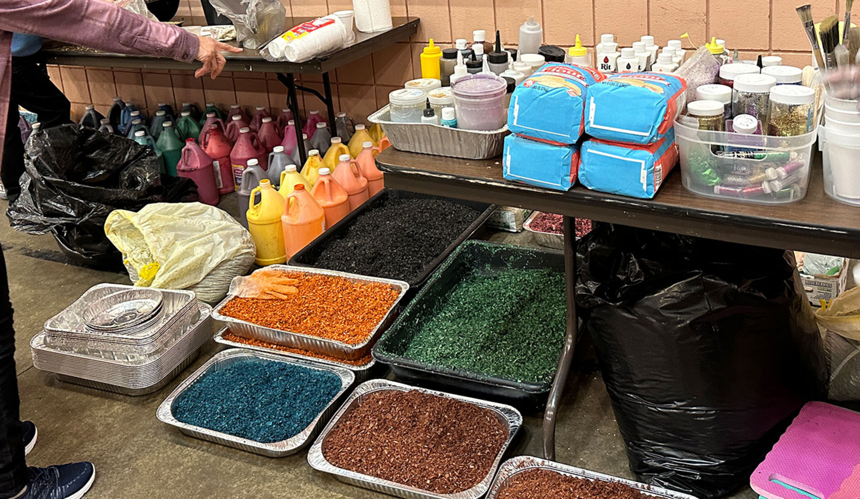 Volunteers dyed copious amounts of sawdust for the carpets. Flour and glitter also were available. Those who wanted additional materials for their panels provided other things, including small, artificial flowers. Ideally, the panels are created using natural materials.