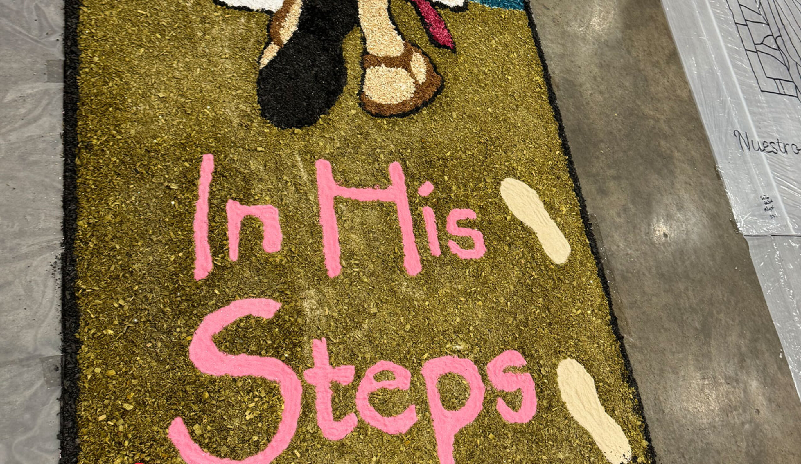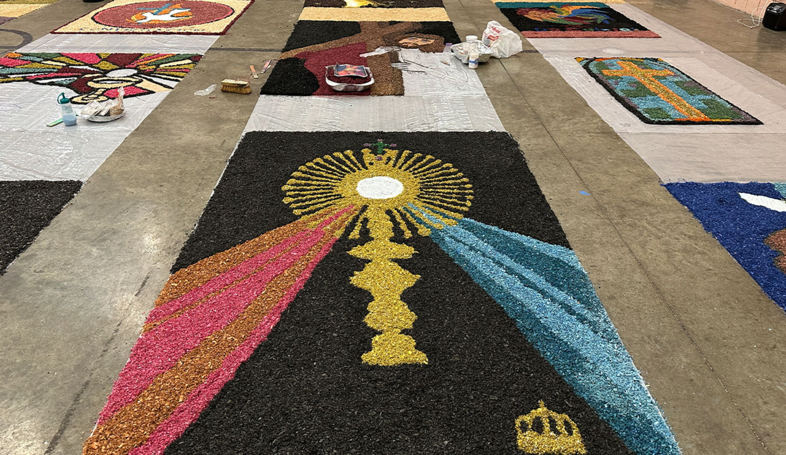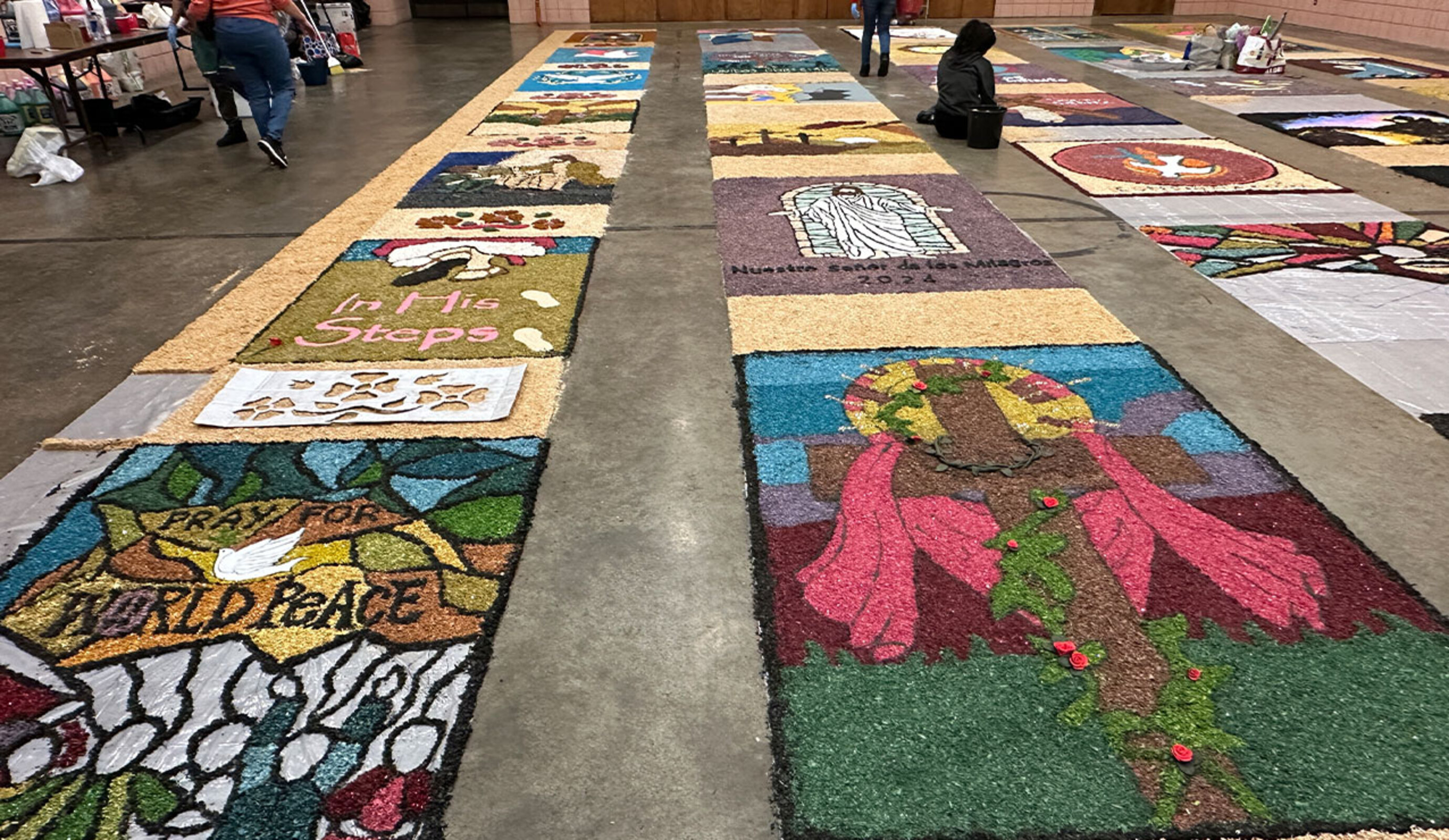 After Mass on Palm Sunday, March 24, the gym at Sagrada Familia Church was swept carefully and long sheets of plastic were taped to the floor indicating the outline for this year’s Carpets of Holy Week.