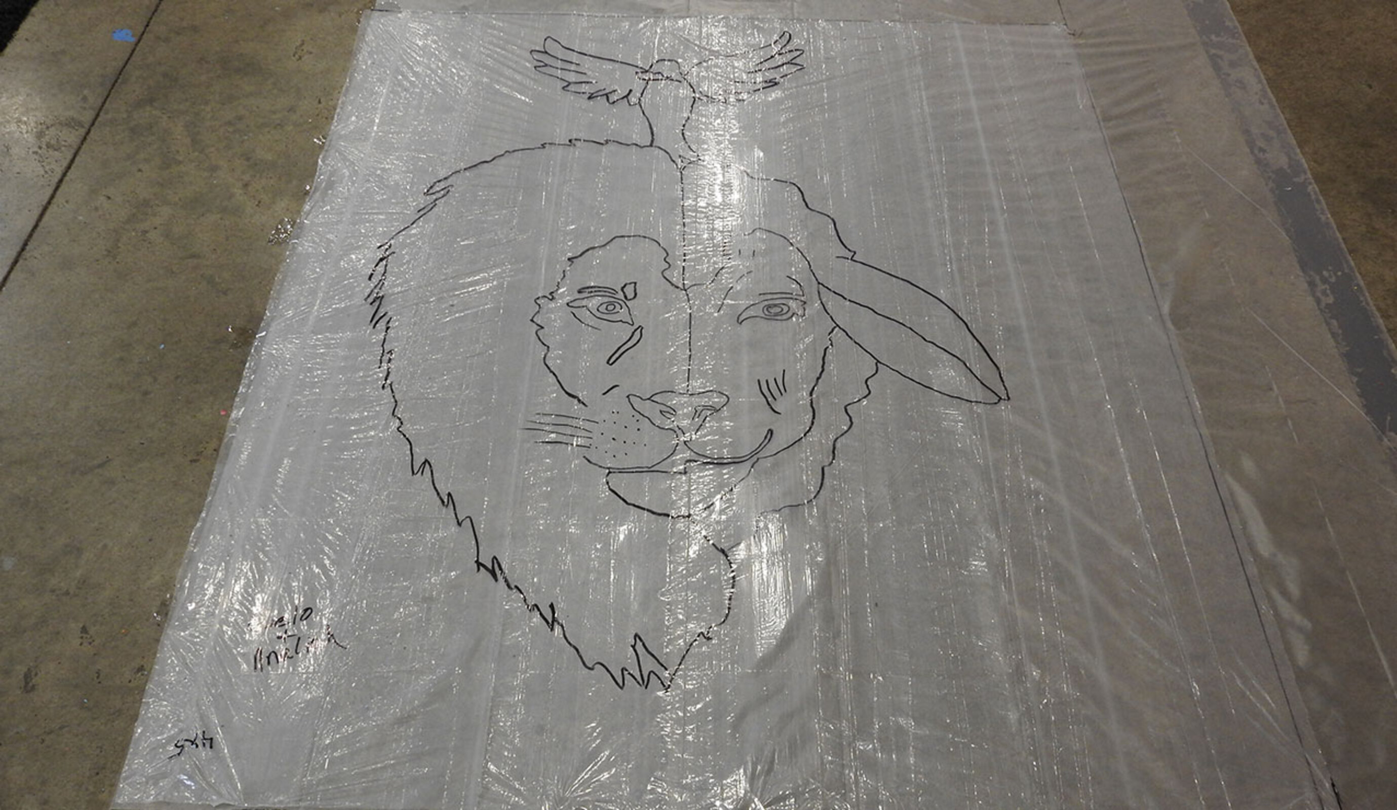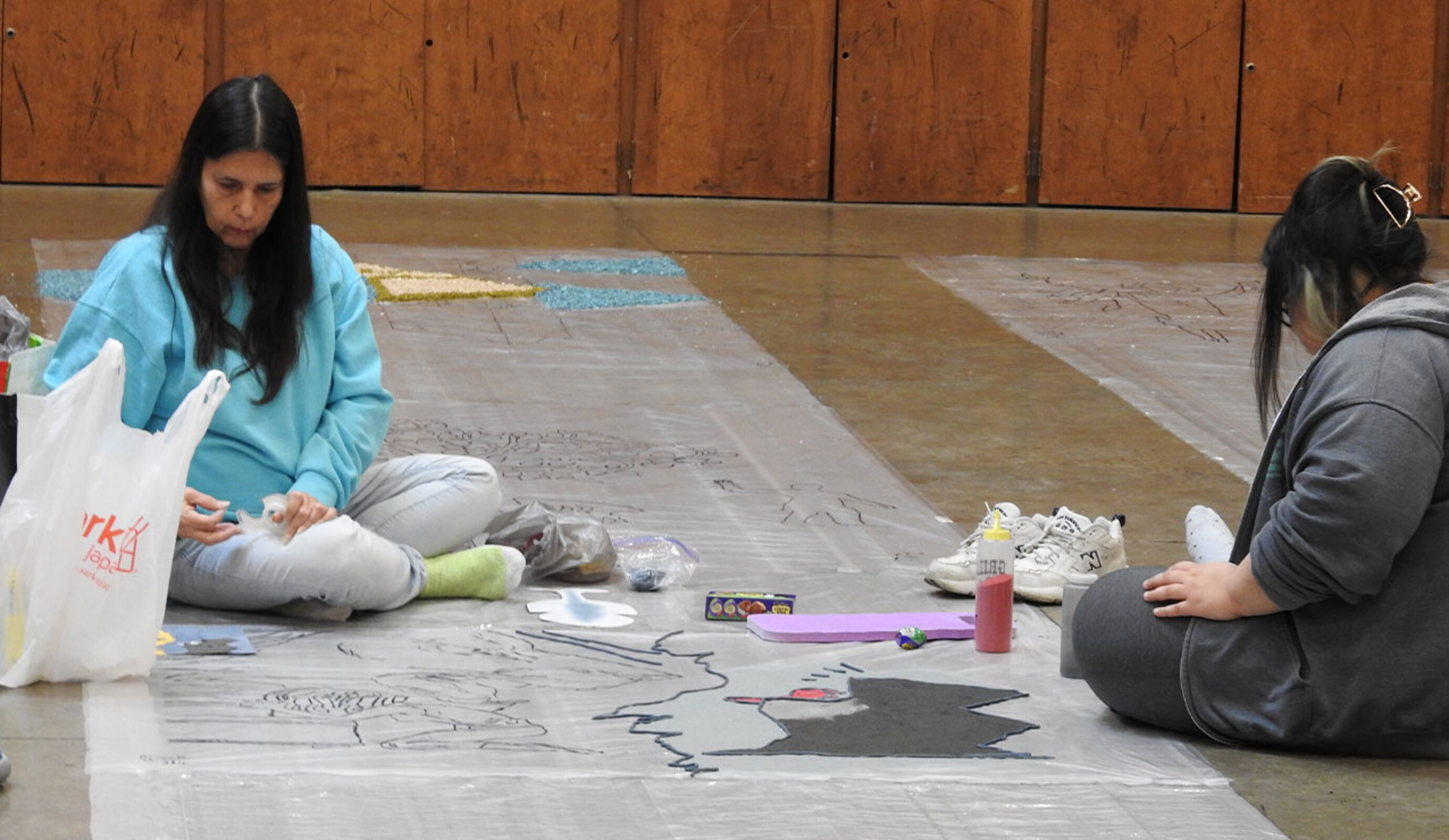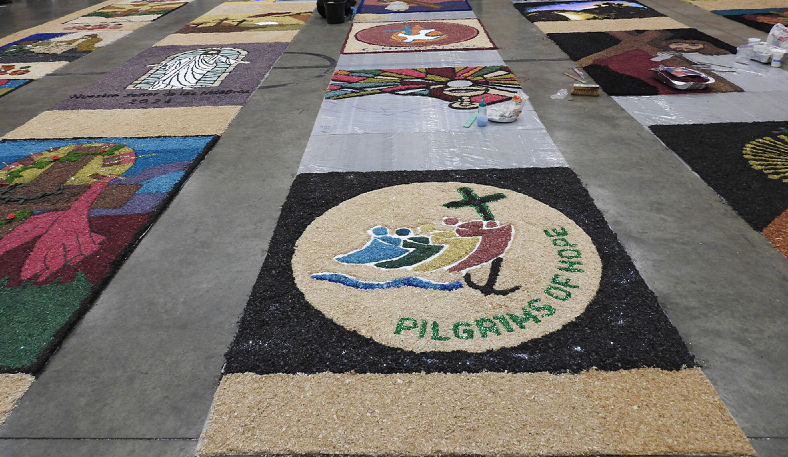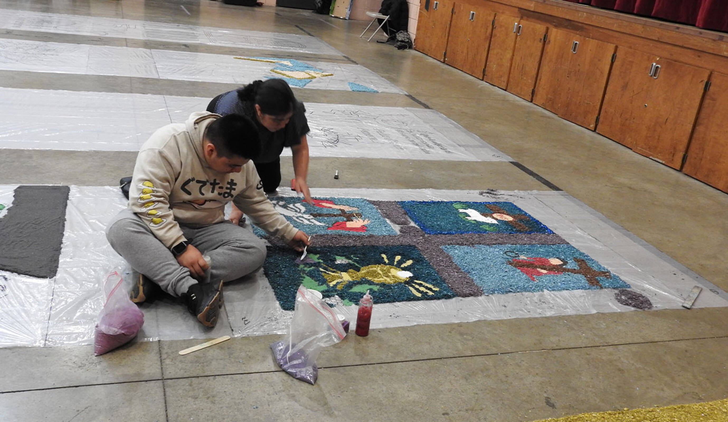 After Mass on Palm Sunday, March 24, the gym at Sagrada Familia Church was swept carefully and long sheets of plastic were taped to the floor indicating the outline for this year’s Carpets of Holy Week.