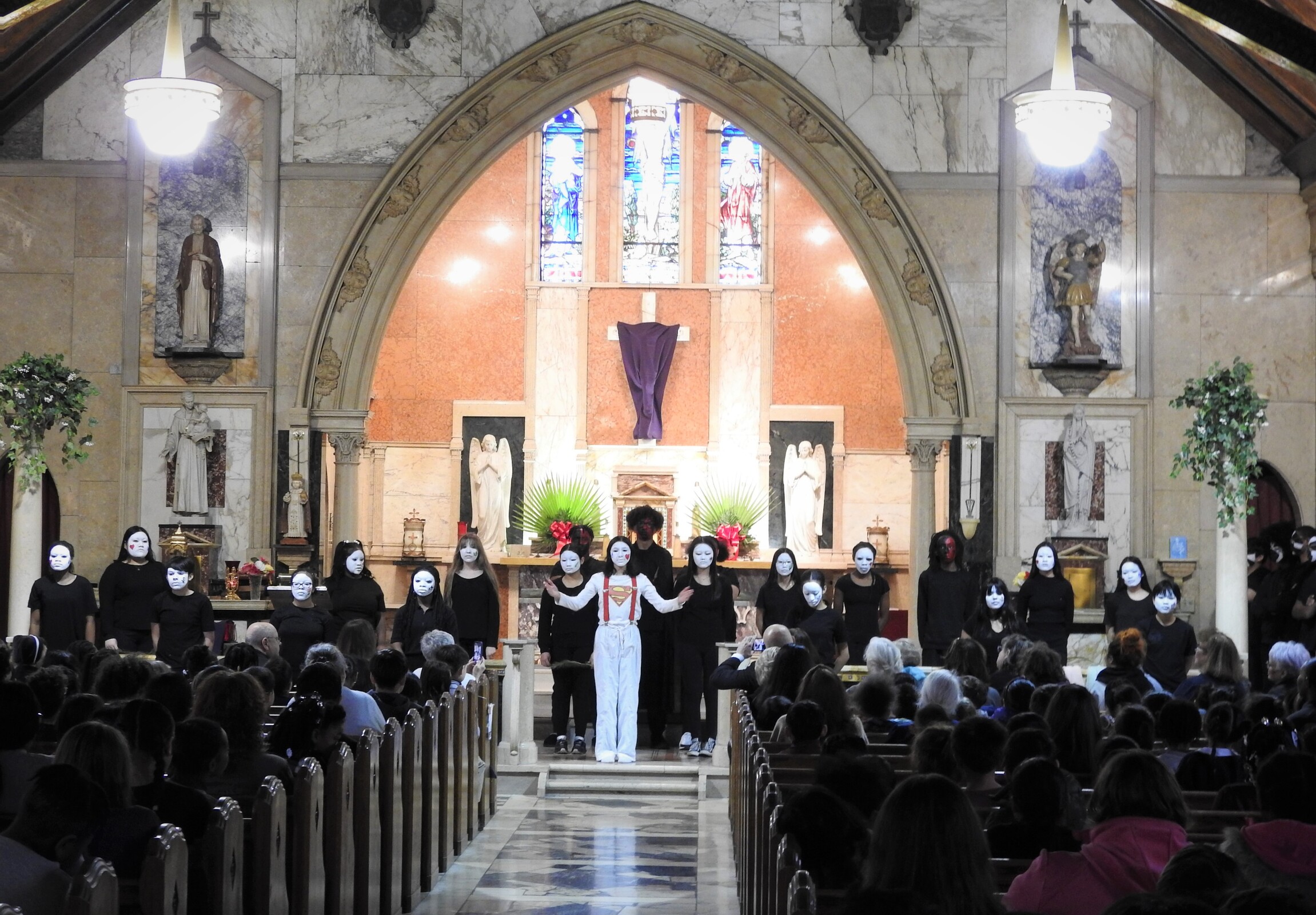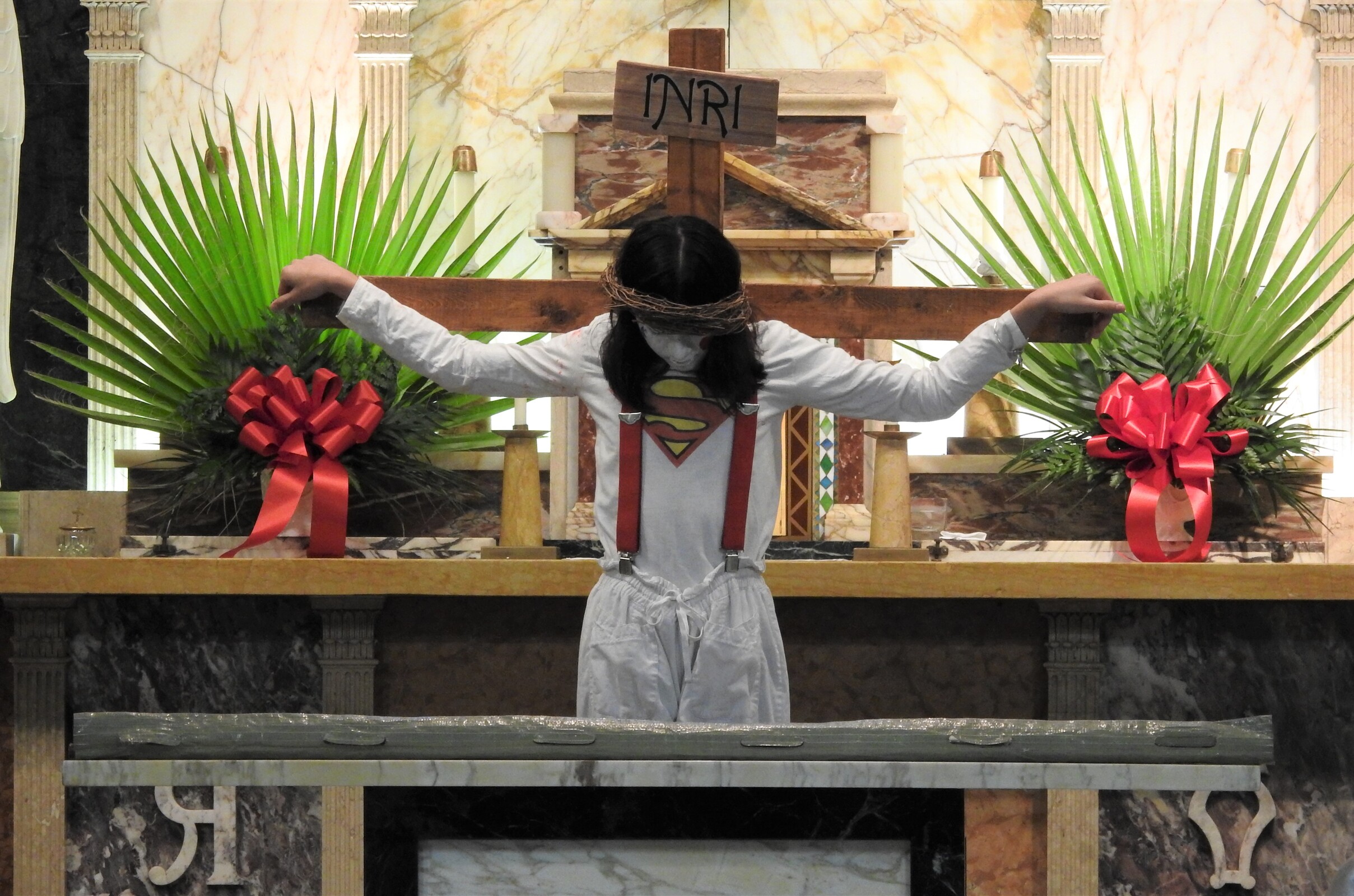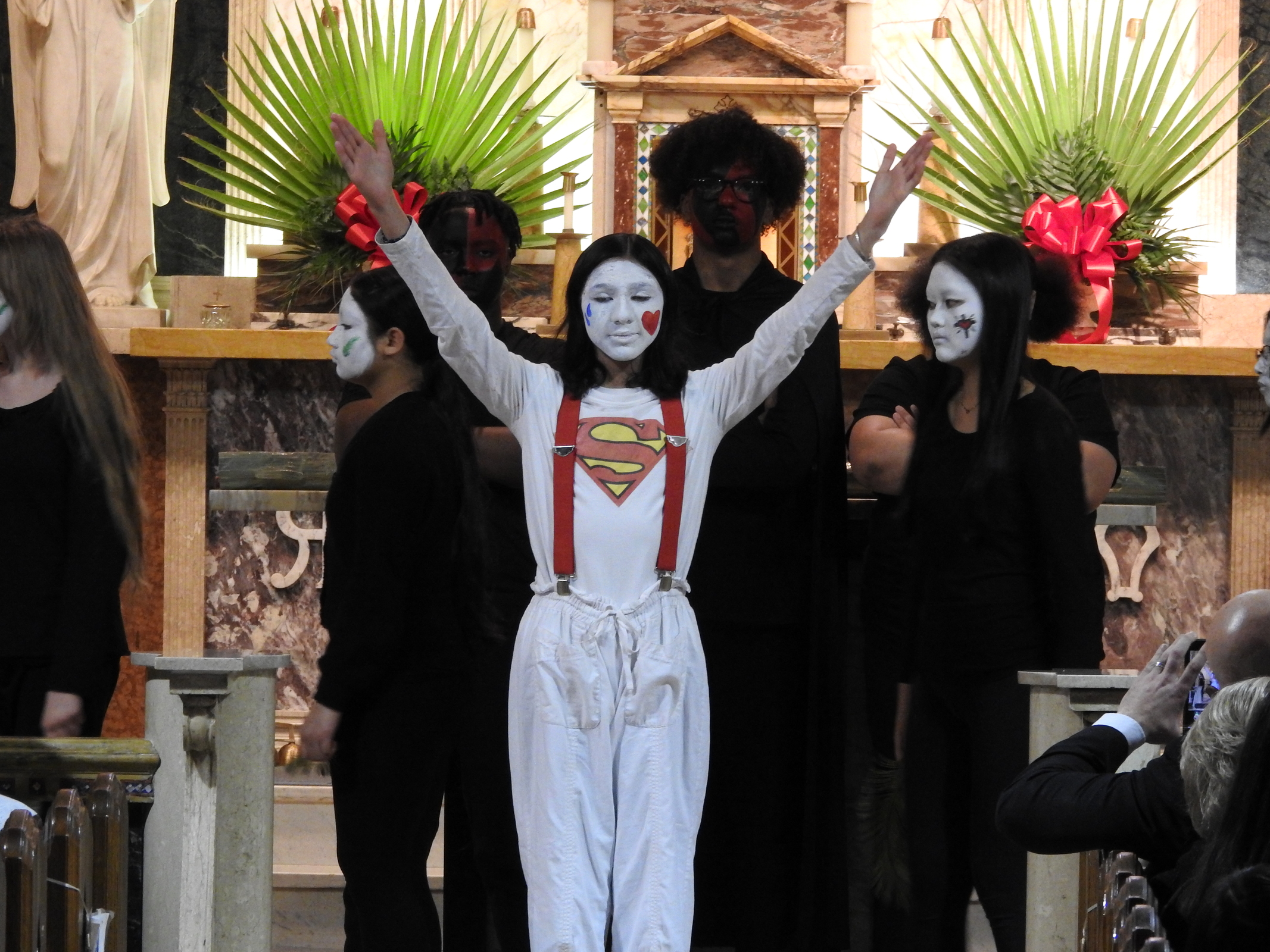The students moved quietly and deftly into place as Jesus appeared, dressed in white with a Superman-like emblem on the shirt.