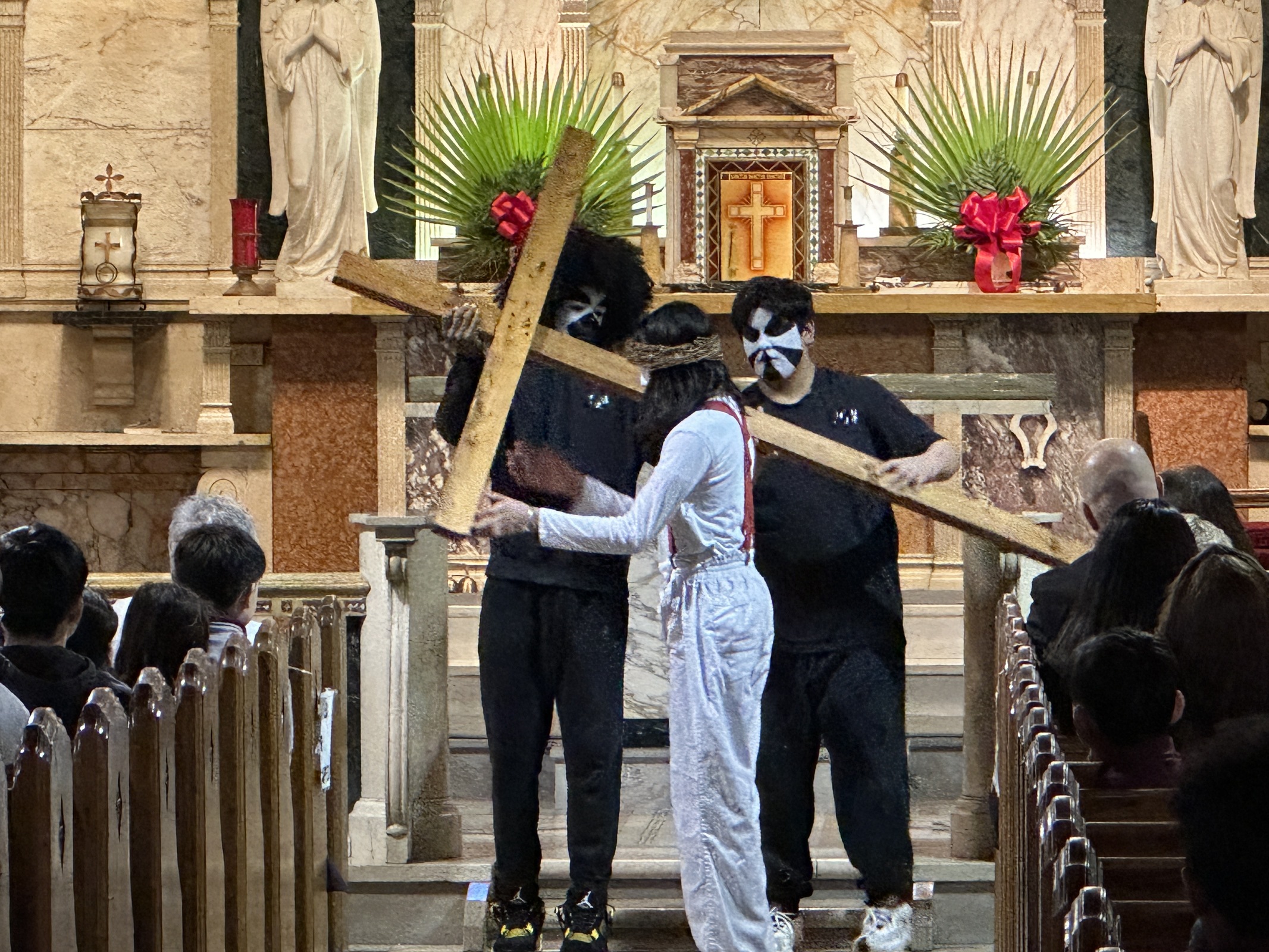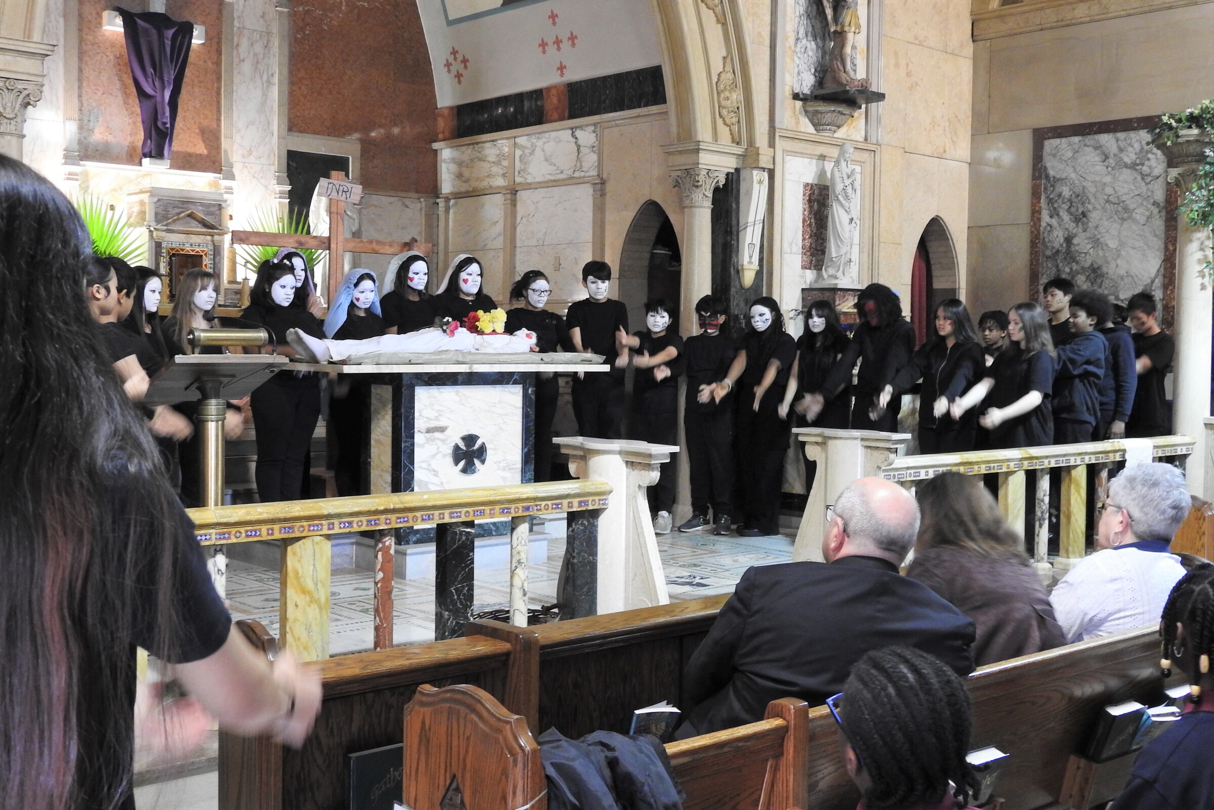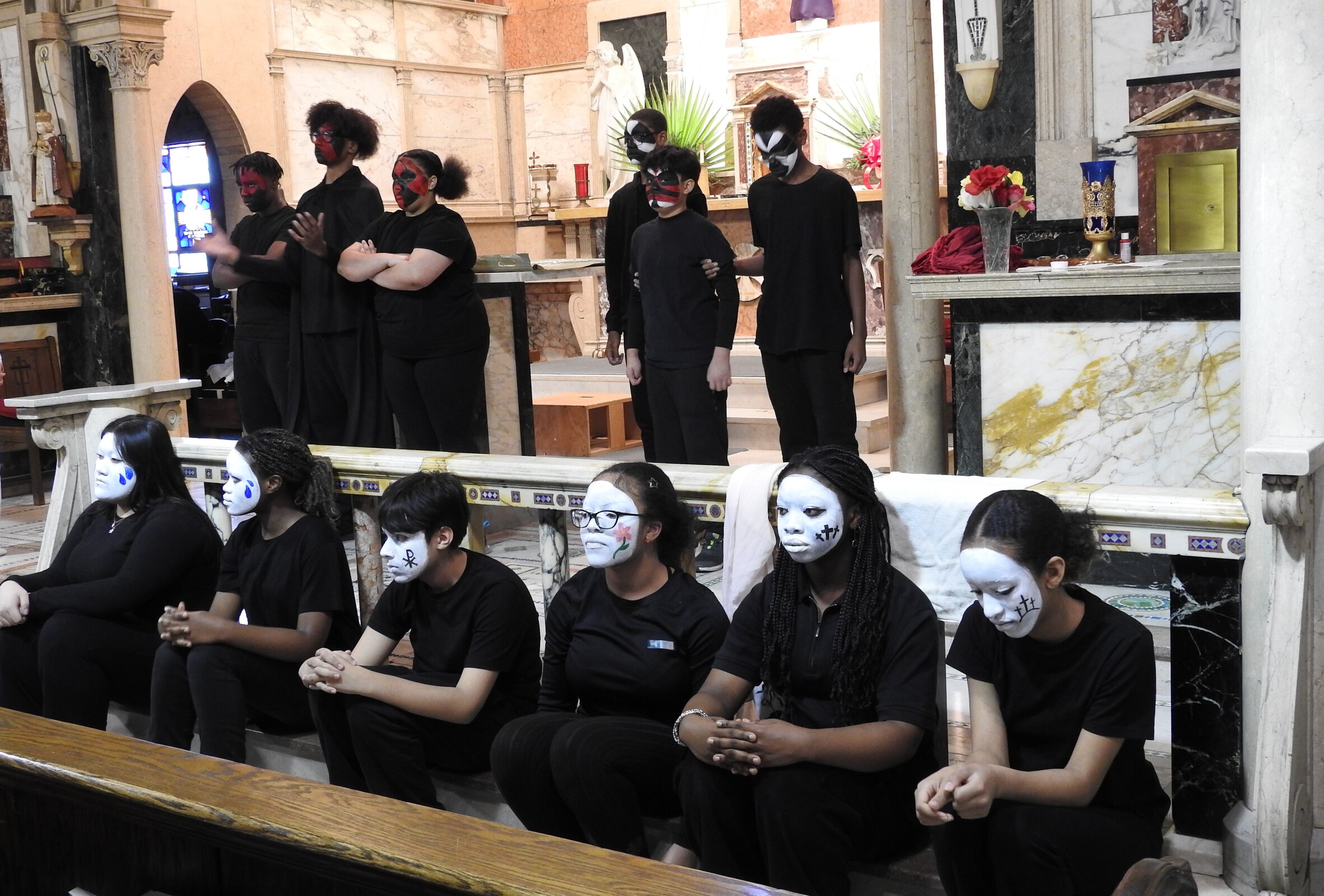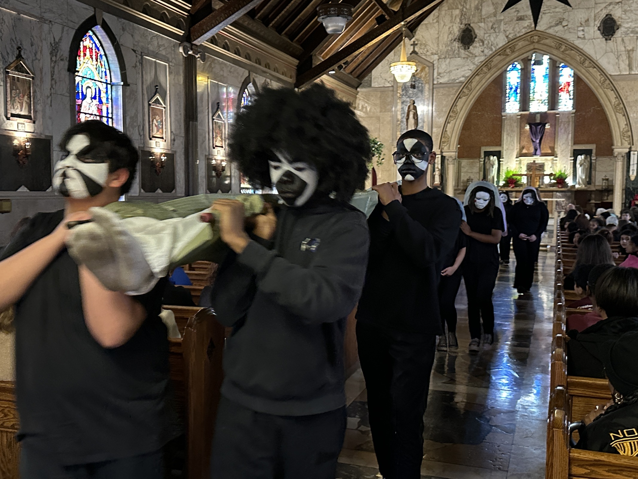 The entire student body filed quietly into the church in anticipation of the event. Lights were dim as the performers – dressed in black with their faces painted either stark white or with a pattern to depict their roles. They processed up the main aisle and place props for the program – including “nails,” a hammer, a cross, a crown of thorns and veils for Mary, Jesus’ mother, and the women of Jerusalem – in front of the church. Silently, the student performers took their places around the church. Some were positioned in pews throughout the church and recited parts of the story as it began.