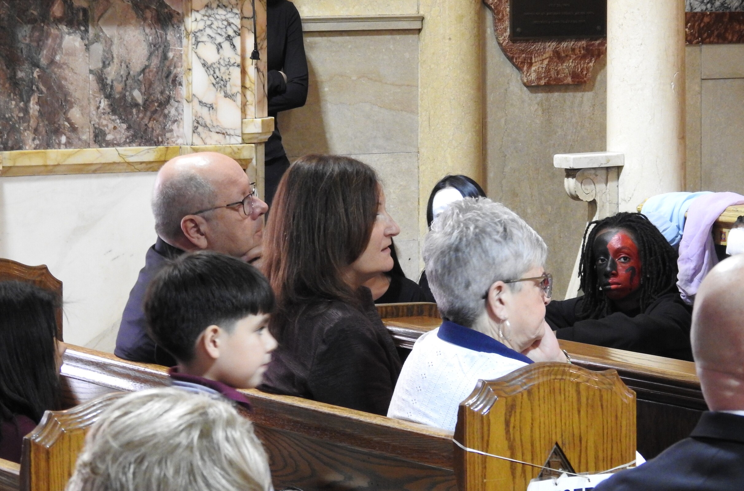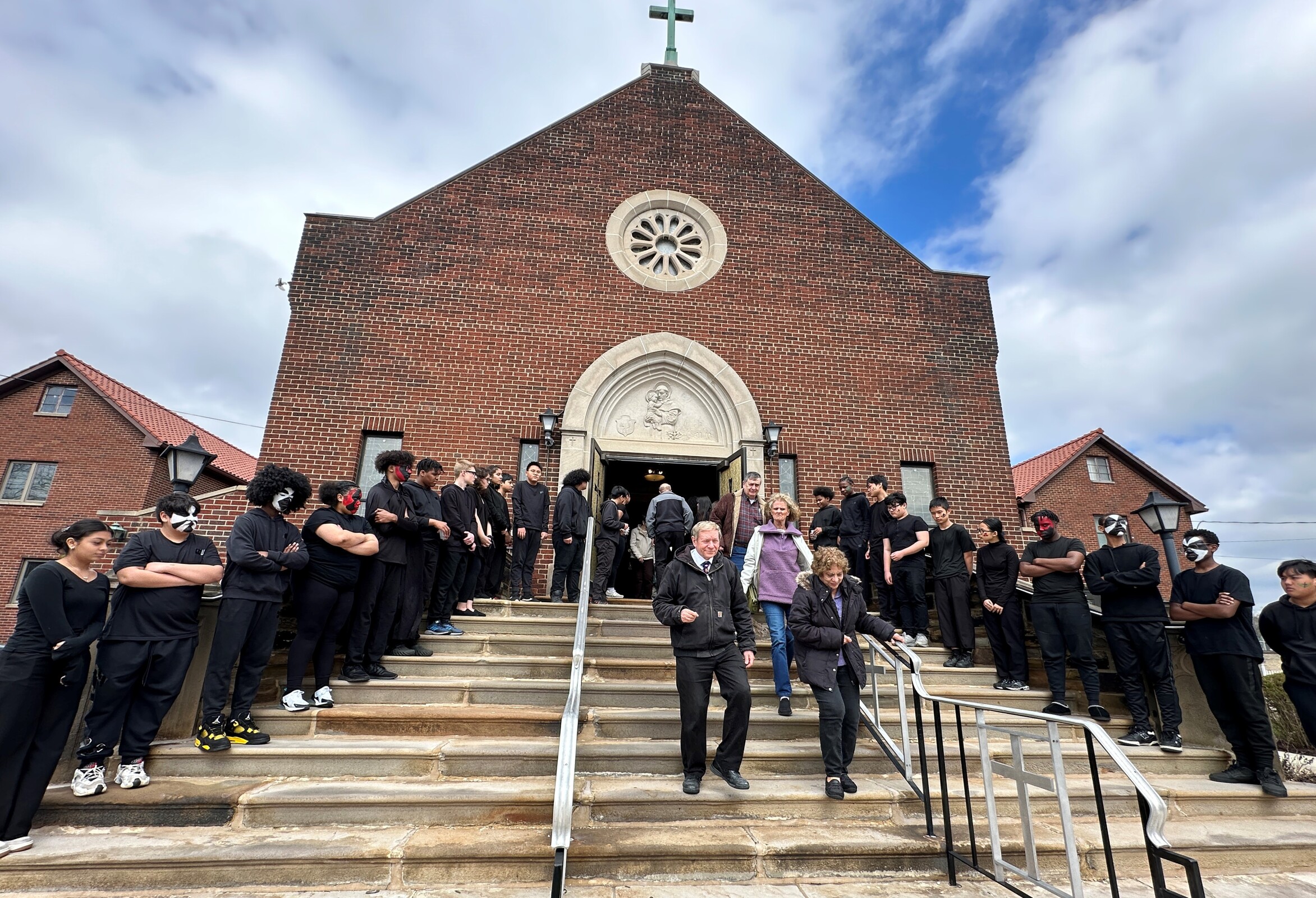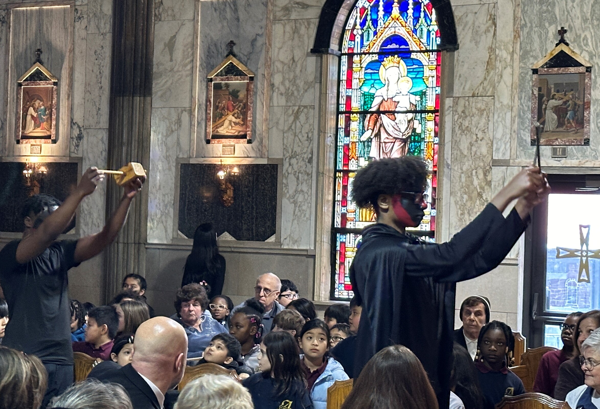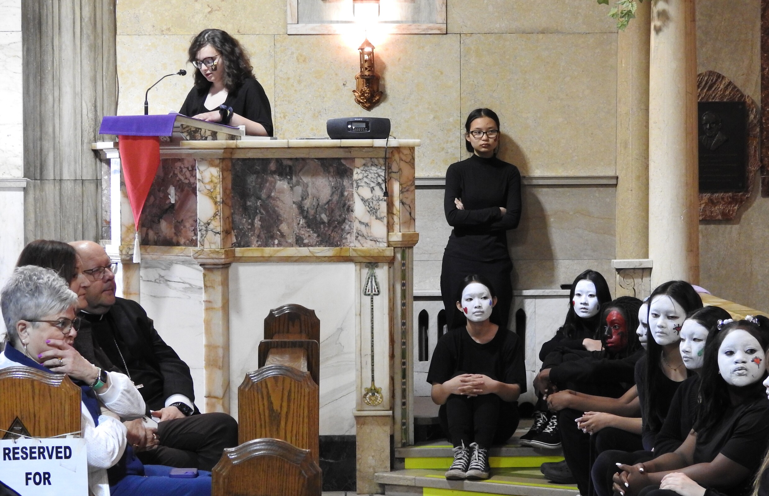 The entire student body filed quietly into the church in anticipation of the event. Lights were dim as the performers – dressed in black with their faces painted either stark white or with a pattern to depict their roles. They processed up the main aisle and place props for the program – including “nails,” a hammer, a cross, a crown of thorns and veils for Mary, Jesus’ mother, and the women of Jerusalem – in front of the church. Silently, the student performers took their places around the church. Some were positioned in pews throughout the church and recited parts of the story as it began.
