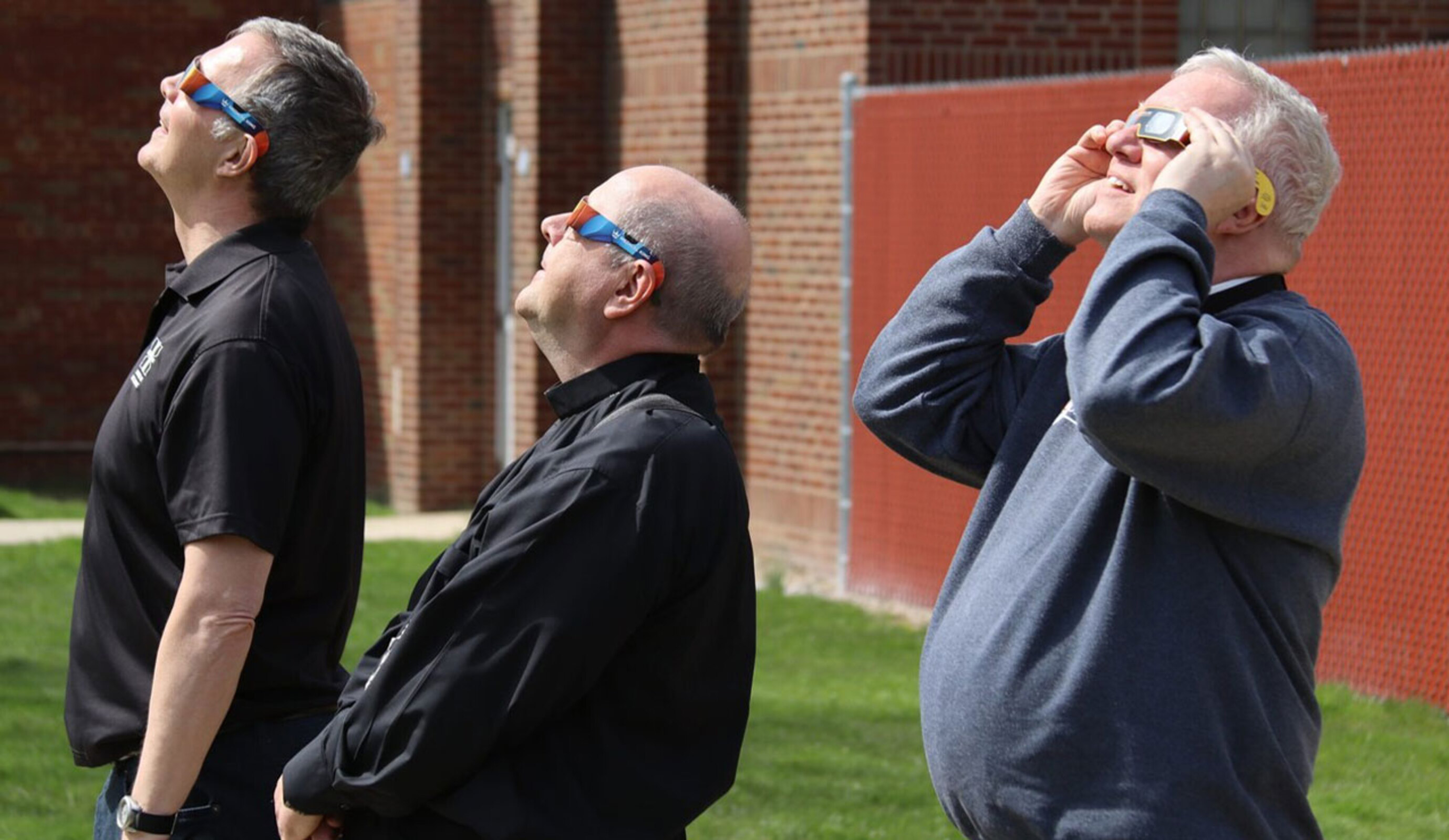 The three bishops donned their protective eclipse glasses to gaze at the sun as it was covered completely by the moon.