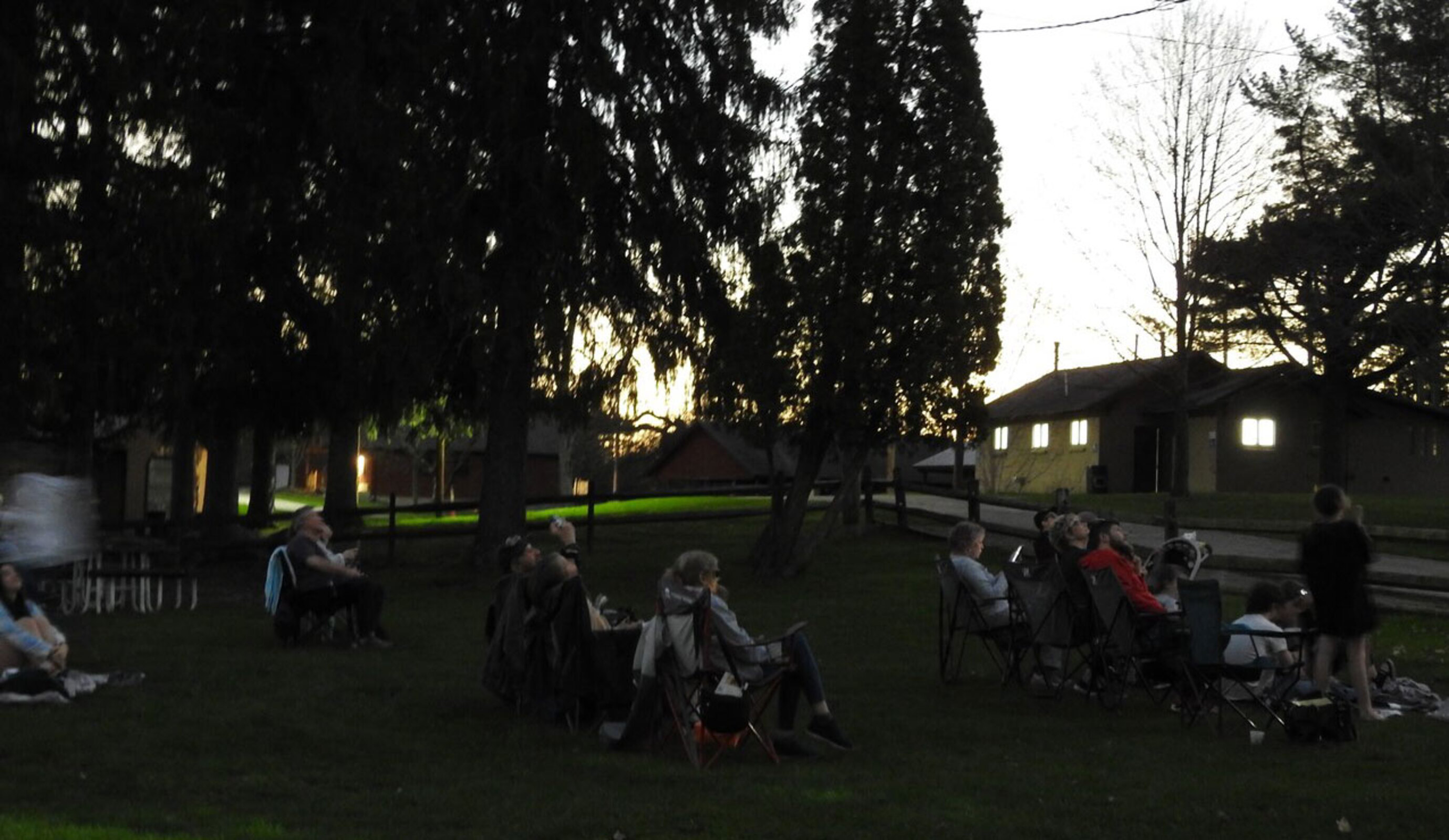 Some people grabbed a jacket or sweater at 3:08 p.m., since the temperature had dropped nearly 10 degrees in just a few minutes. By 3:10 p.m., it was quite dark and lights with sensors were triggered to turn on around the camp’s main path. Totality arrived at 3:13:45 p.m., lasting 3 minutes and 49 seconds. The eclipse concluded at 4:29 p.m.