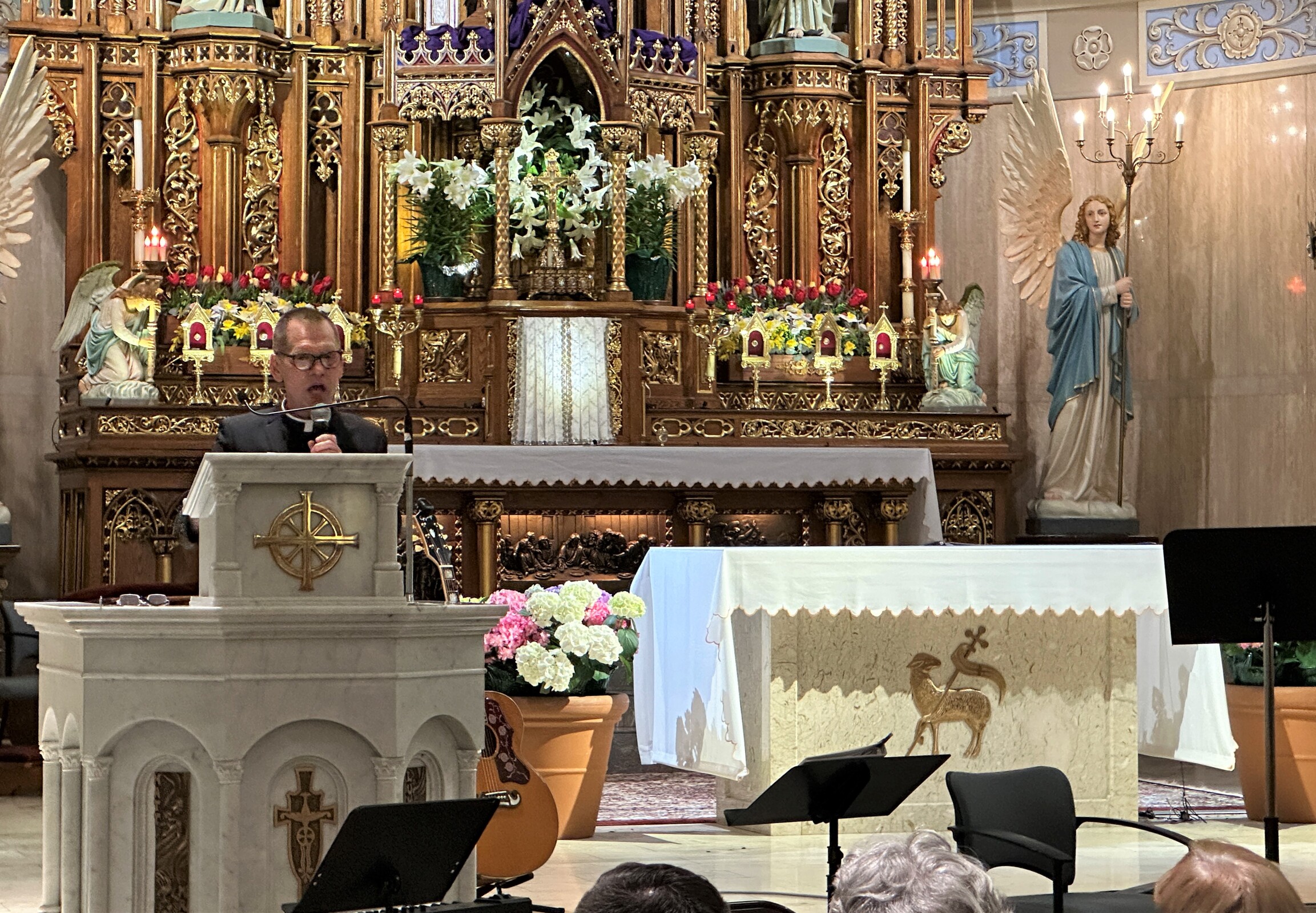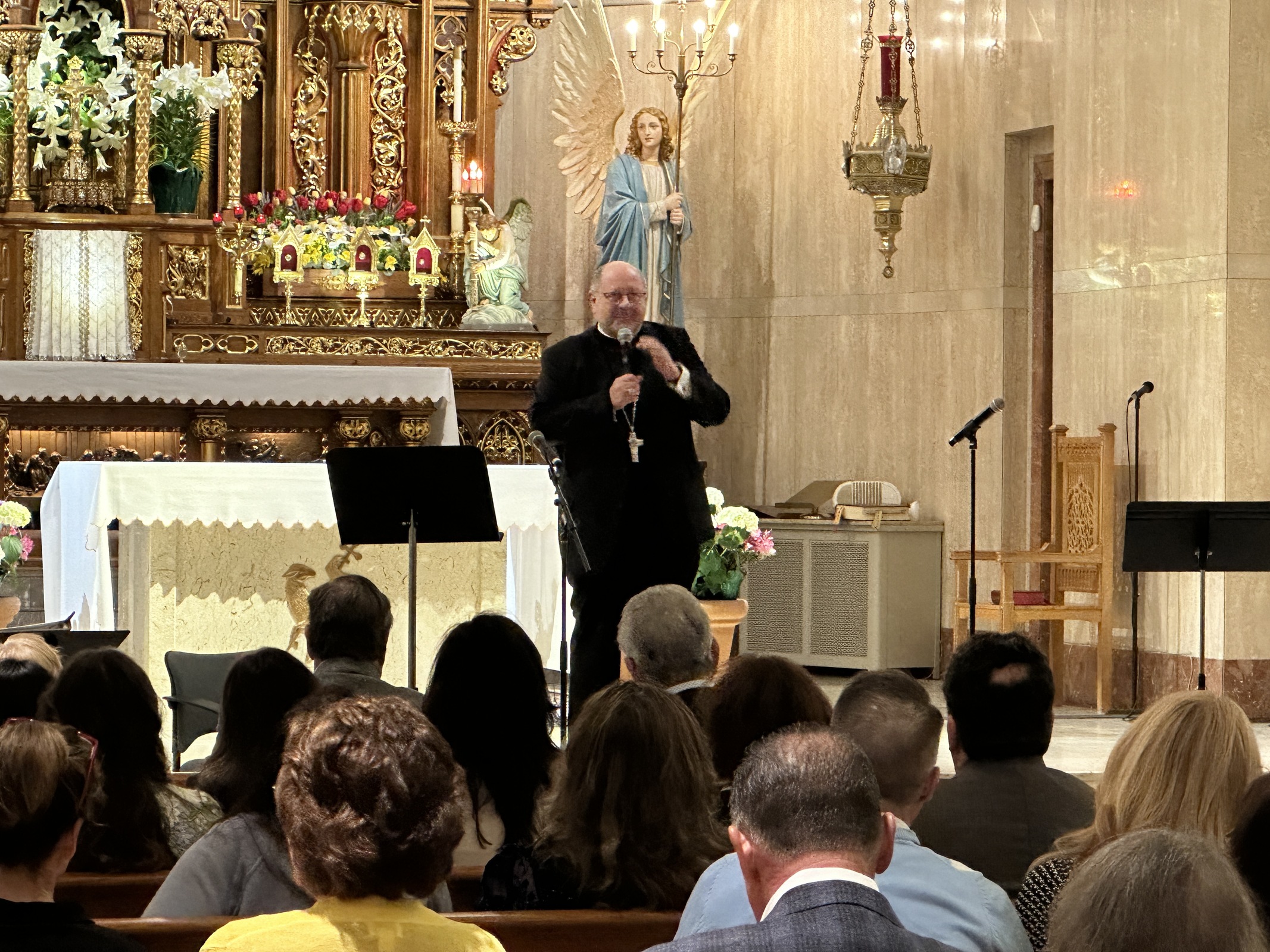 Father James Roach, St. John Cantius pastor, welcomed attendees and offered a history of the church, which was established in 1898 to serve Polish immigrants in the area. The church is more than just a building, he said, noting it’s been called “a living monument to the craftsmanship and devotion of its creators.” He also played a hymn on the newly restored organ, demonstrating another feature of the church.