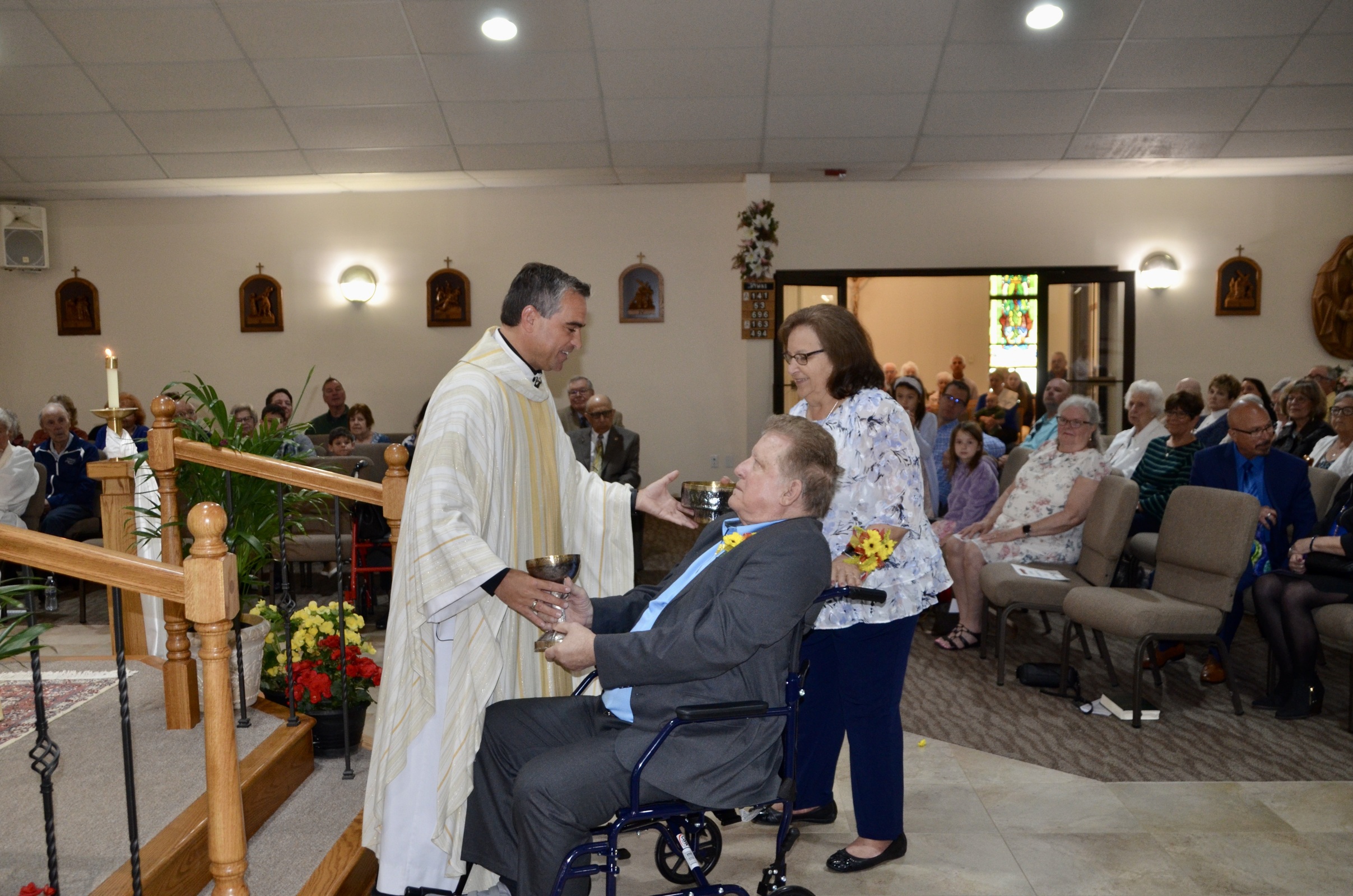 At the Mass, Bishop Gries used a new chalice and paten designed by Father Denk and crafted by local jeweler Don Basch.