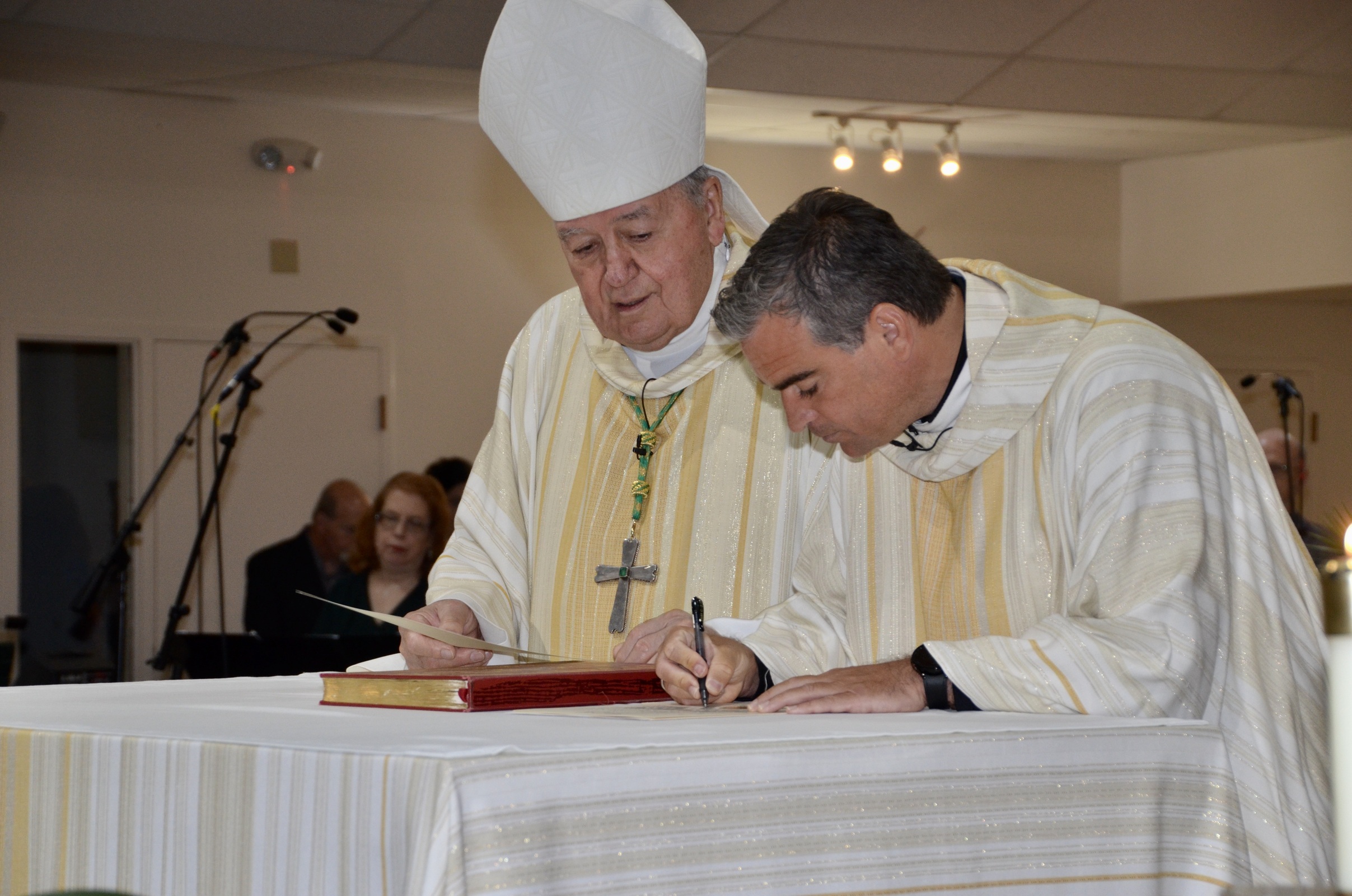 The church was filled to capacity for the liturgy, during which Father Denk took an oath pledging fidelity to Bishop Edward Malesic and promising to follow and uphold the teachings of the Catholic Church. He also signed the official diocesan documents for his new office. In addition, he was greeted by and pledged to seek and follow the counsel of the parish staff and the finance and pastoral councils.