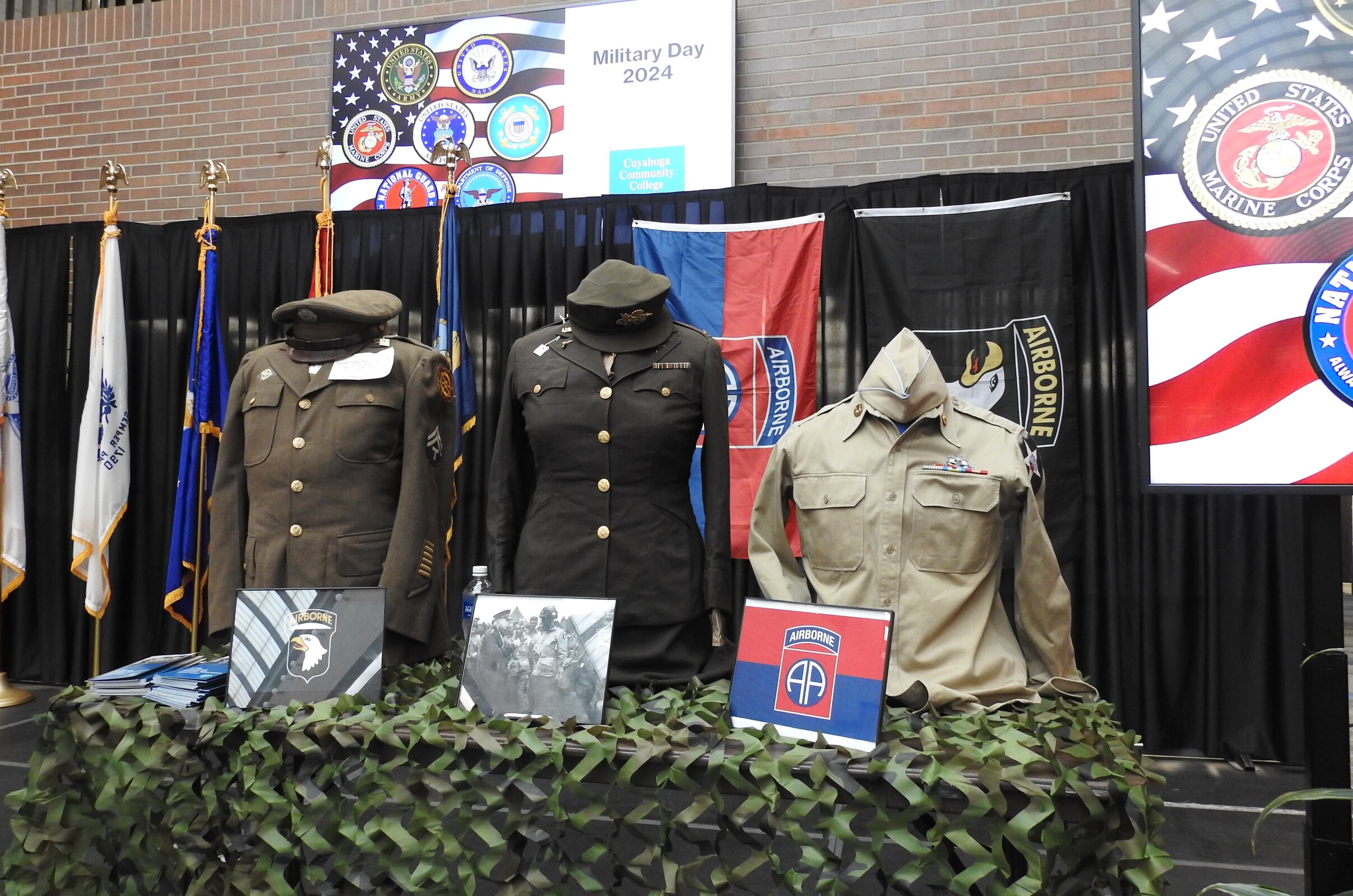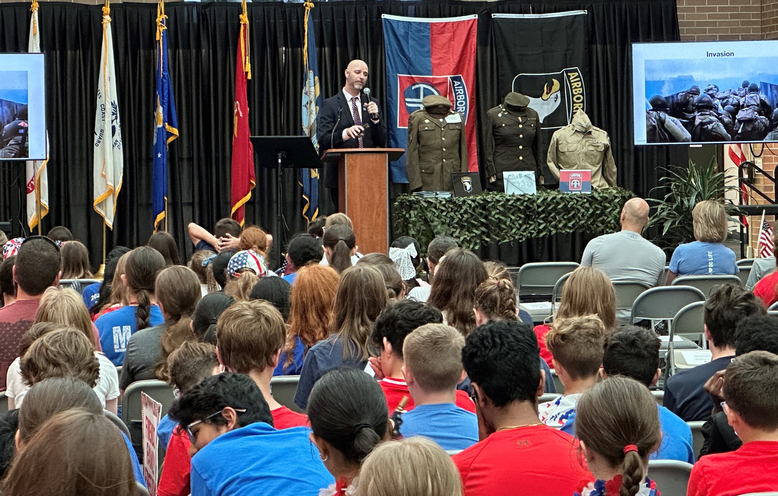 The important role of paratroopers (airborne troops) also was explained by Miller. He used video clips and historic photos to illustrate his presentation. A display of flags from the various branches of the military and some World War II era uniforms were displayed on the stage.