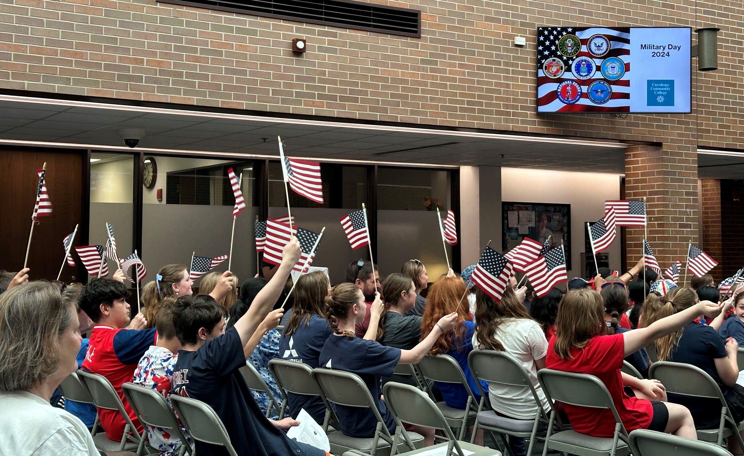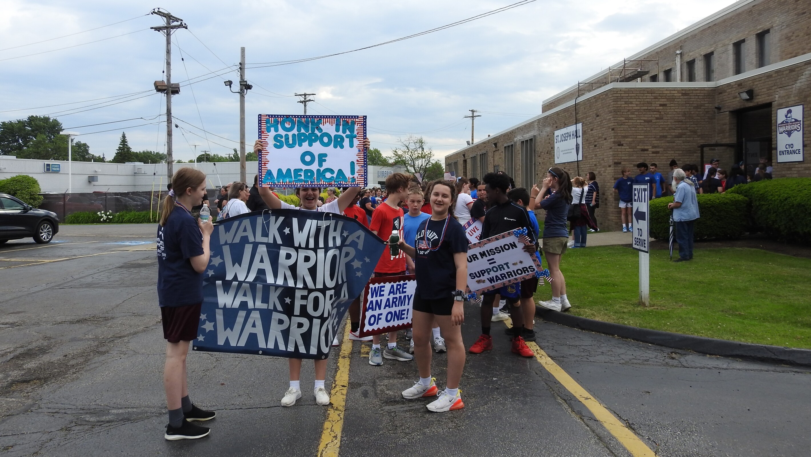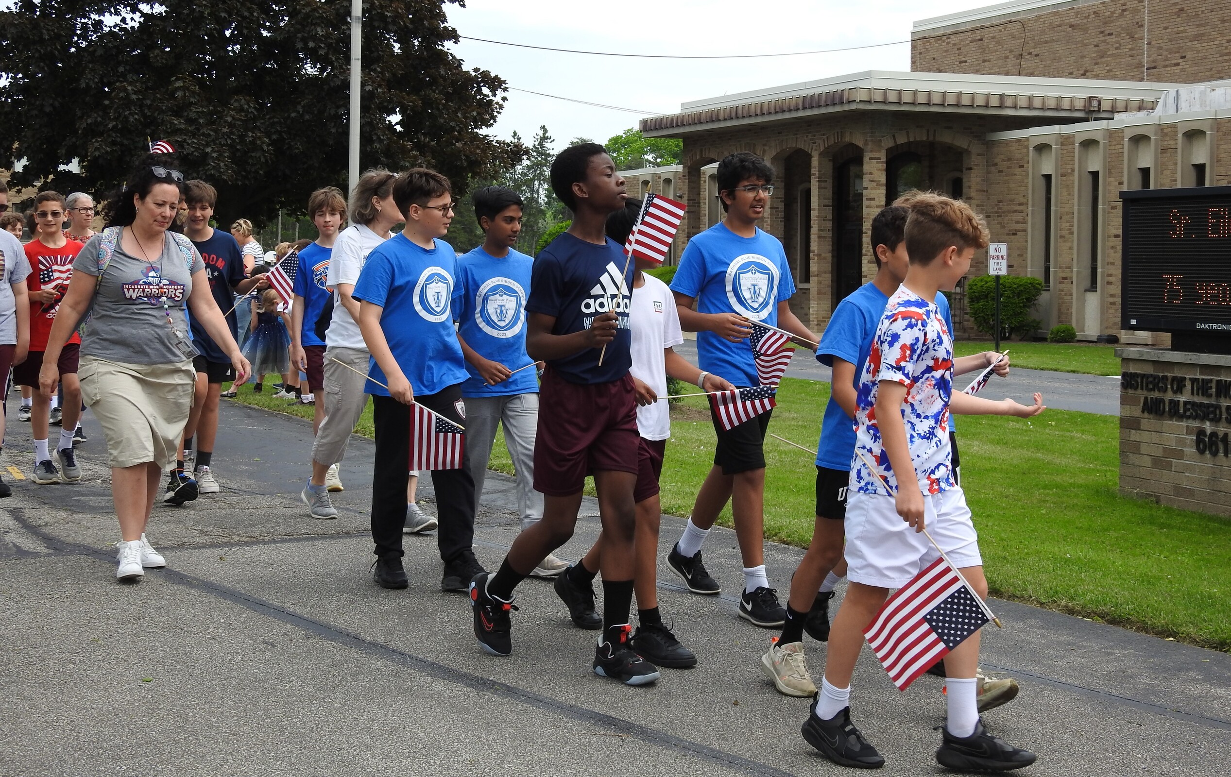 Students received flags and signs as they lined up for the second part of the Military Day activities: an approximately two-mile walk to Tri-C. They were joined by some of the veterans in attendance, some family members and few Sisters of the Incarnate Word and Blessed Sacrament, who sponsor IWA.
