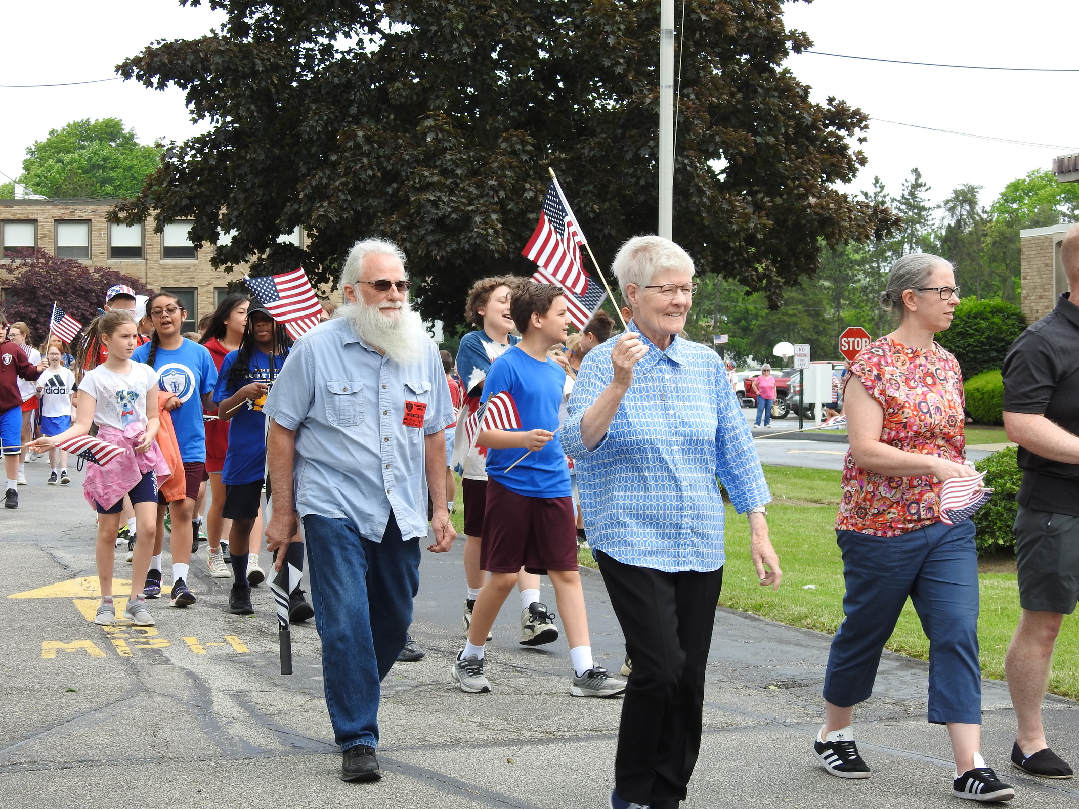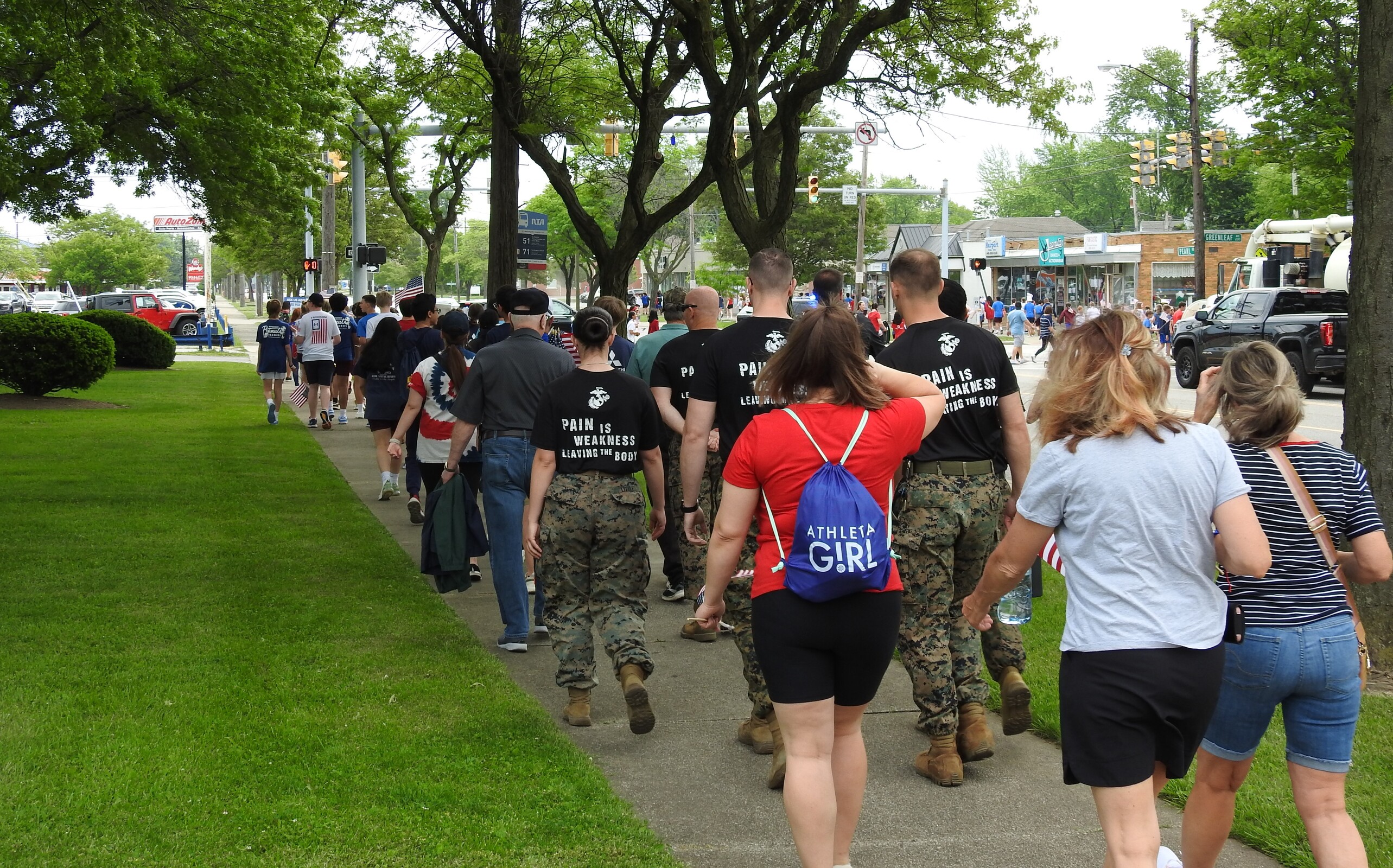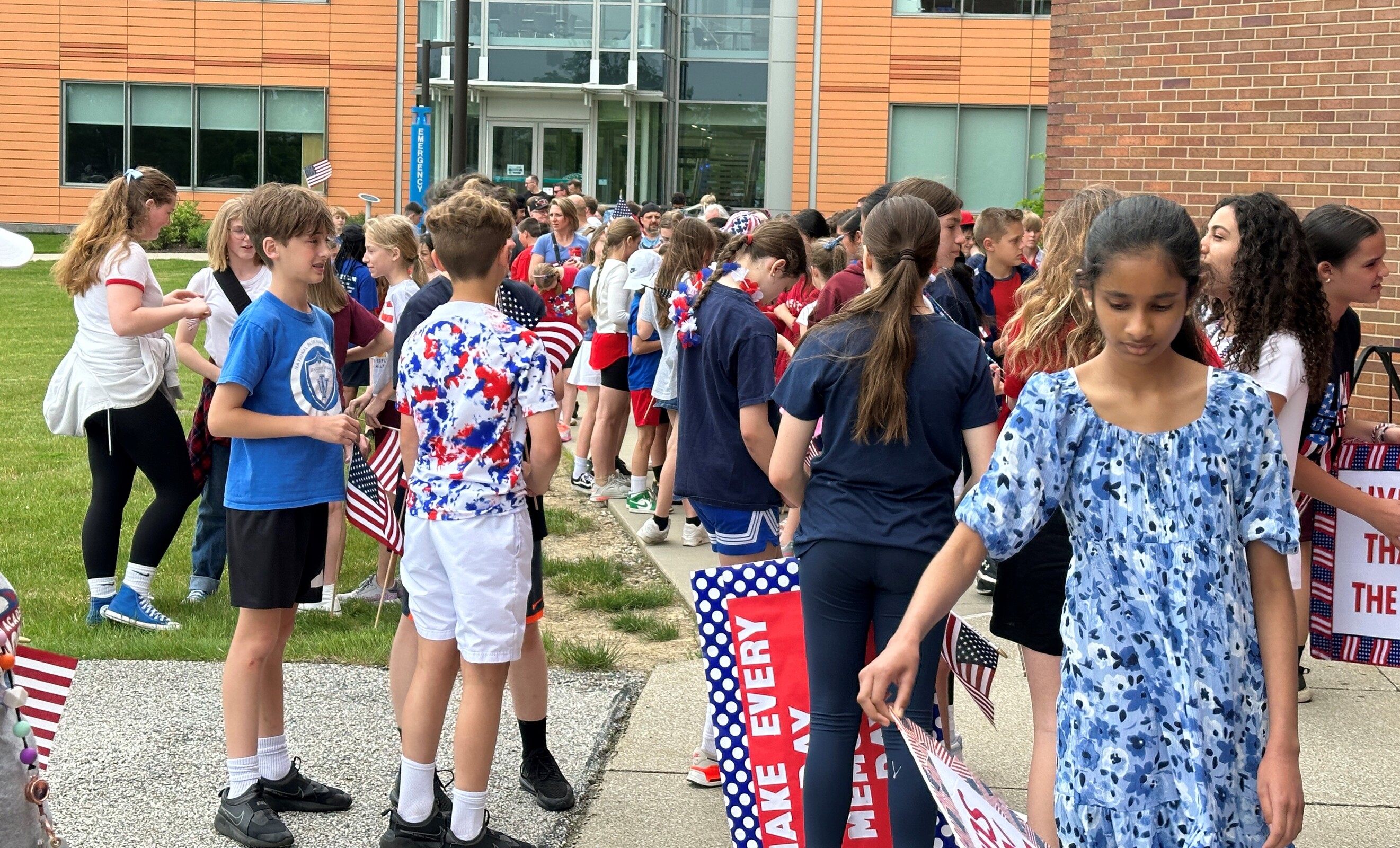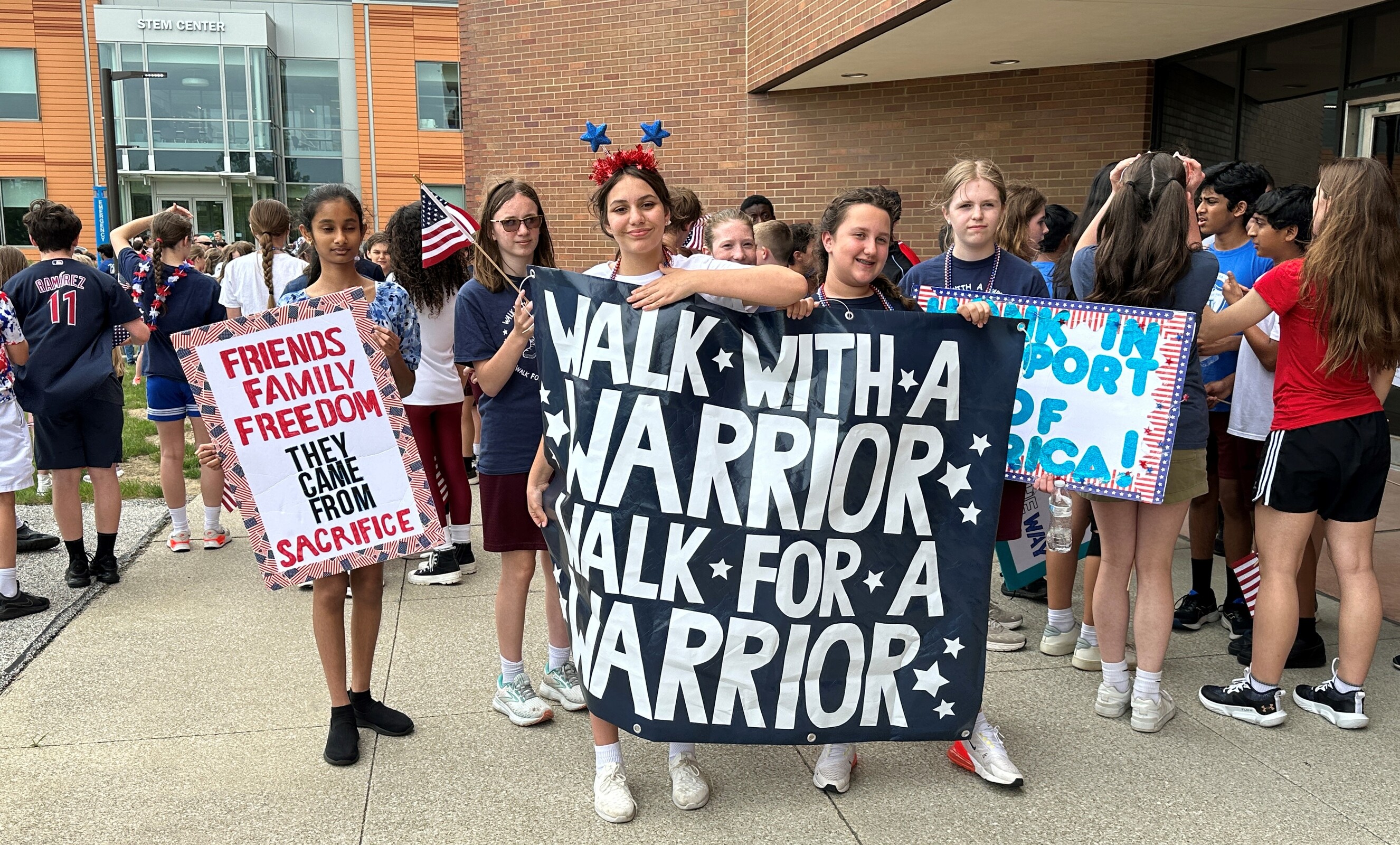 Students received flags and signs as they lined up for the second part of the Military Day activities: an approximately two-mile walk to Tri-C. They were joined by some of the veterans in attendance, some family members and few Sisters of the Incarnate Word and Blessed Sacrament, who sponsor IWA.