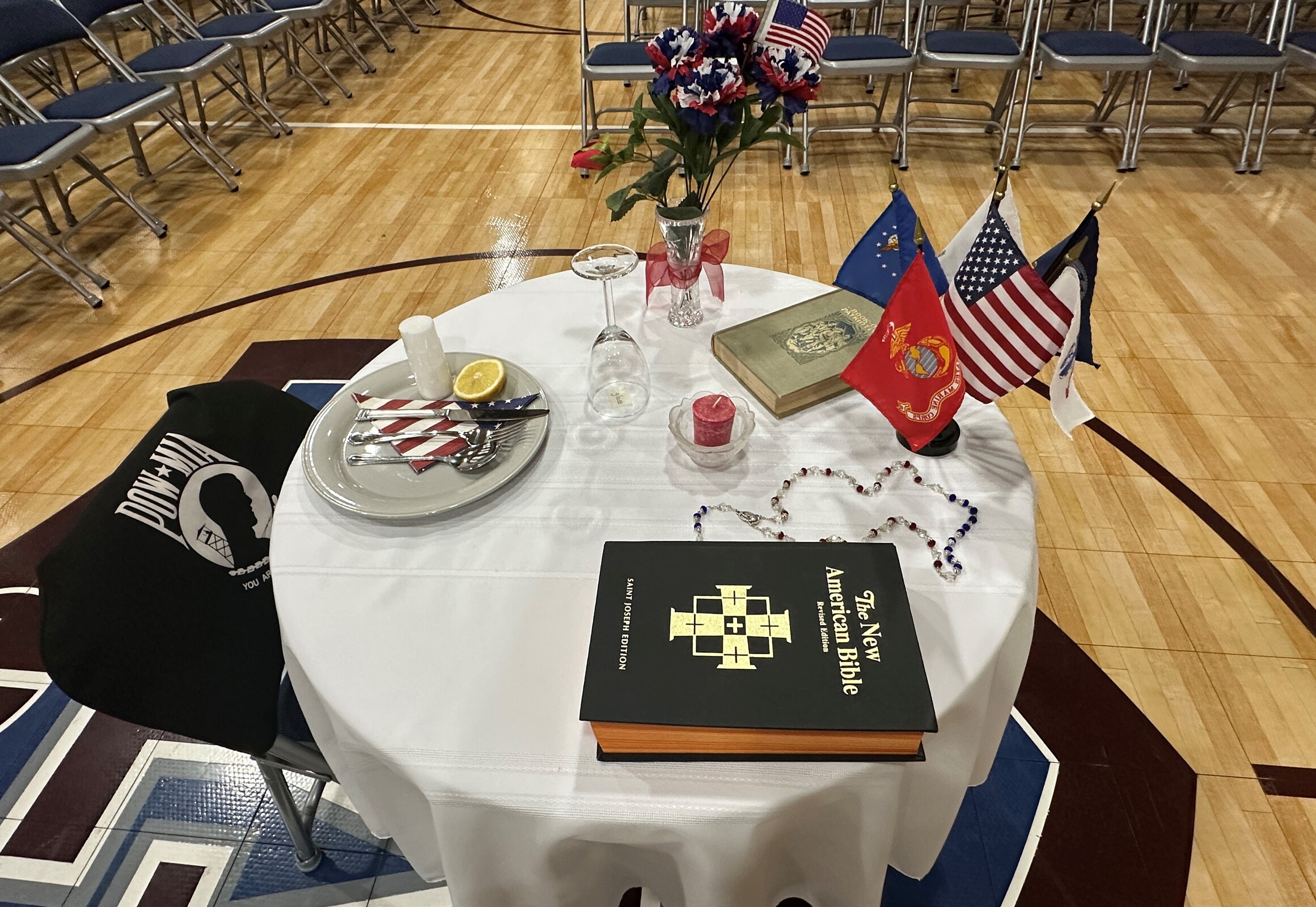 Seventh-graders then set the POW/MIA table while a member of the 3/25 Marines from Brook Park explained the symbolism. The table is a reminder that the POWs/MIAs cannot join their families at the table, so a place is set in their honor. The table was set with a place setting, a lemon, salt, inverted glass, flowers, a Bible and an empty chair with a POW/MIA covering.
