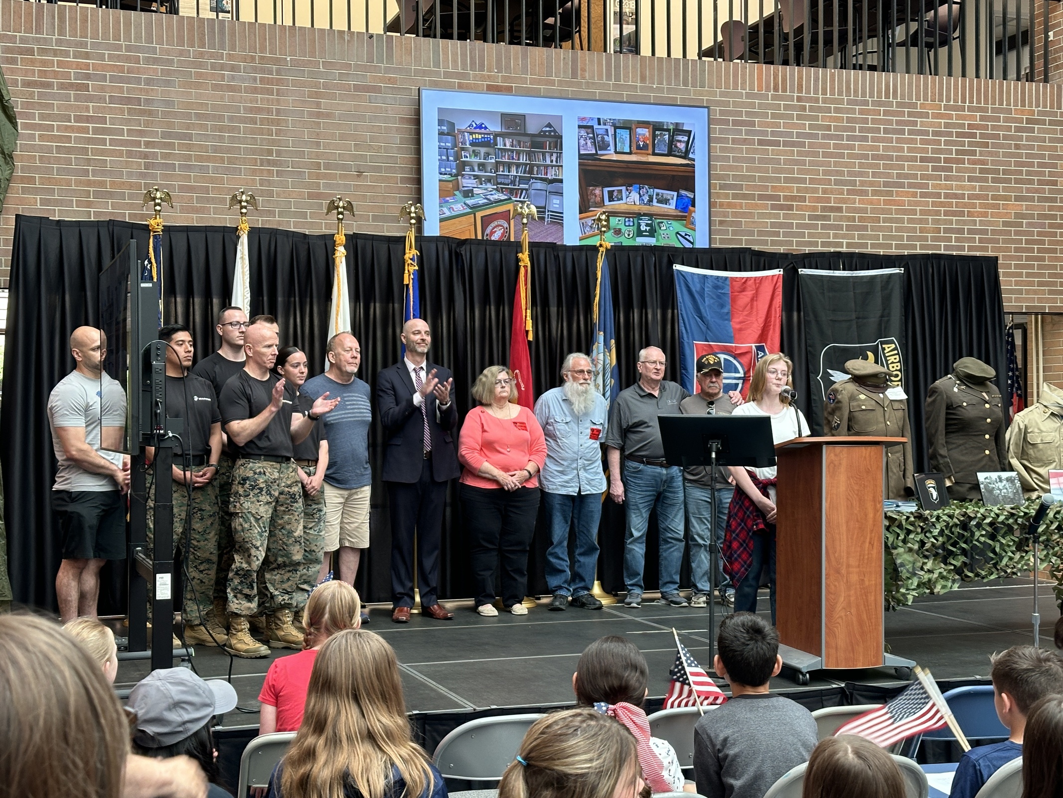 After a question and answer session, Miller invited veterans in the audience onto the stage for a group photo.