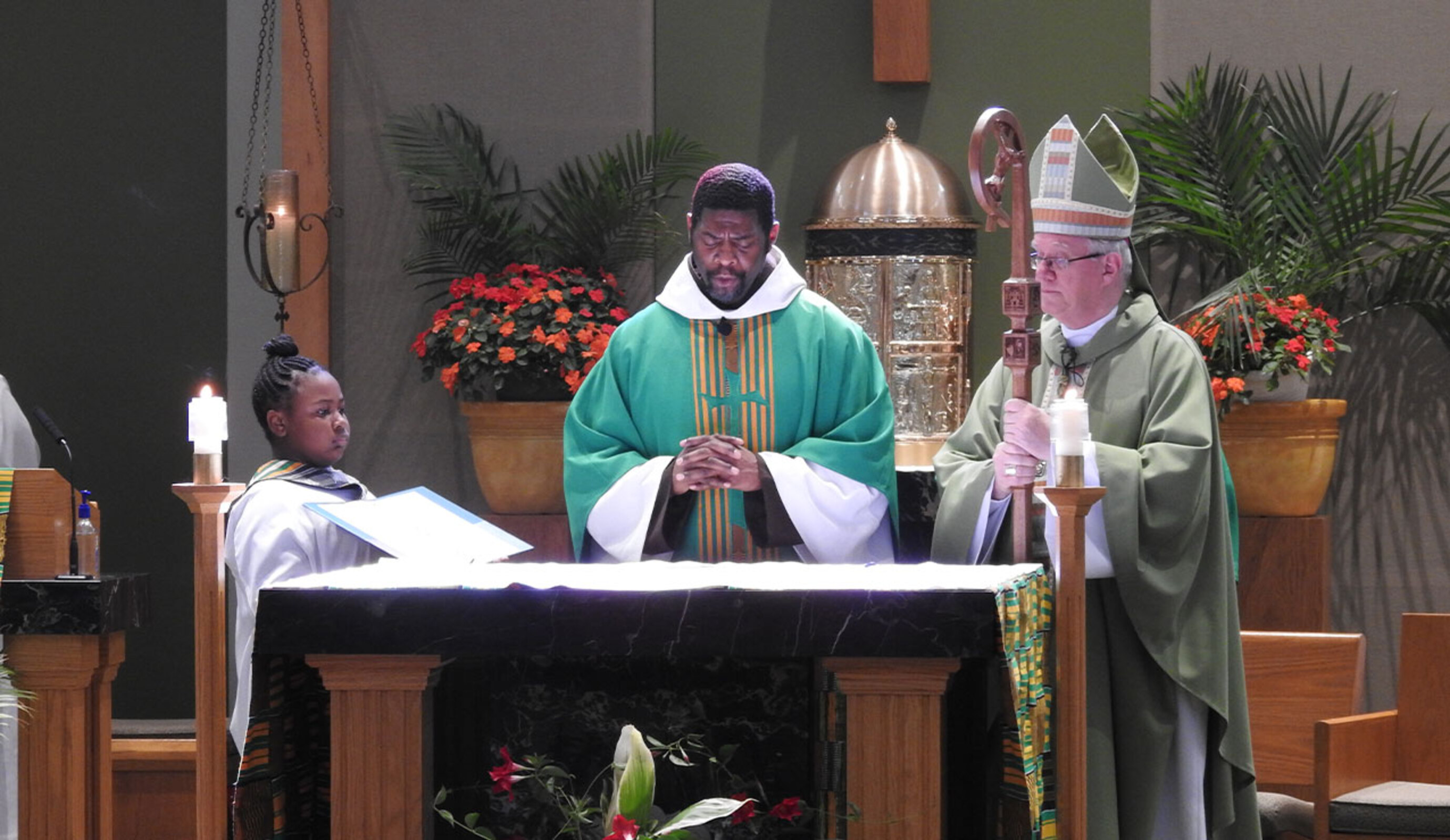 “Good morning, church,” said Auxiliary Bishop Michael Woost as he greeted the faithful gathered Sept. 15 at St. Agnes/Our Lady of Fatima Parish in Cleveland. “I am so happy to be here. I thank God for our many gifts, including the gift of Father James (Watson, OFM Cap),” he added, referring to the Franciscan friar he was about to install as pastor.