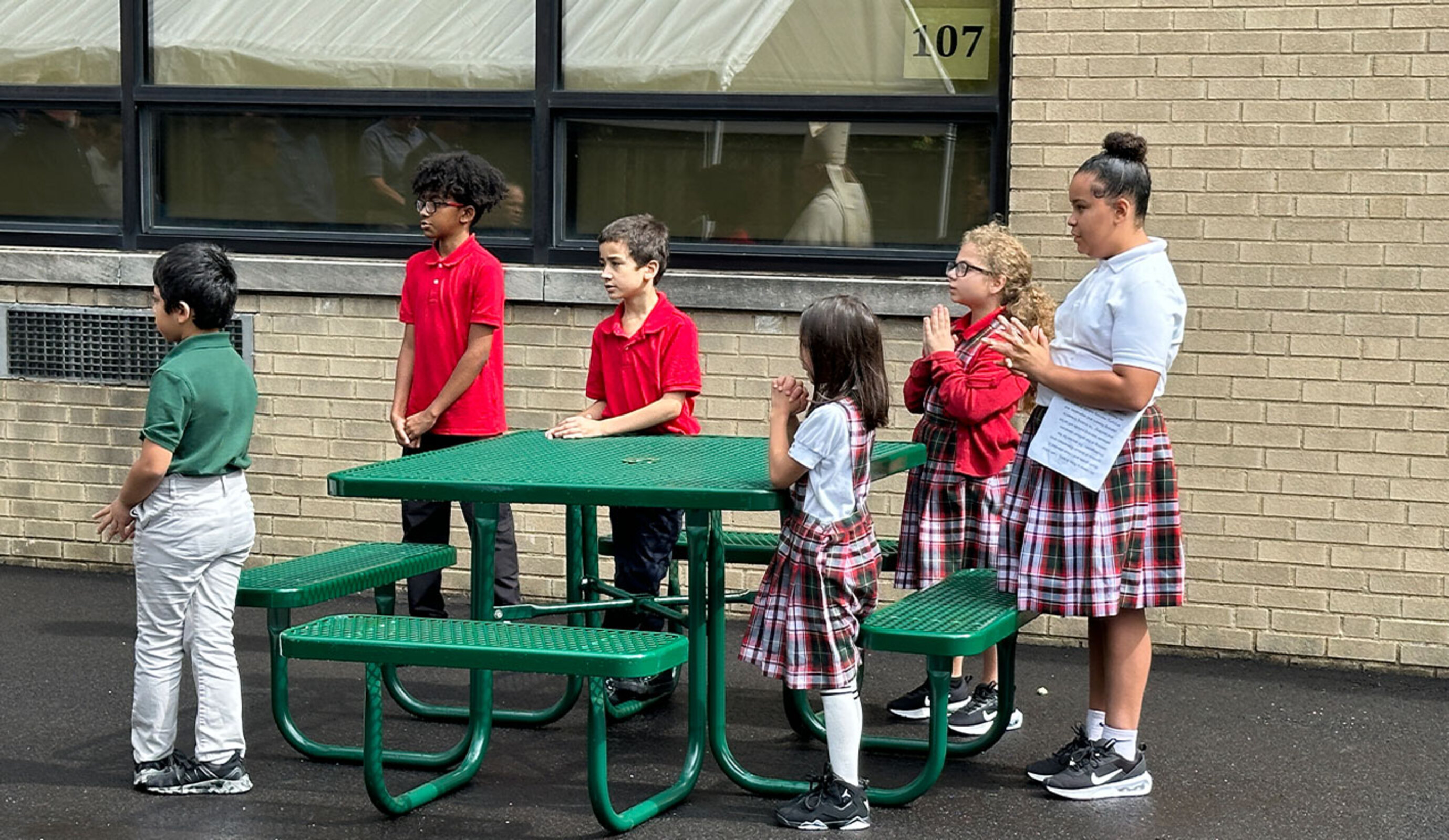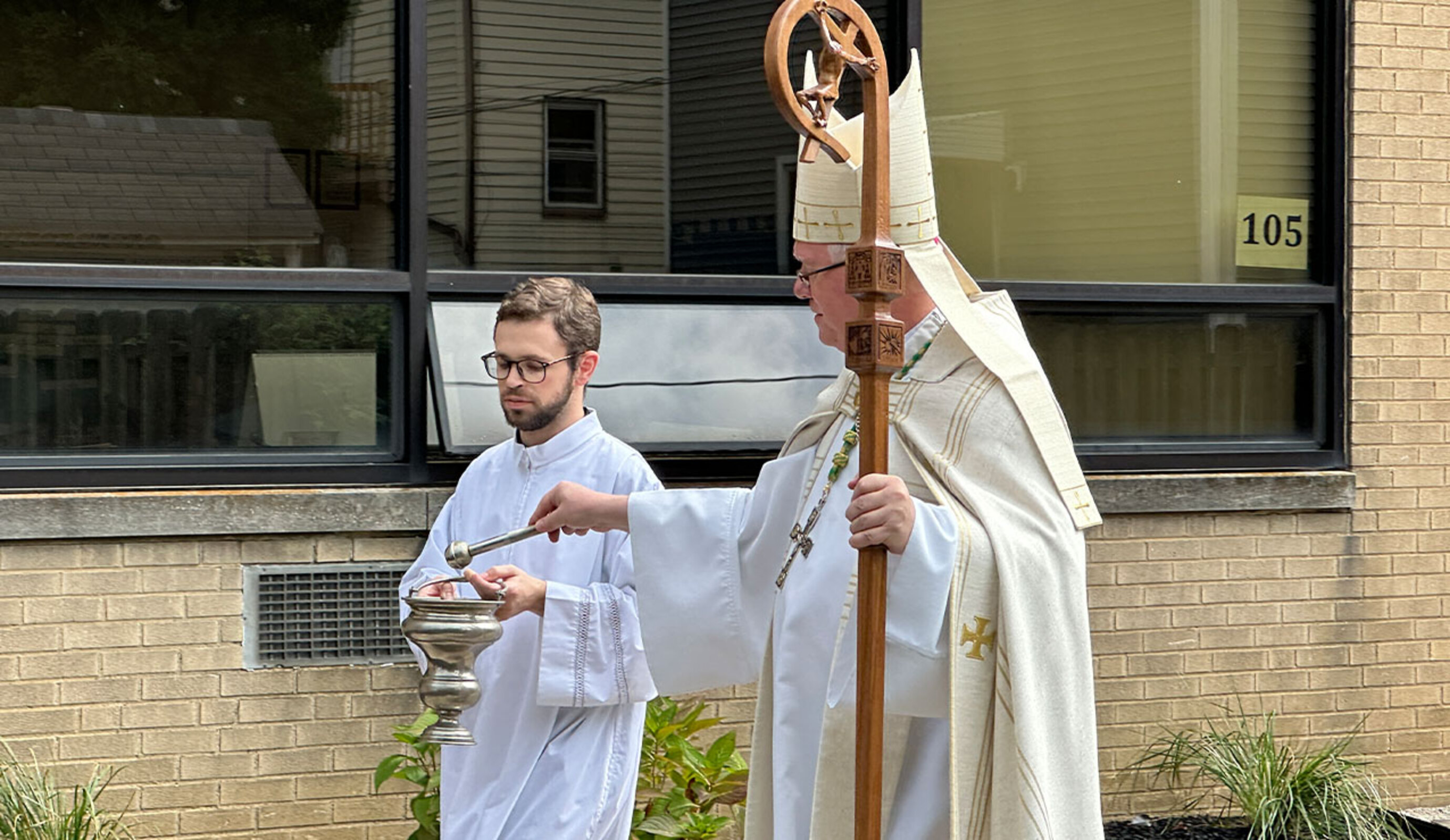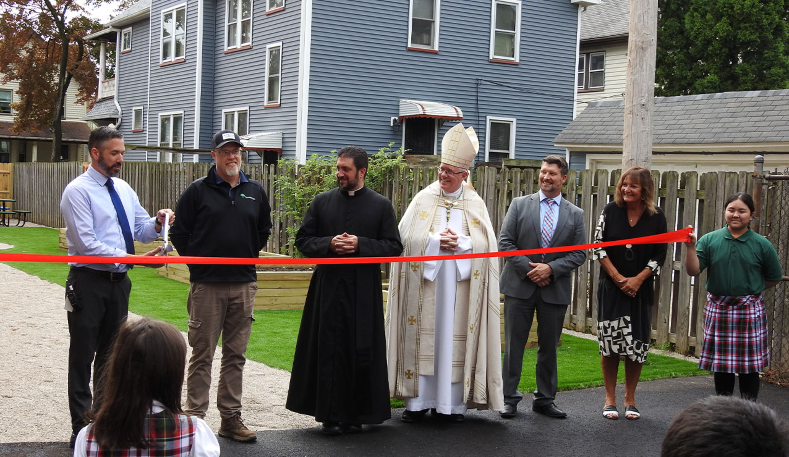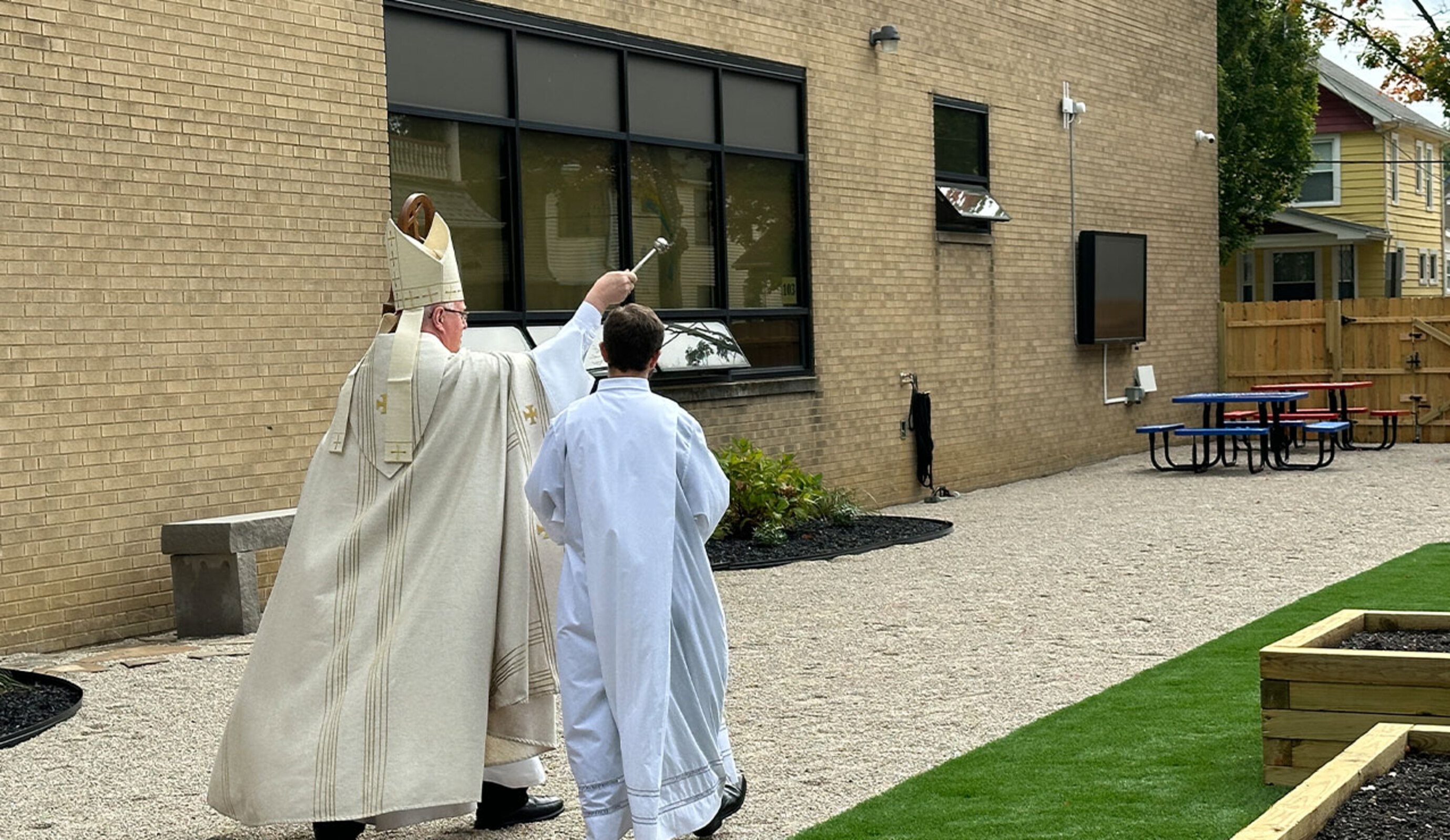 Although the morning began with some much-needed rain, the sun came out and blue skies prevailed as Auxiliary Bishop Michael Woost dedicated and blessed the new outdoor classroom at St. Ignatius of Antioch School on Cleveland’s West Side.