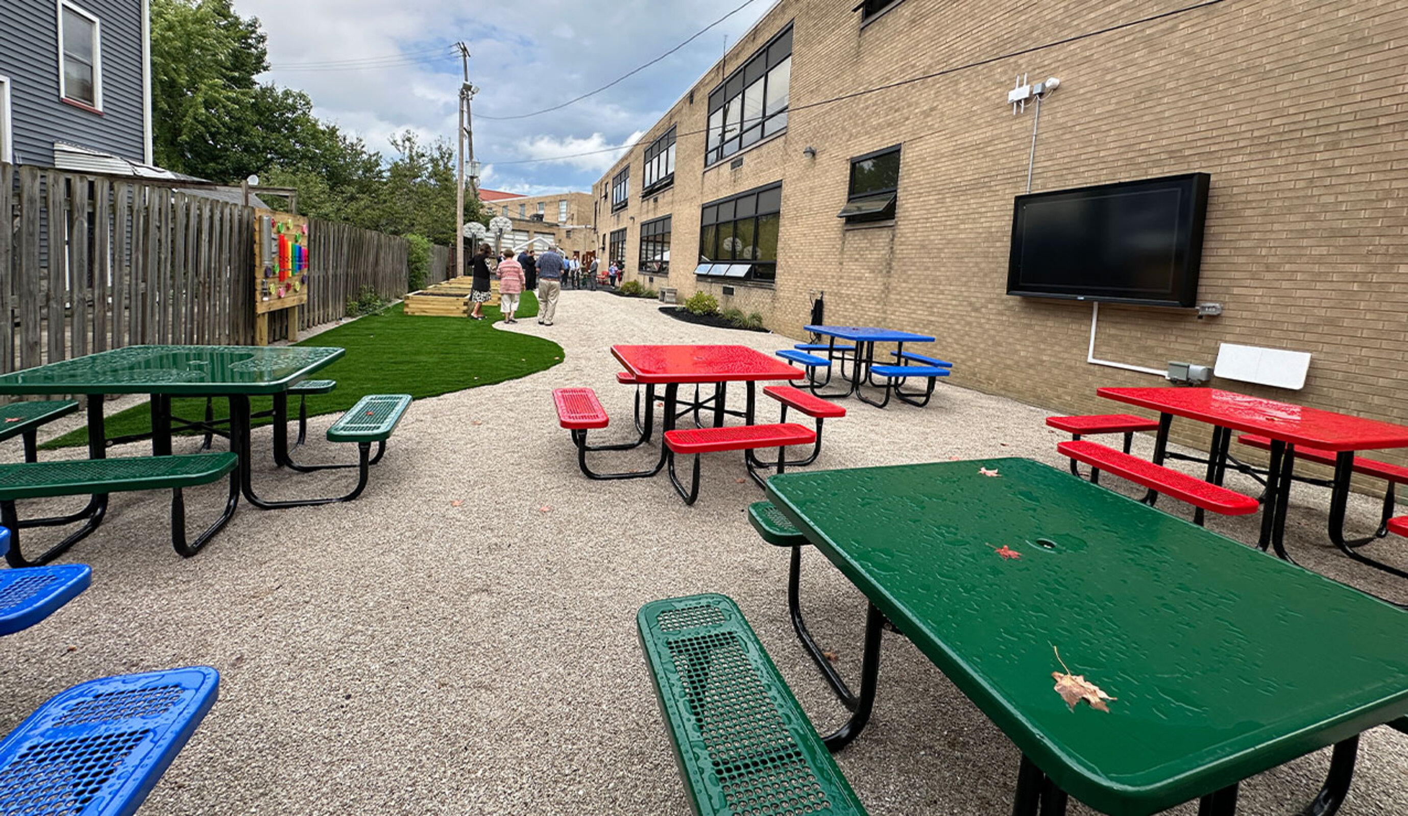 The new space includes raised garden beds where students can grow vegetables and flowers, a pollinator garden, a bench, an outdoor screen, several brightly colored tables, a sensory wall, a “Buddy Bench,” artificial turf and a gravel walkway. The space is tucked behind a sturdy, tall wooden fence and is accessible from the school building. Students can come outside to the classroom to finish their work, to write, journal, to read or for lessons.