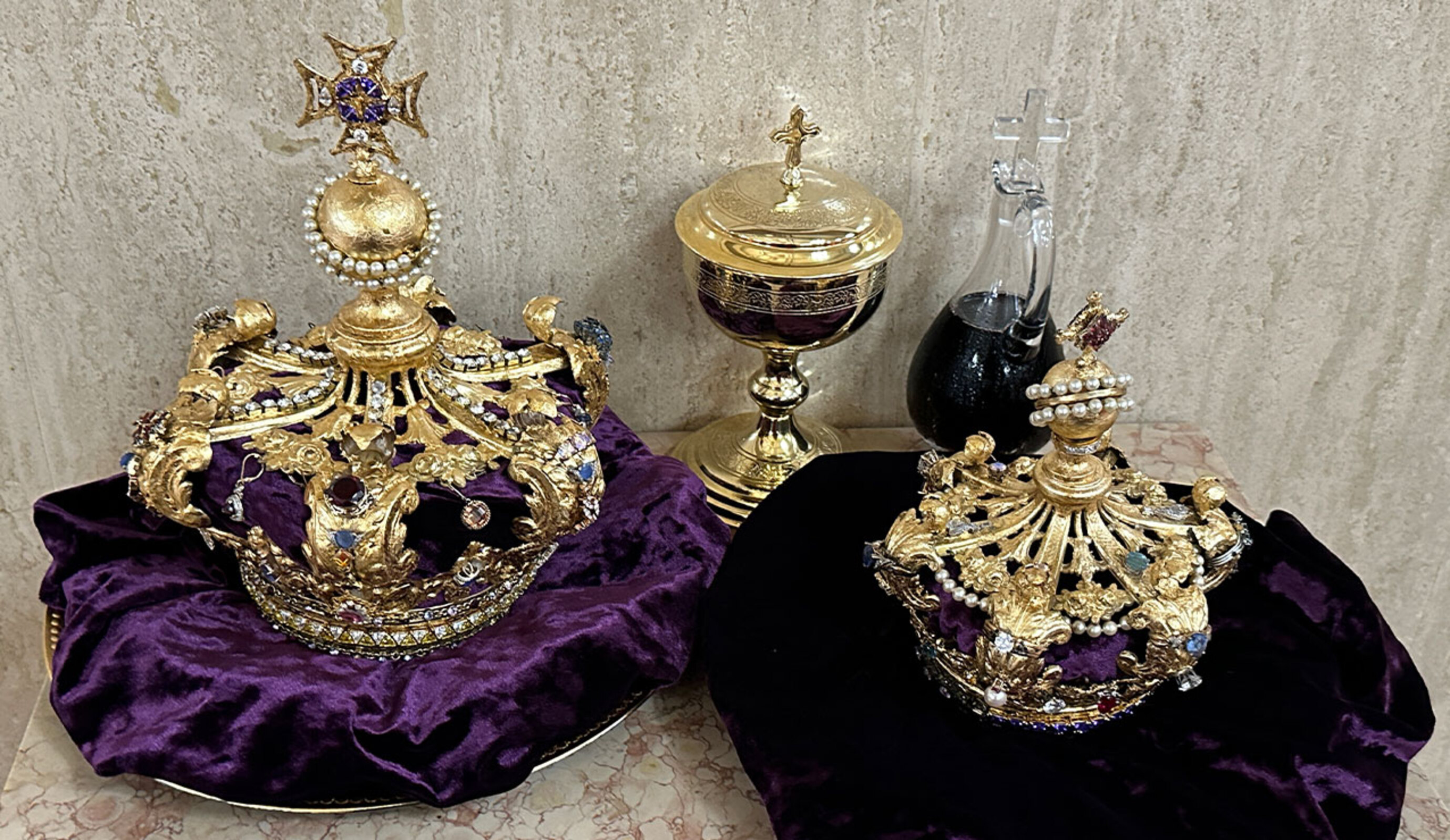 As part of the Mercedarians’ centennial celebration, Father James Mayer, St. Rocco pastor, arranged for the crowns to be refinished again, but this time with gold leaf. The crowns are also studded with pearls and gems from Father Mayer’s late mother’s jewelry, which was donated to the parish.