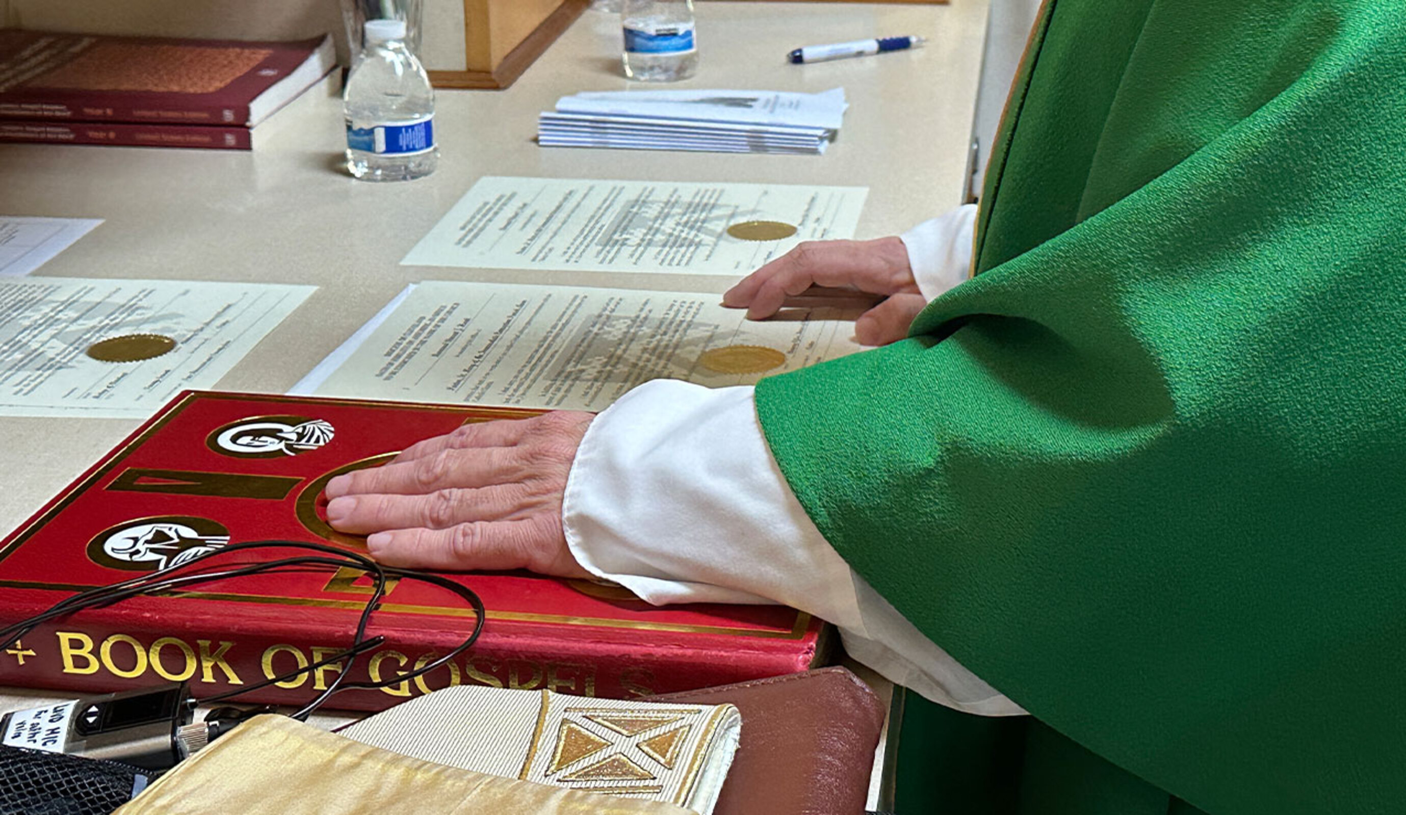 Before Mass, Father Hawk and the bishop signed the documents making his role as pastor official. He led the congregation in the profession of faith and greeted members of the parish staff, finance and pastoral councils and agreed to listen to their counsel and advice as he leads the parish community.