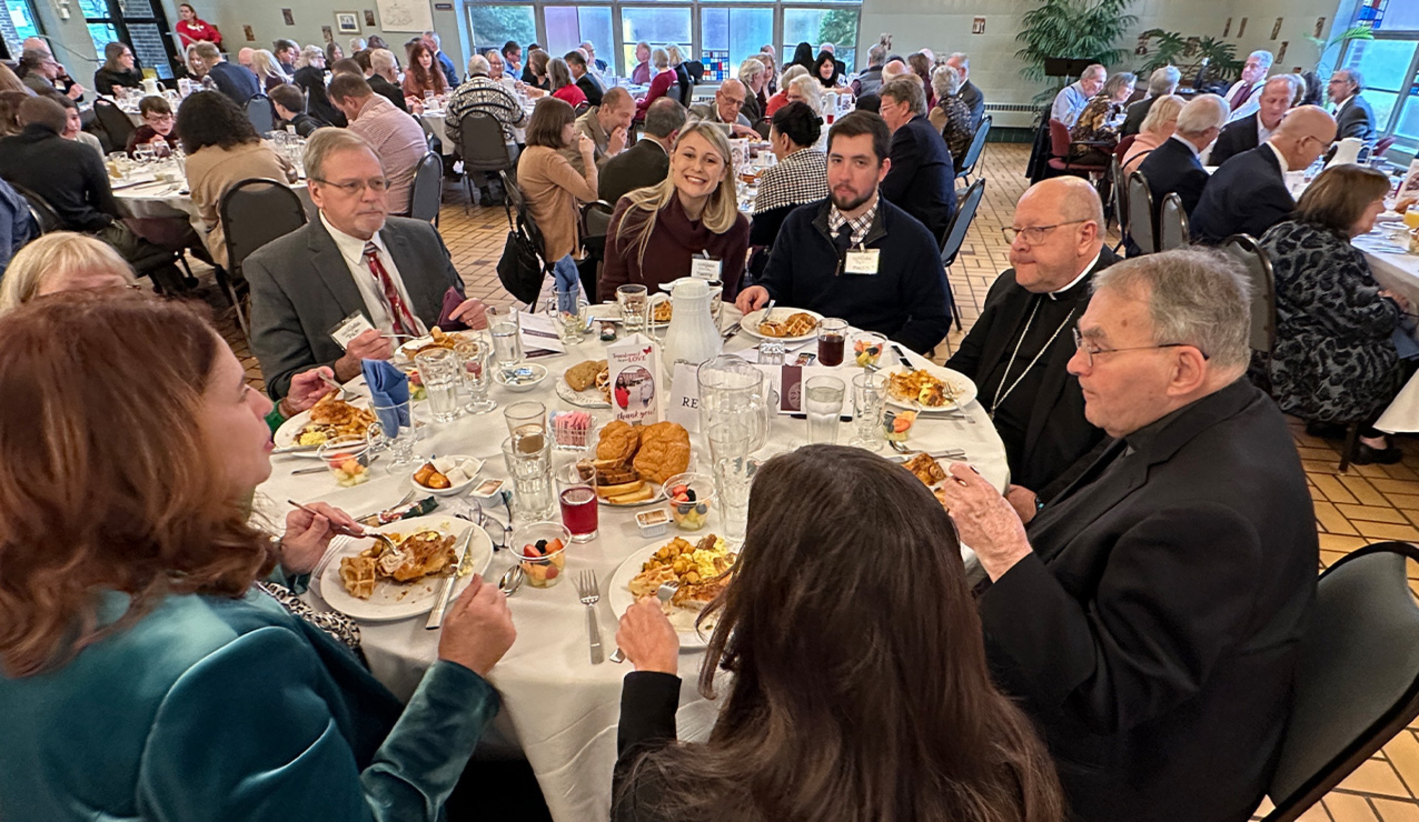 After Mass, the group moved to the Founder’s Room for brunch and the program. Megan Kim, chair of the Catholic Charities Board of Directors, welcomed attendees. Father Turner also welcomed and thanked attendees for their generosity before offering grace.