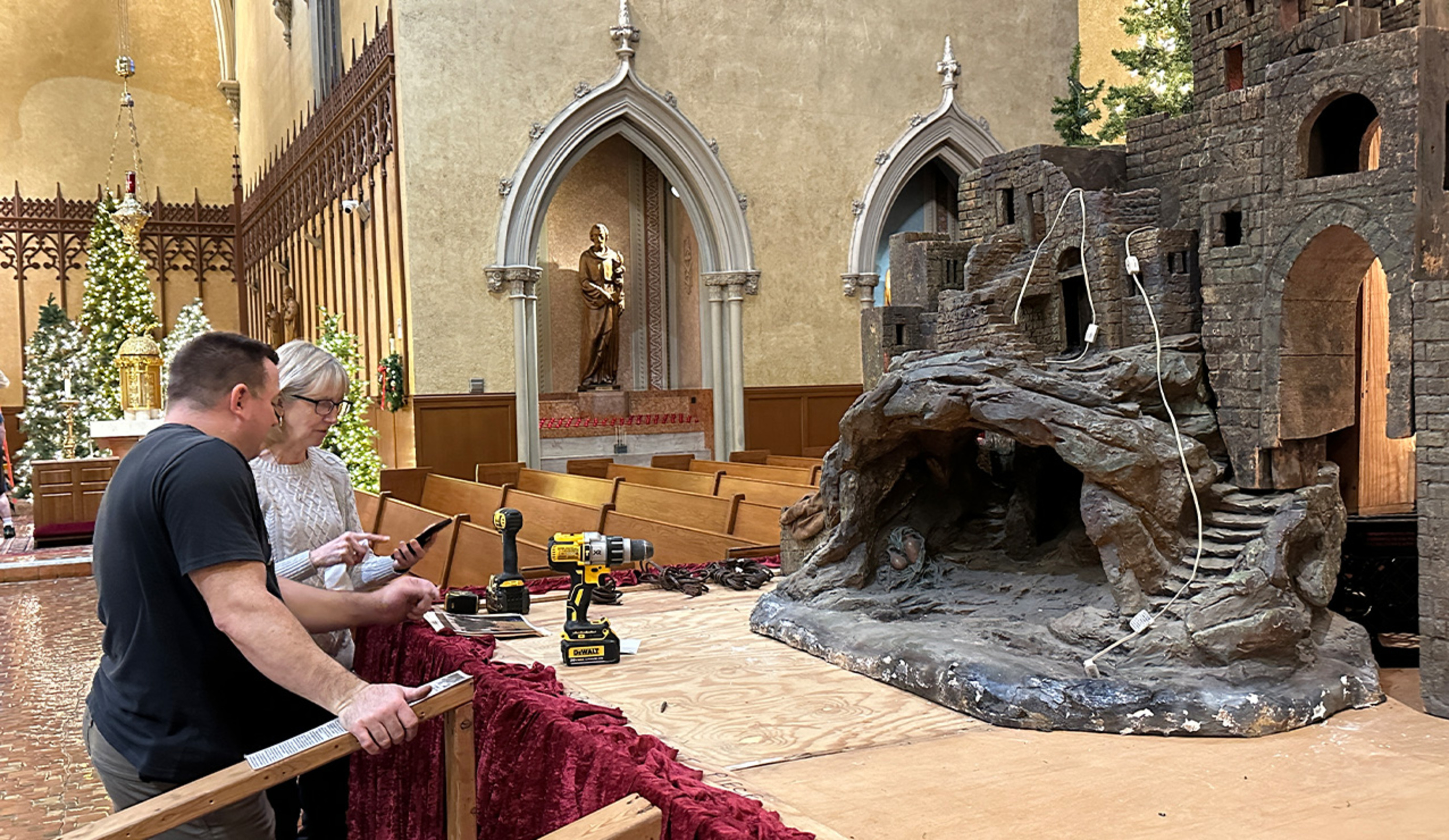Father Sean Ralph, cathedral rector, guided volunteers as they carefully placed the figures around the elaborate setting that was created to resemble what Bethlehem would have looked like at the time of Jesus’ birth.