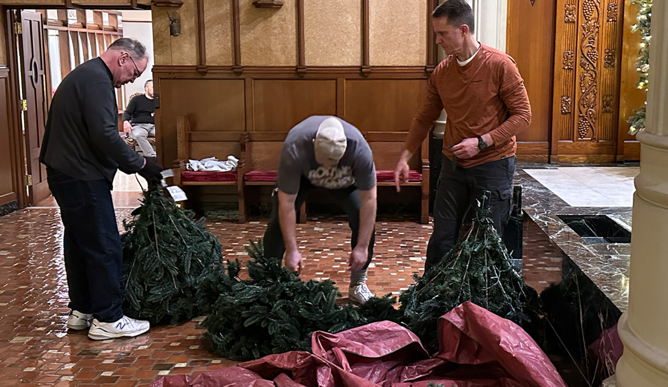 Over about a four-hour period on Dec. 14, the group hauled trees and decorations from the cathedral basement into the church, unpacked them and got to work. About two dozen Christmas trees of varying sizes were placed around the sanctuary, in the back and lobby of the cathedral. Wreaths were hung from the candles along the church walls. Additional miniature white lights were added to some of the trees to replace burned-out bulbs.
