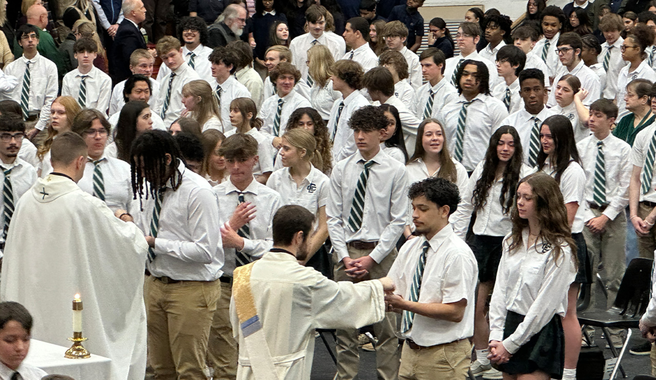Celebrant was Father Eric Garris, diocesan vocation director. Assisting was Deacon Jeffrey Lindholm. A group of enthusiastic EC musicians and vocalists led attendees in song throughout the liturgy. Attendees could follow along with the lyrics that were posted on a large screen.