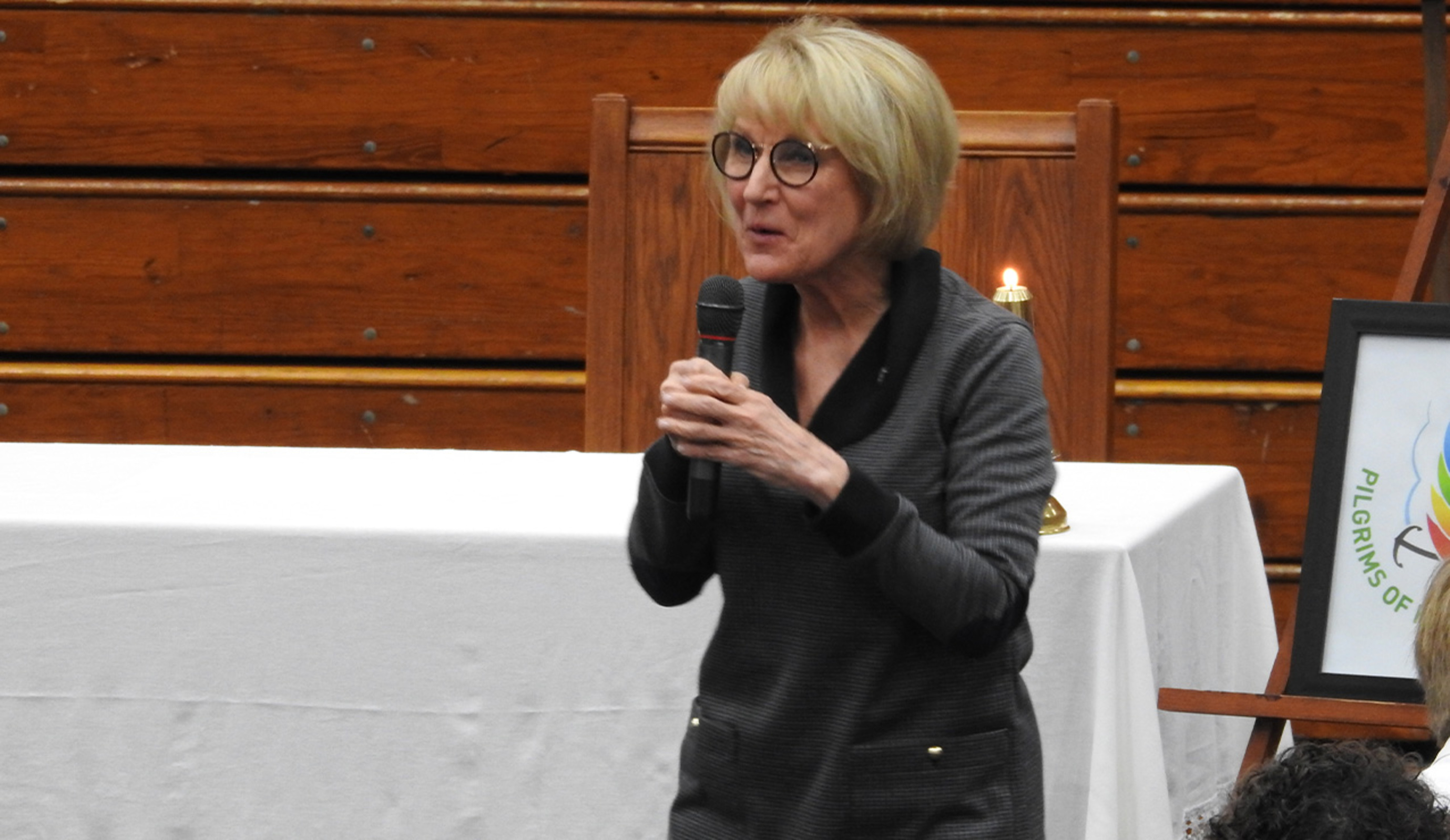Before Mass, Annie Heidersbach, EC president, welcomed the visitors. She pointed out the new, dark blue carpeting covering the new floor in the gym. The carpeting was purchased with assistance from several generous donors, she added. It helps protect the floor from damage that could be caused by the chairs used for Mass and other events in the Coliseum.