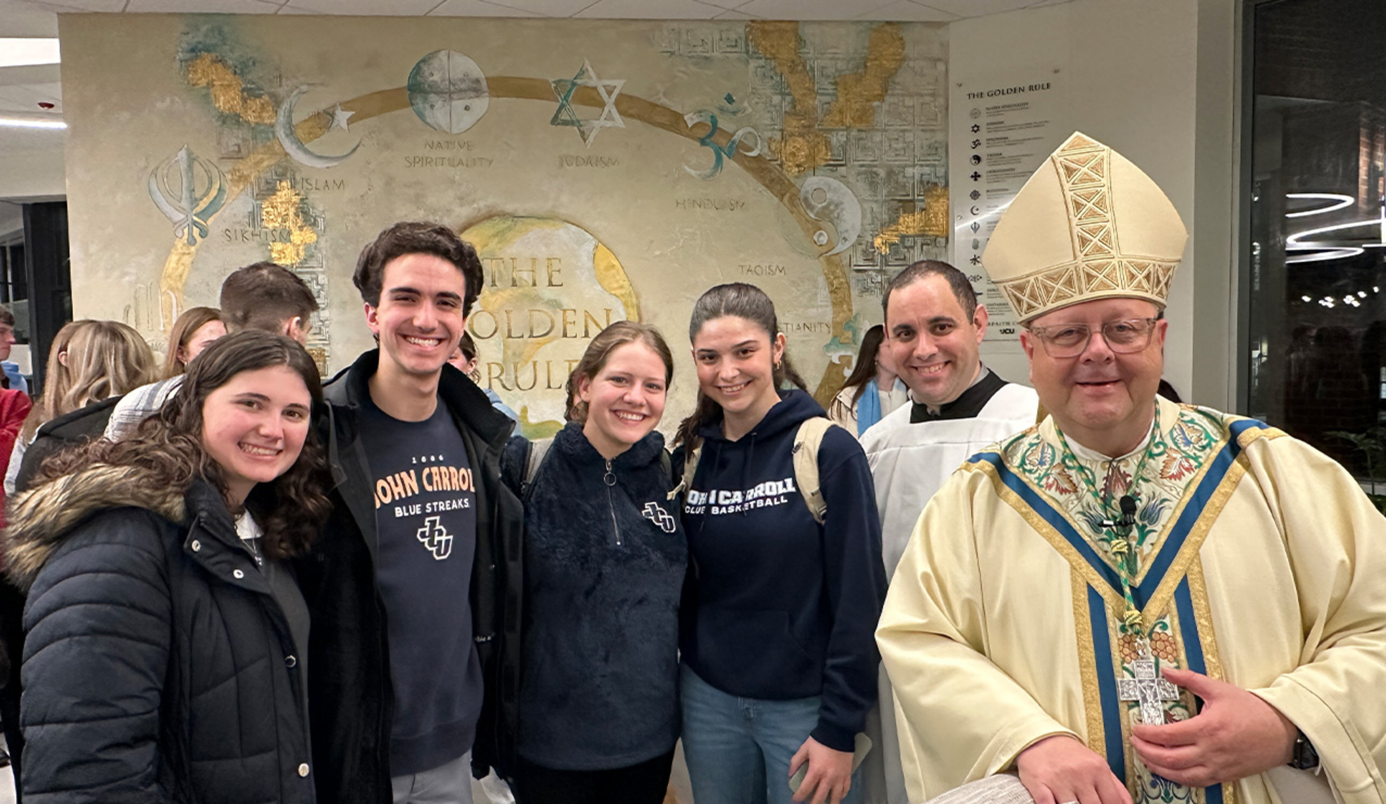 After Mass, the bishop greeted students and mingled with them at a reception.