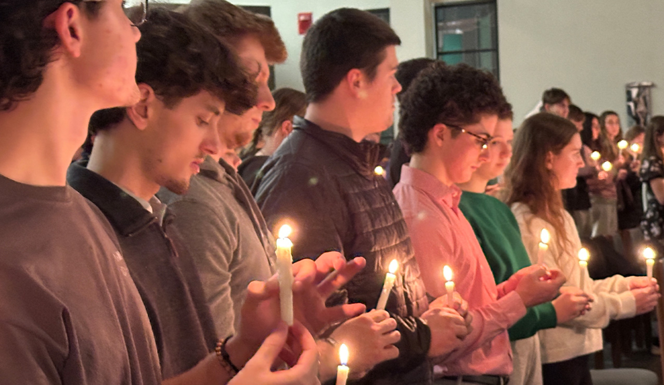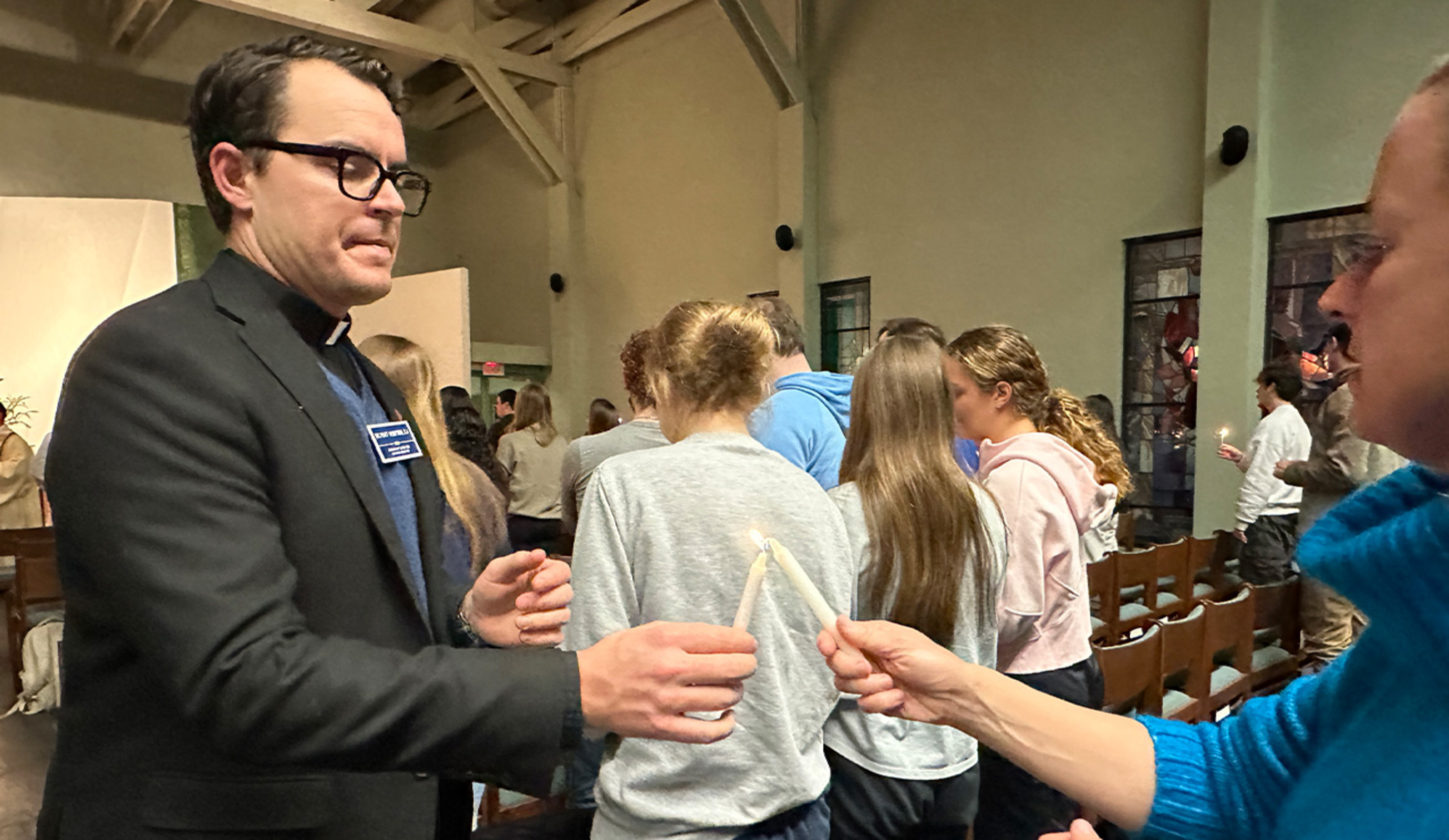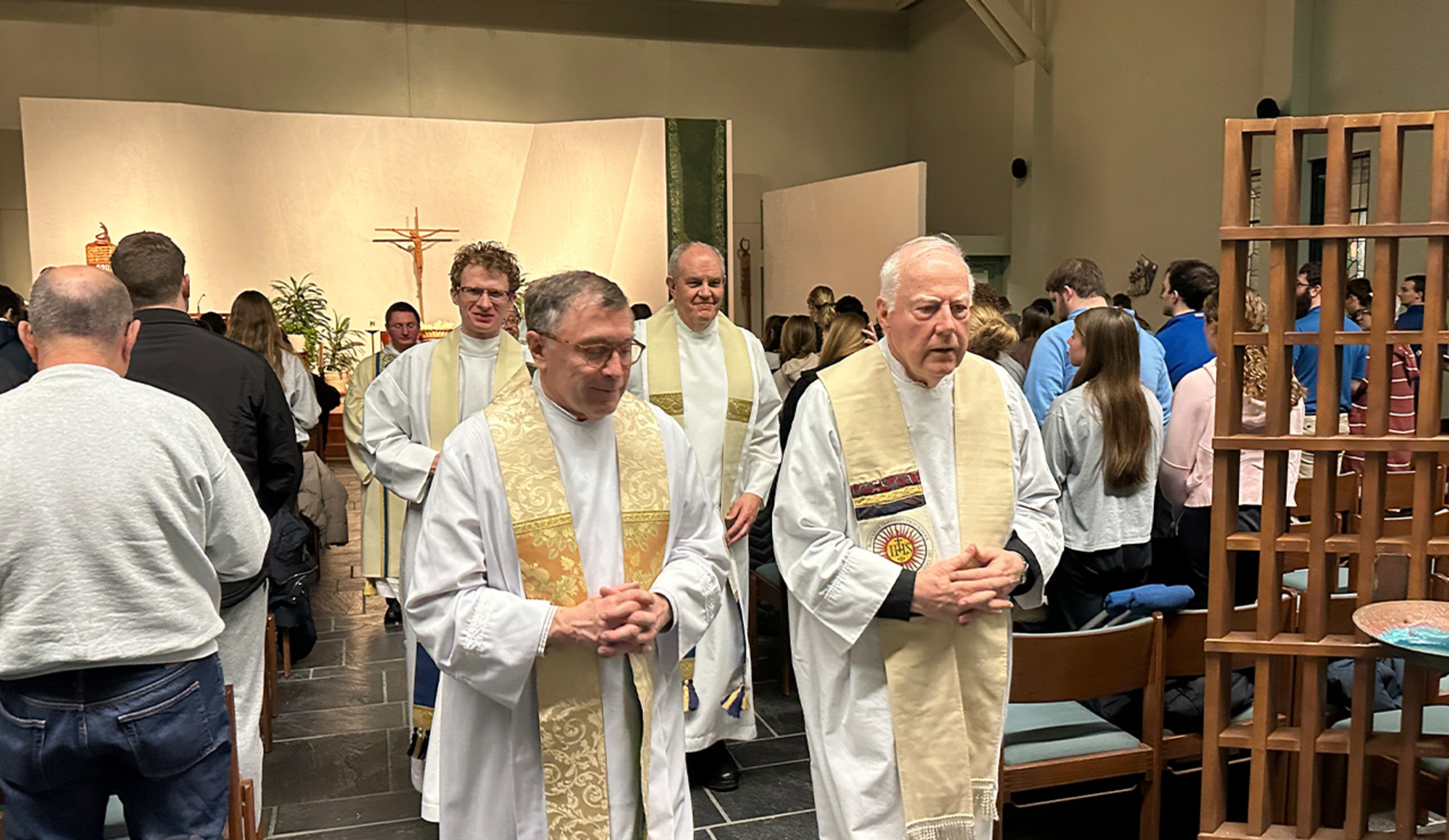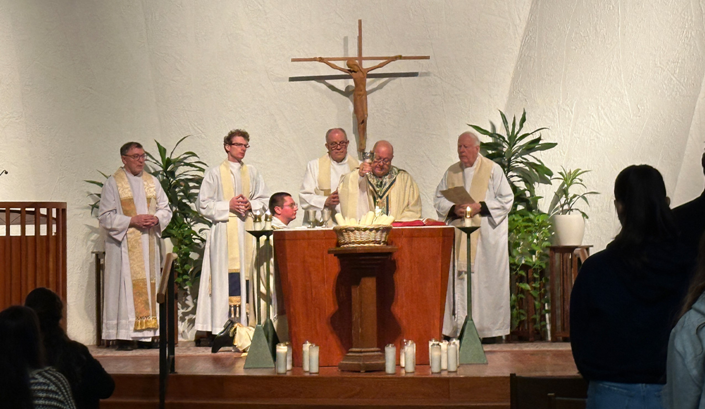 Several members of the Jesuit community concelebrated the Feb. 2 liturgy, which marked the feast of the Presentation of the Lord and Candlemas. The faithful received candles as they entered the chapel. The candles were blessed and lit during the liturgy.