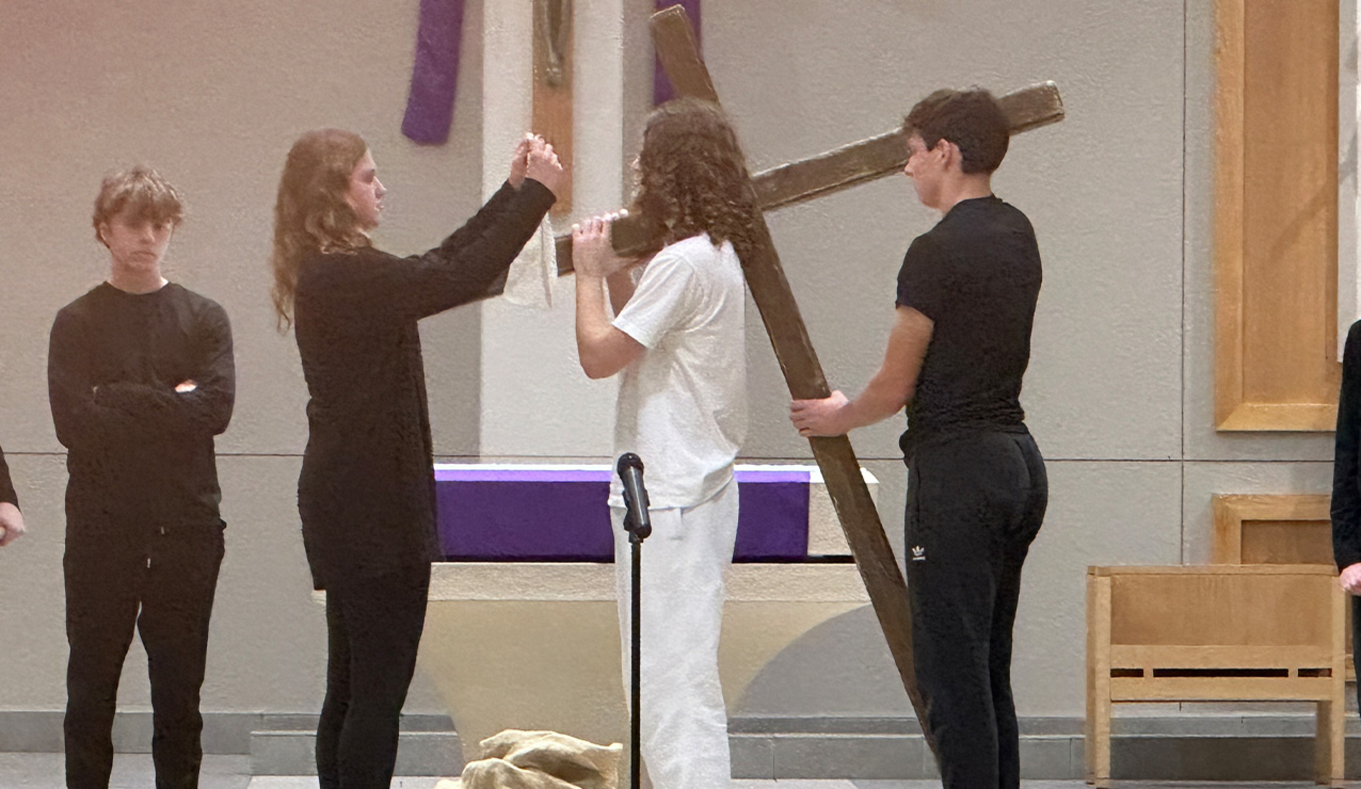 Sara Lanzola, EC director of campus ministry, said the script has been essentially unchanged throughout the years. Fifteen seniors are featured in this year’s cast: Trevor McMahon (Jesus); Courtney Hoplard and Dakota Jones (Mary); Mark Boehm (Simon); Kayla Linden (Veronica); Andrew Post (Peter); Christian Soltis (Pilate); Brace Dillinger (Guard 1); Natalia Dyson (Guard 2); Avery Collins (Guard 3); Connor Soltis (Guard 4); Veronica Duffy (Woman 1); Nicole DeLuca (Woman 2) and Maegen Kundrik and Macie Wakefield (Narrators).