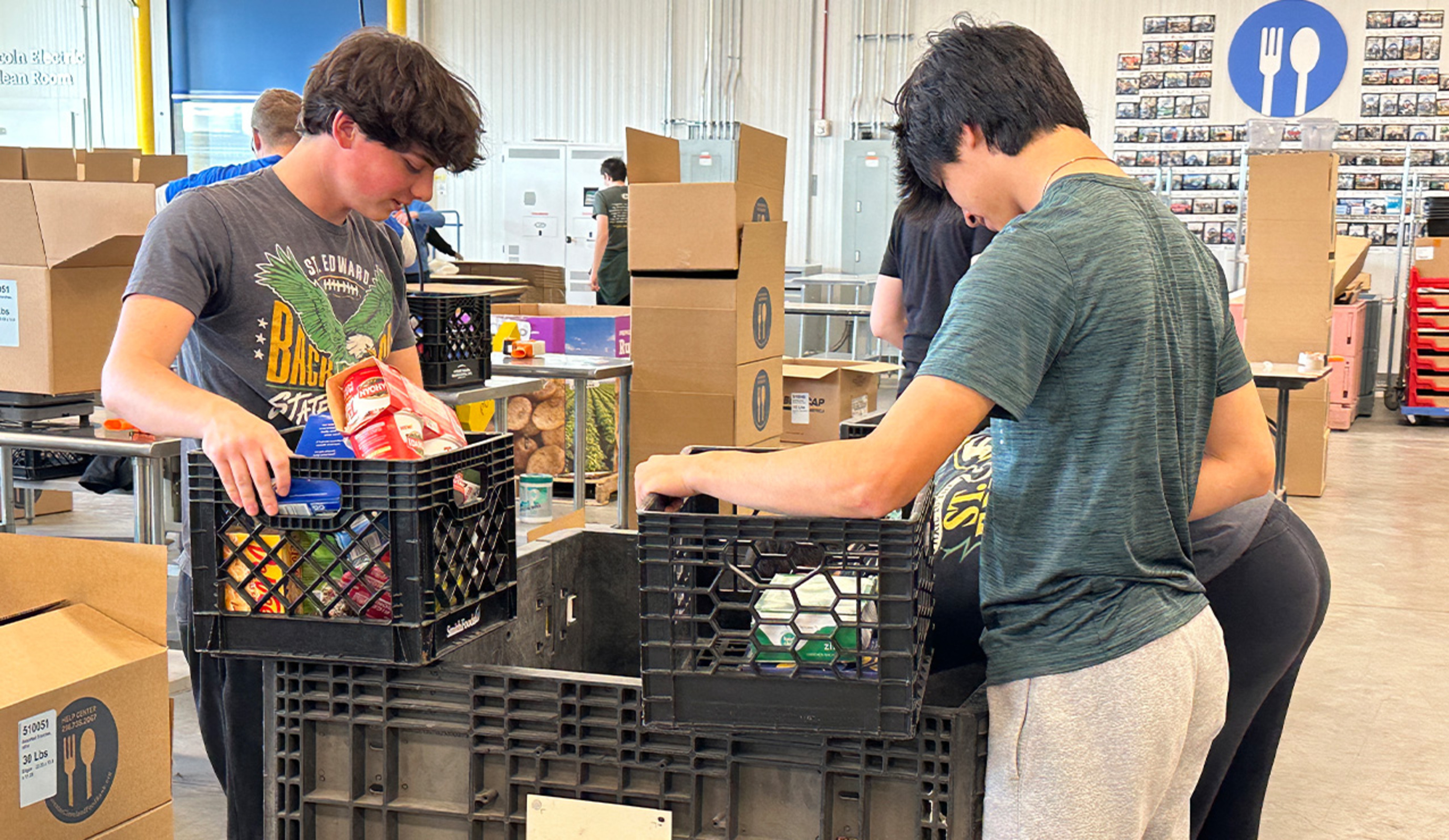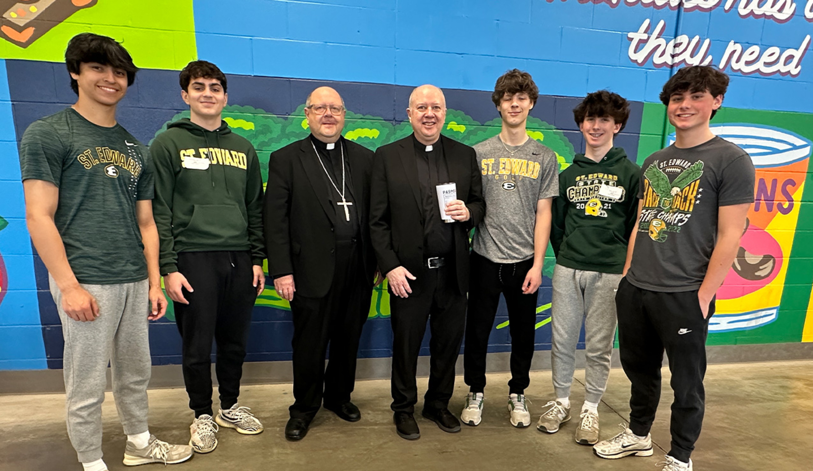 The bishop greeted a group of volunteers from St. Edward High School in Lakewood who were among the volunteers assisting at the Food Bank during his April 4 visit. He chatted with the students and posed for photos before they returned to their duties sorting and packaging nonperishable food items.