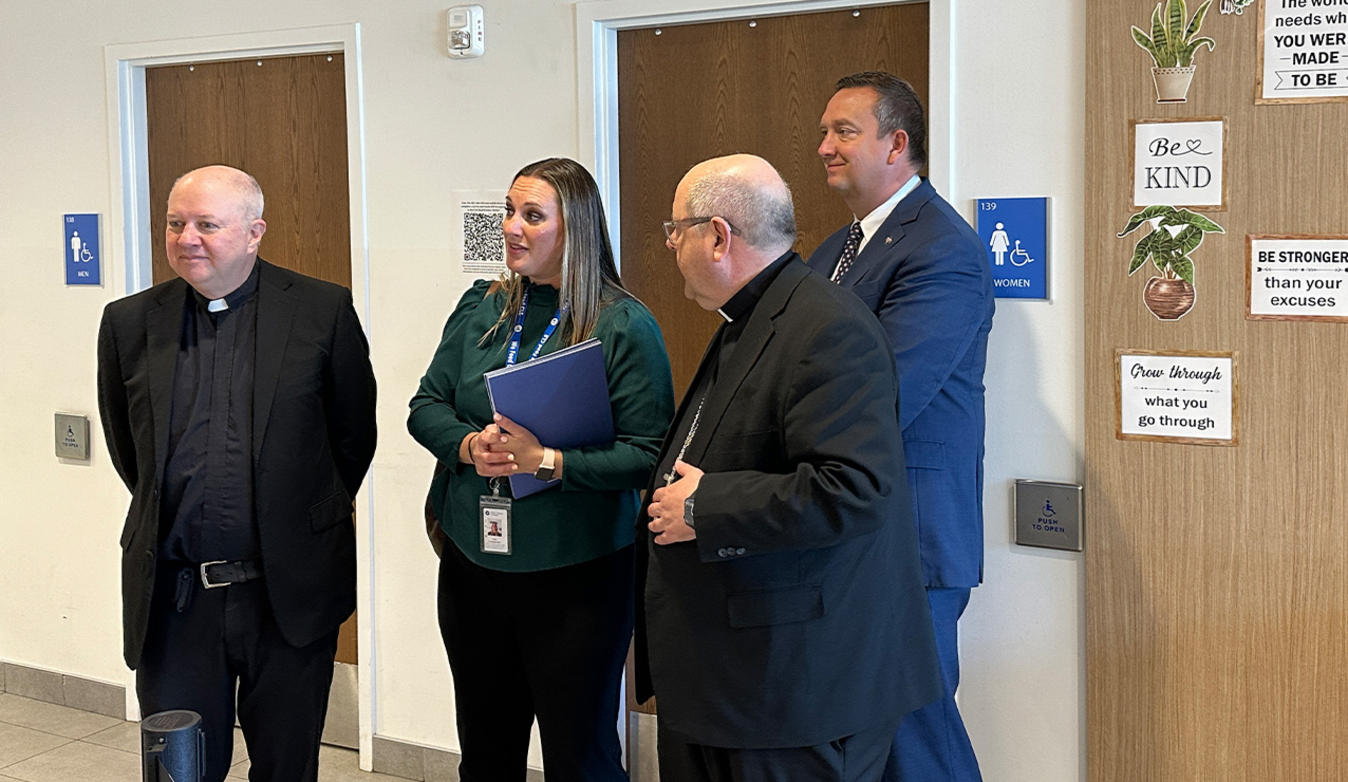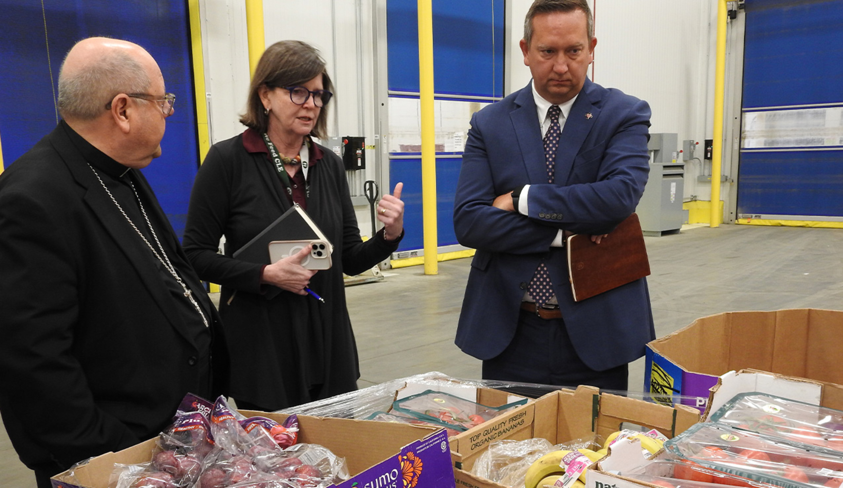 Kristin Warzocha, Food Bank president and CEO since 2000, and Jessica Morgan, chief programs officer and a member of the Food Bank leadership team since 2012, guided the bishop, Jim Mullen, president and CEO of Catholic Charities, Diocese of Cleveland, and Father Dan Schlegel, pastor of St. Raphael Parish in Bay Village, through the Food Bank’s Partner Distribution Hub on Coit Road and its nearby Community Resource Center on South Waterloo Road, both in Cleveland.