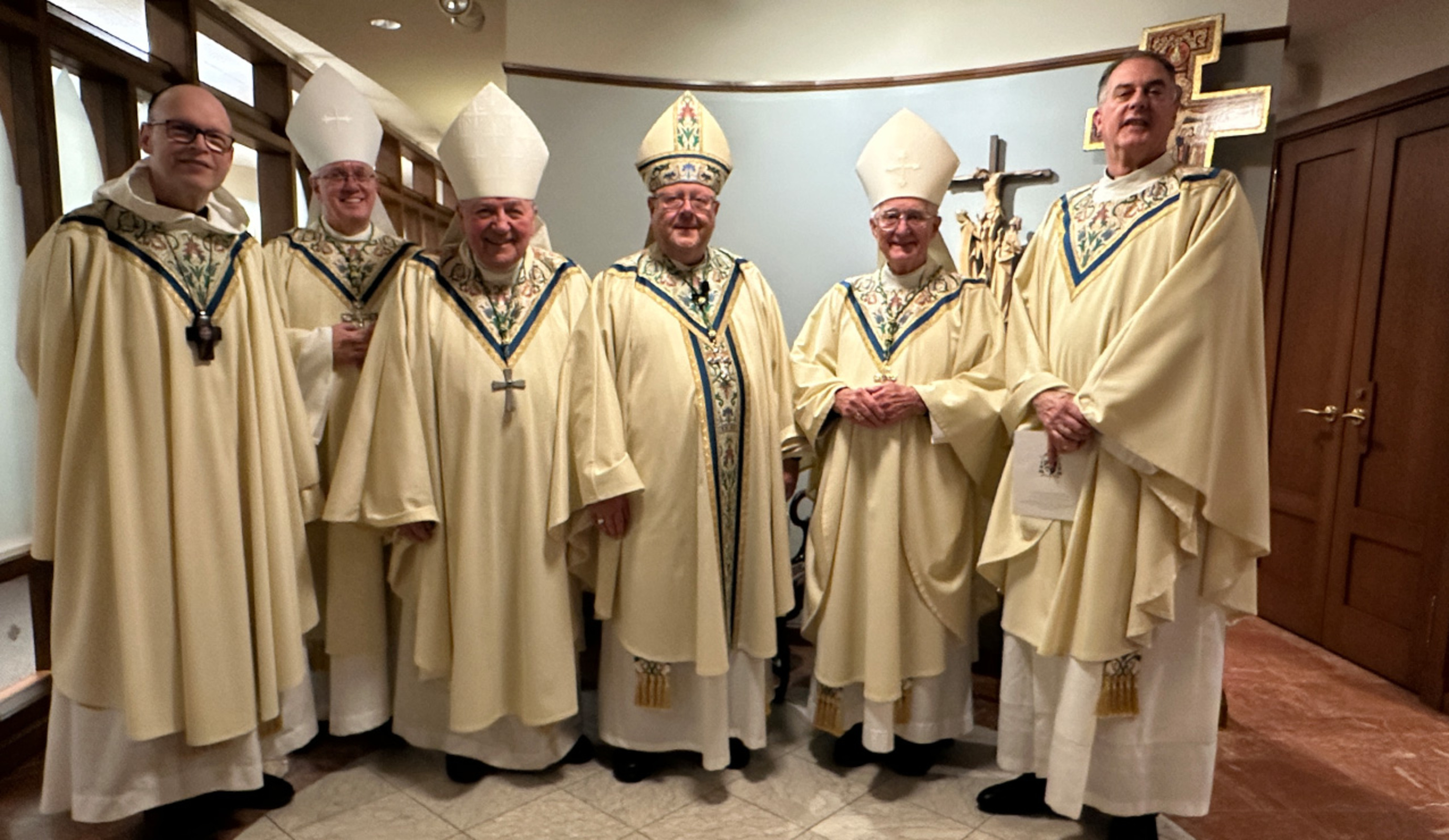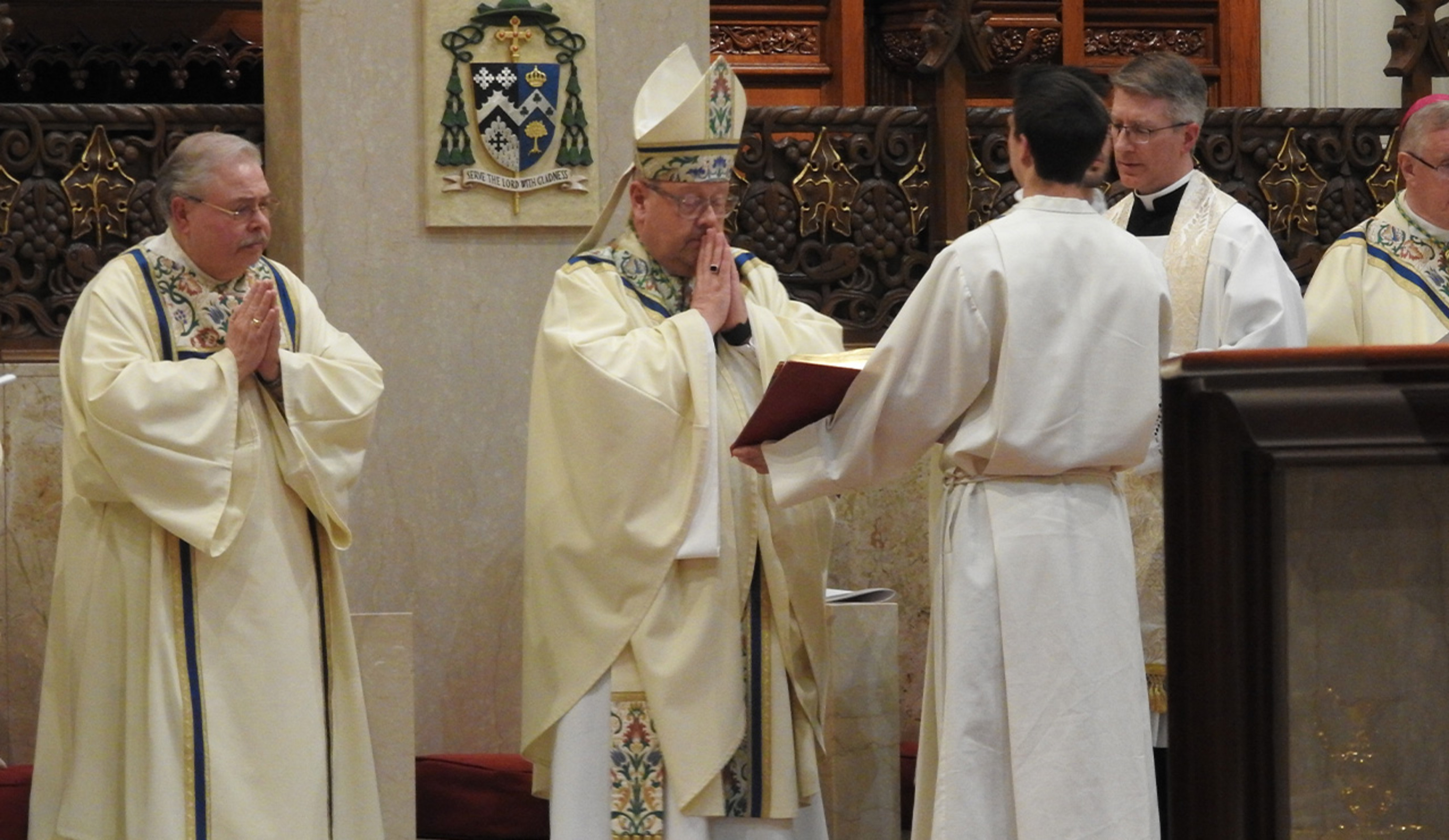 Hundreds of priests and deacons attended the Mass, including six newly ordained transitional deacons, eight transitional deacons who are anticipating priestly ordination next month, three men anticipating ordination to the permanent diaconate next month, men in diaconate formation and diocesan seminarians. Seated on the altar with the bishop were Auxiliary Bishop Michael Woost, retired Auxiliary Bishop Roger Gries, OSB, Bishop Martin Amos, retired bishop of Davenport, Iowa and diocesan vicars and deans. In addition, congregational leaders Abbot Gary Hoover, OSB and Father John Thomas Lane, SSS, were seated near the bishop.